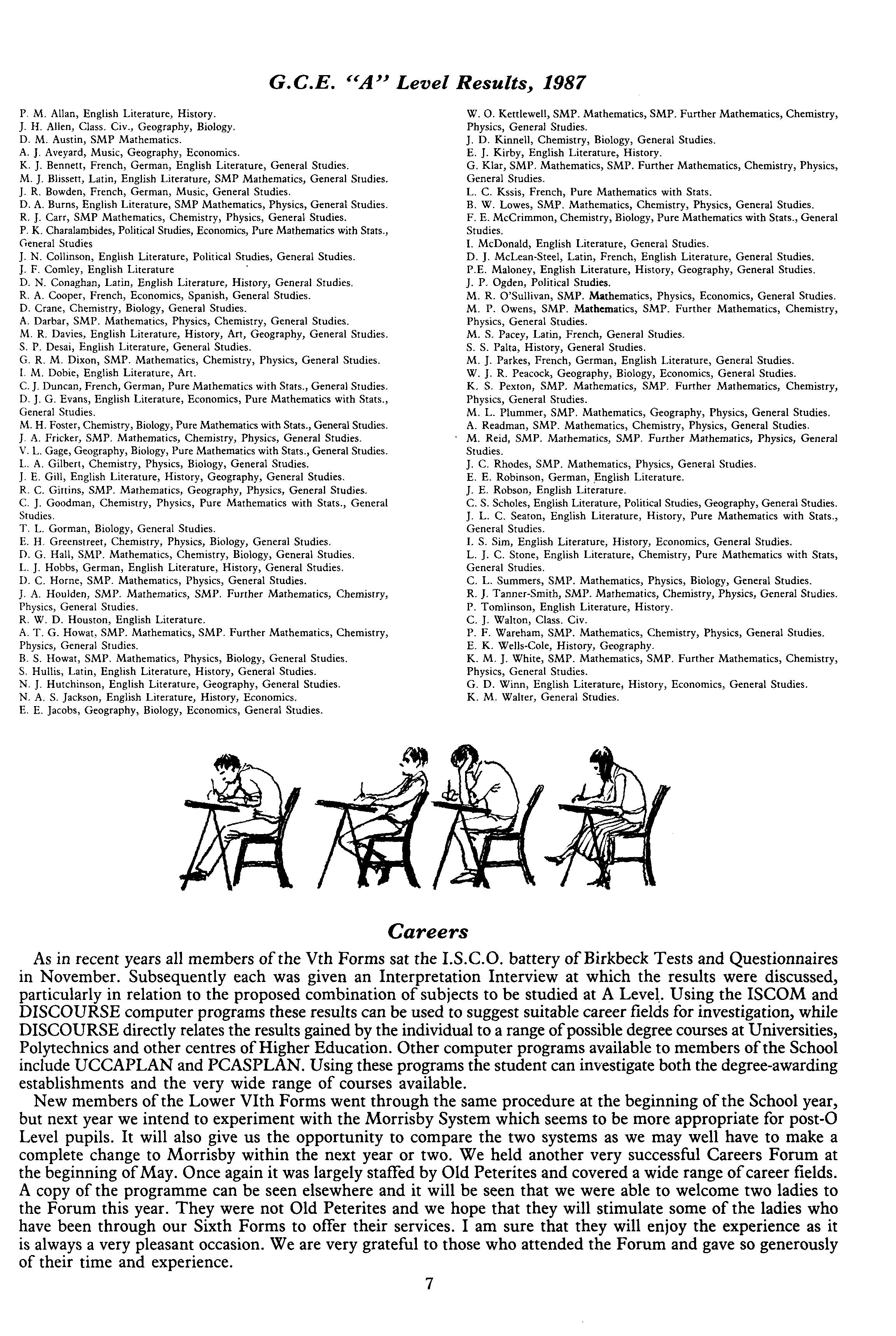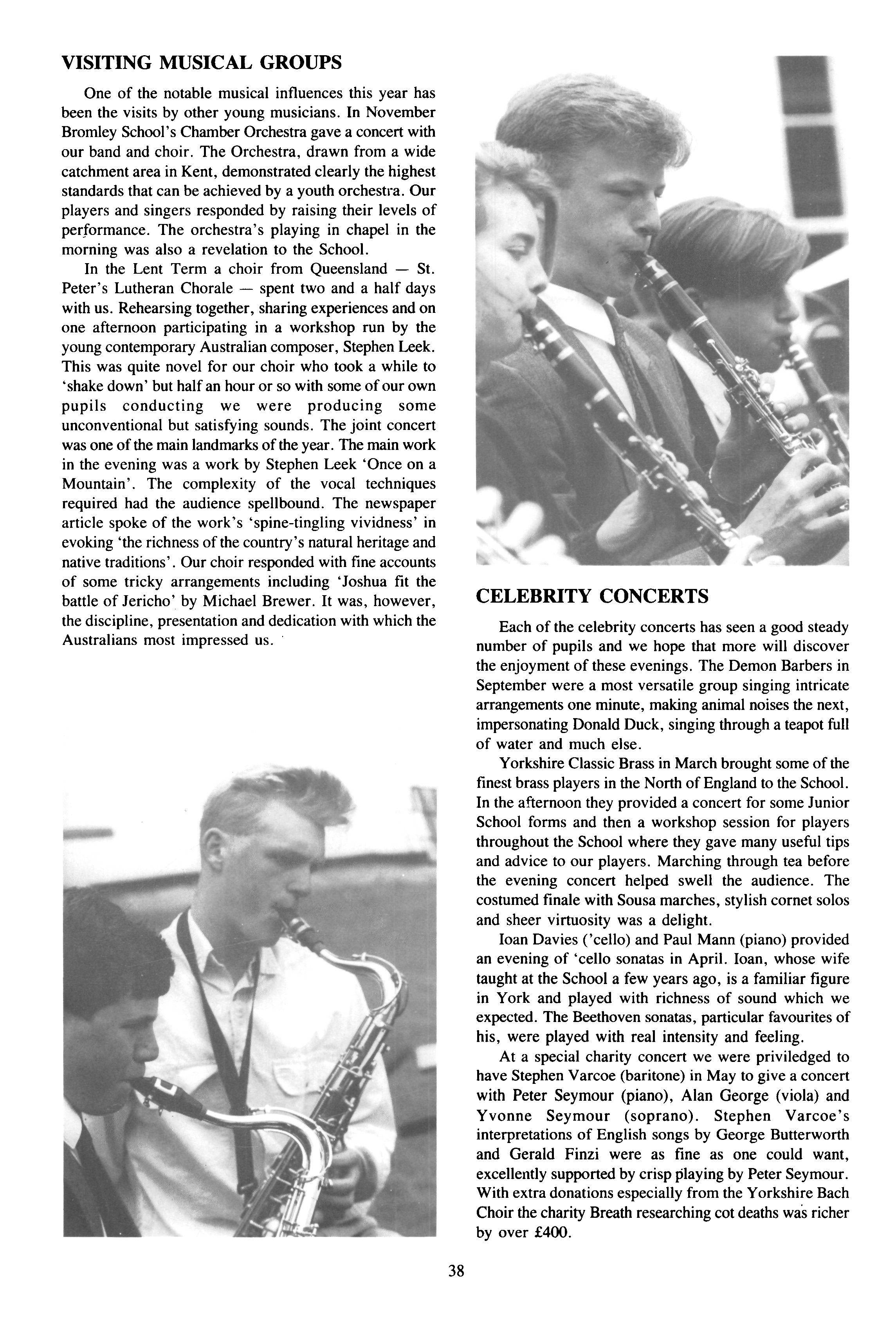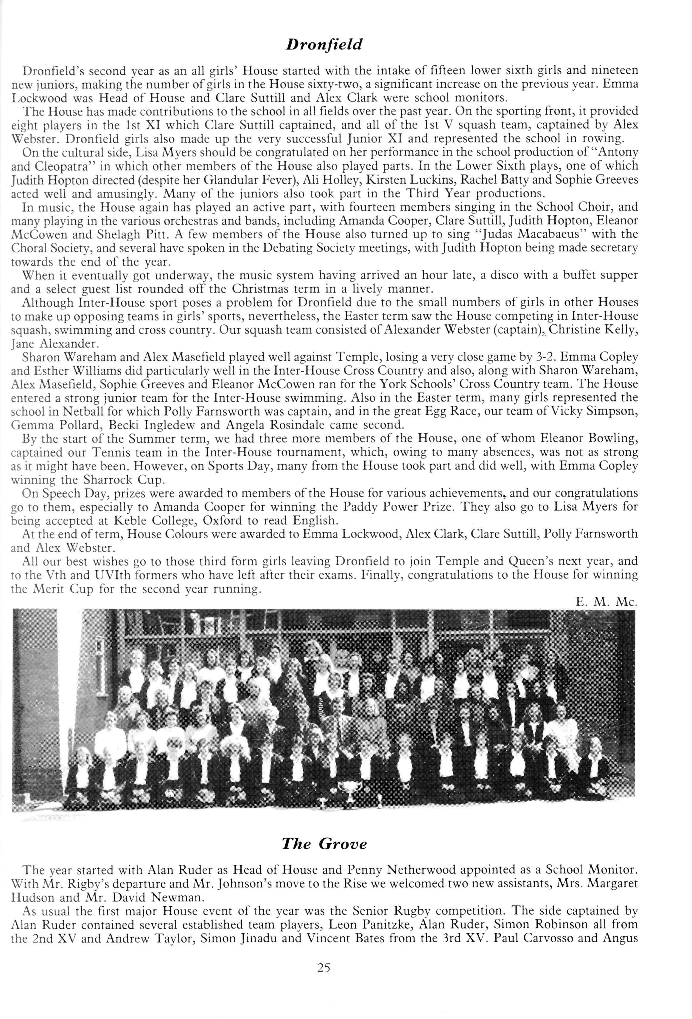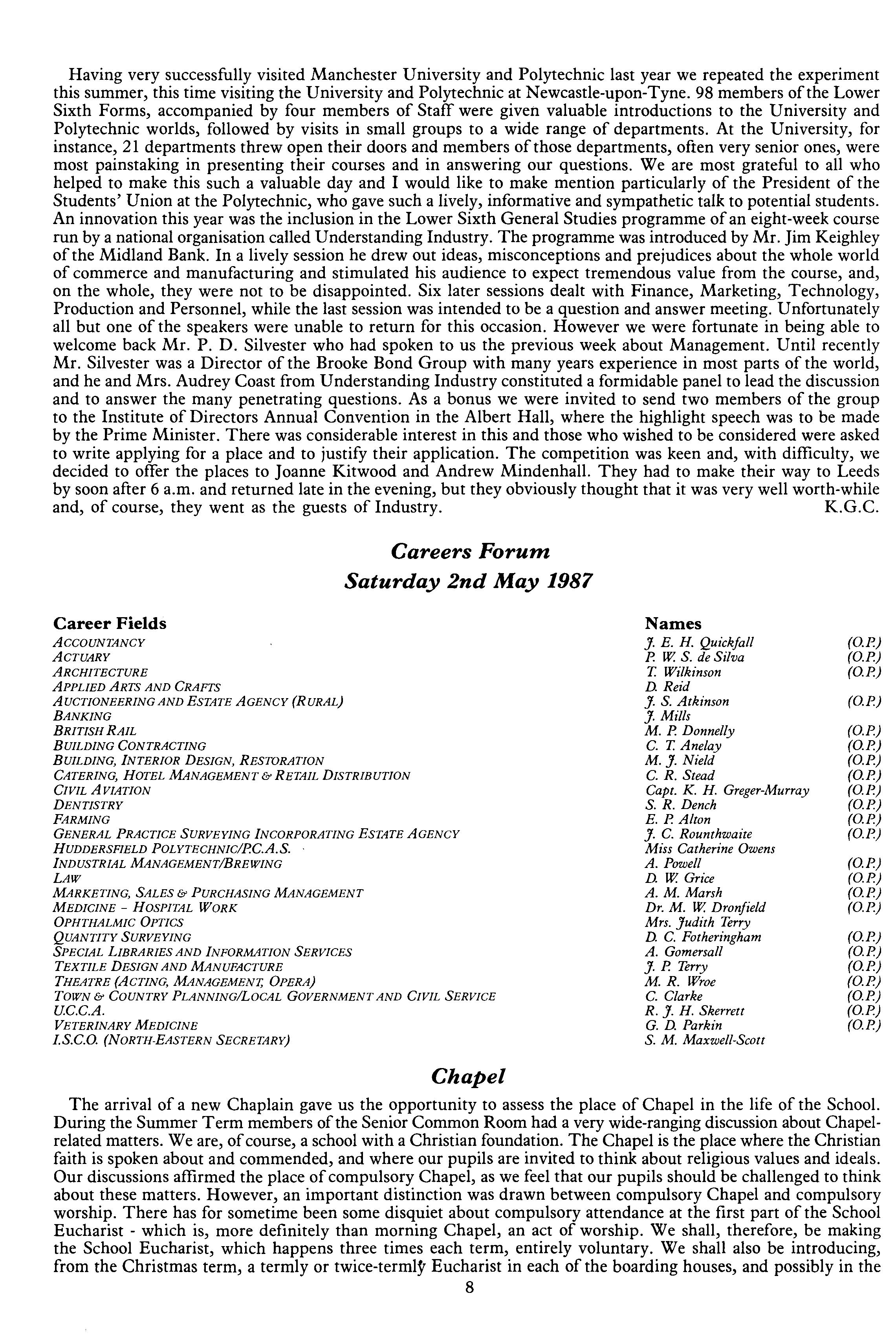 Also in the academic context I would mention some other changes for next year: amodest reform to our third year courses allowing for music and design/technology tobesampled by allour senior school entrants; and areview ofour fourth and fifth year options system in the light ofthe new demands tobemadeby G.C.S.E on our timetable