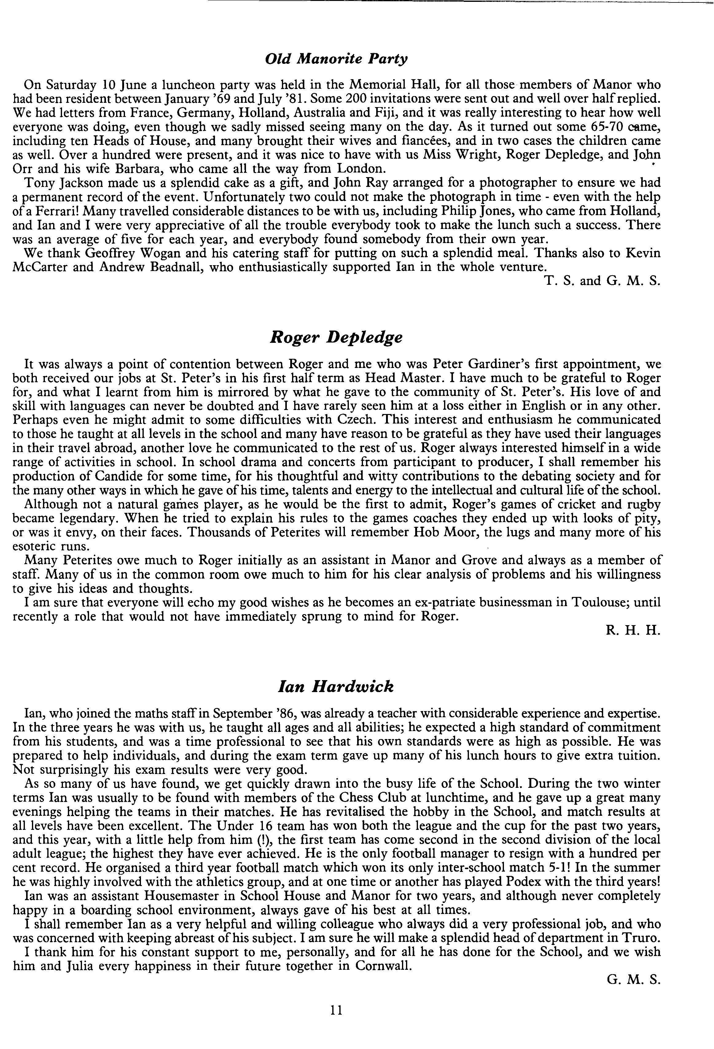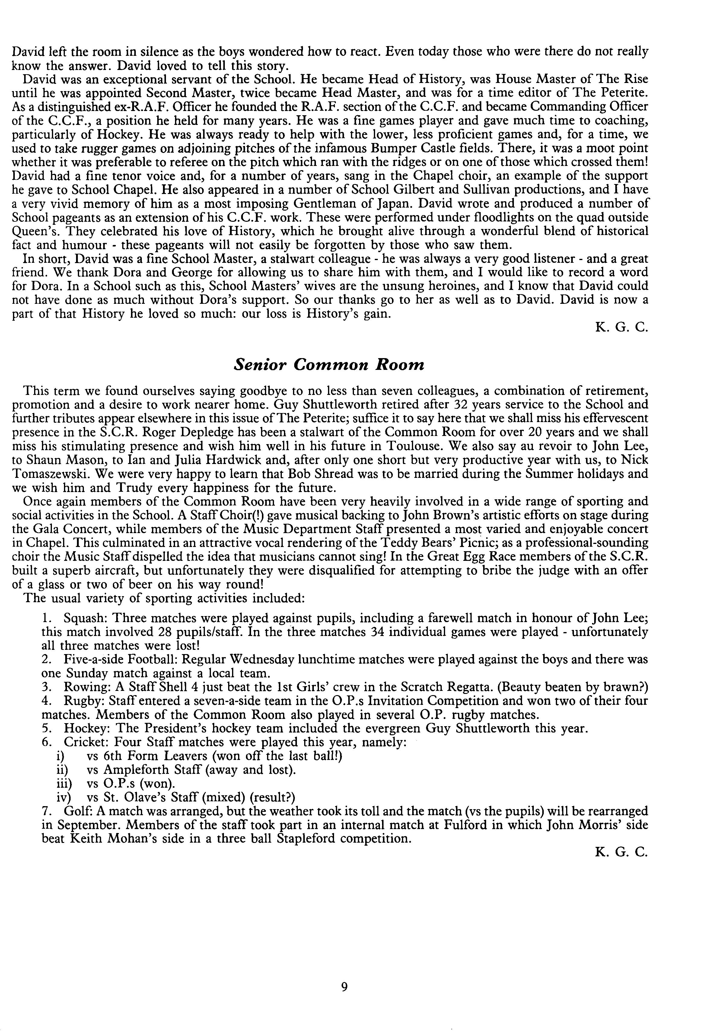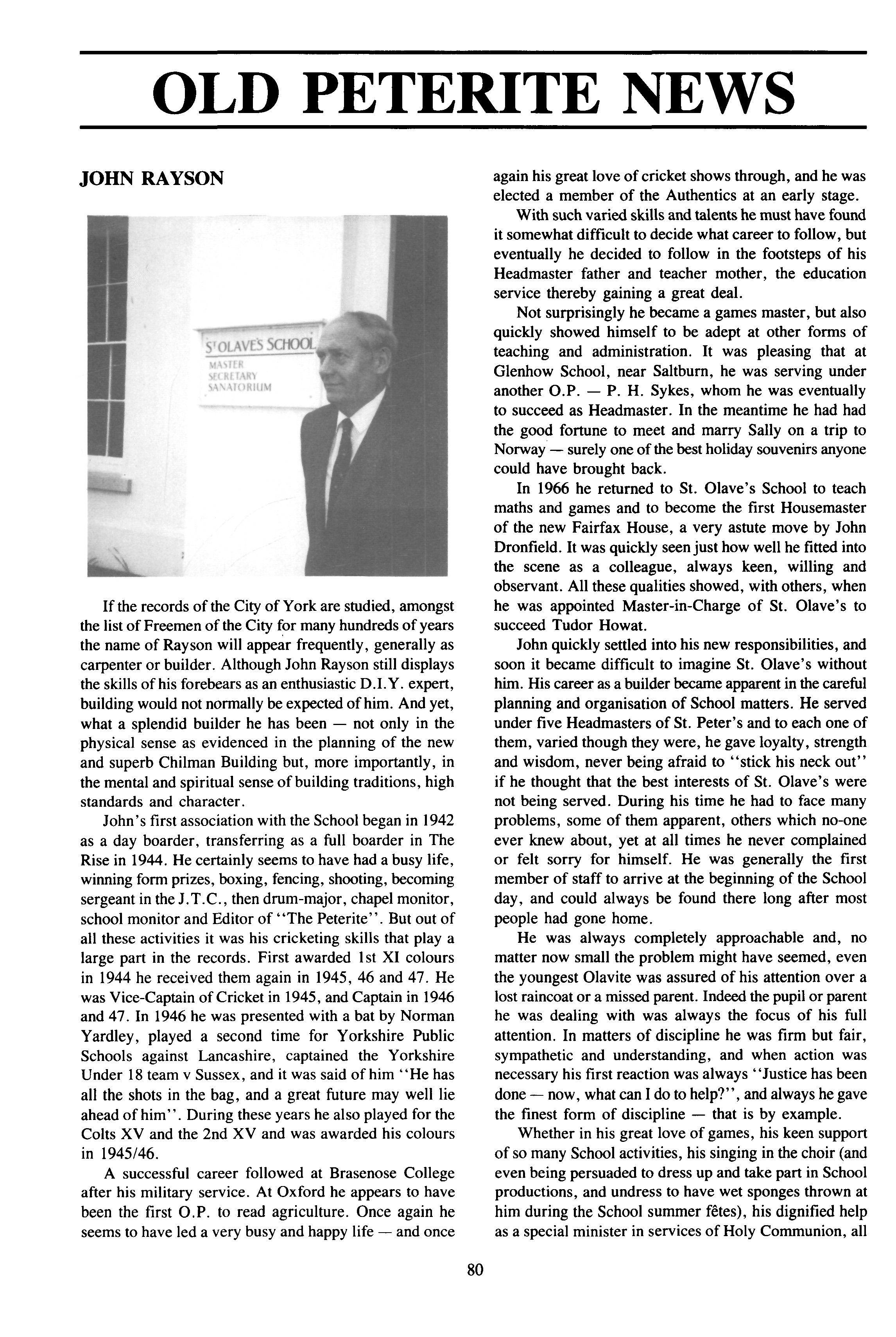 David Raggett came to St Peter's in 1976, and in the ten years he was with us he was always heavily involved in the activities of the School As my Assistant in The Manor I got to know him very well, and to appreciate fully his sterling qualities He was a caring and conscientious person on whom I could rely implicitly Incidentally it was during histime in Manor that the flat came into existence, and many ofthe ideasfor itwere his