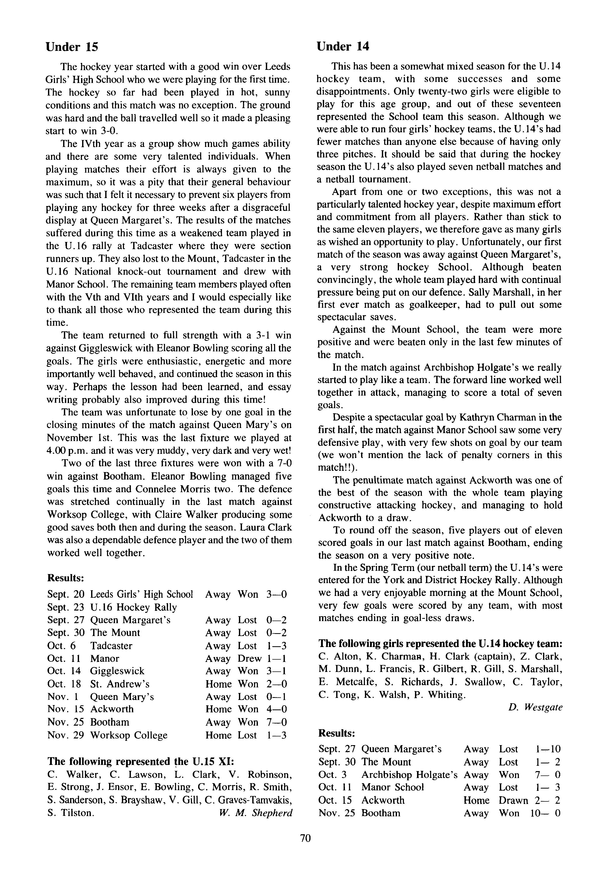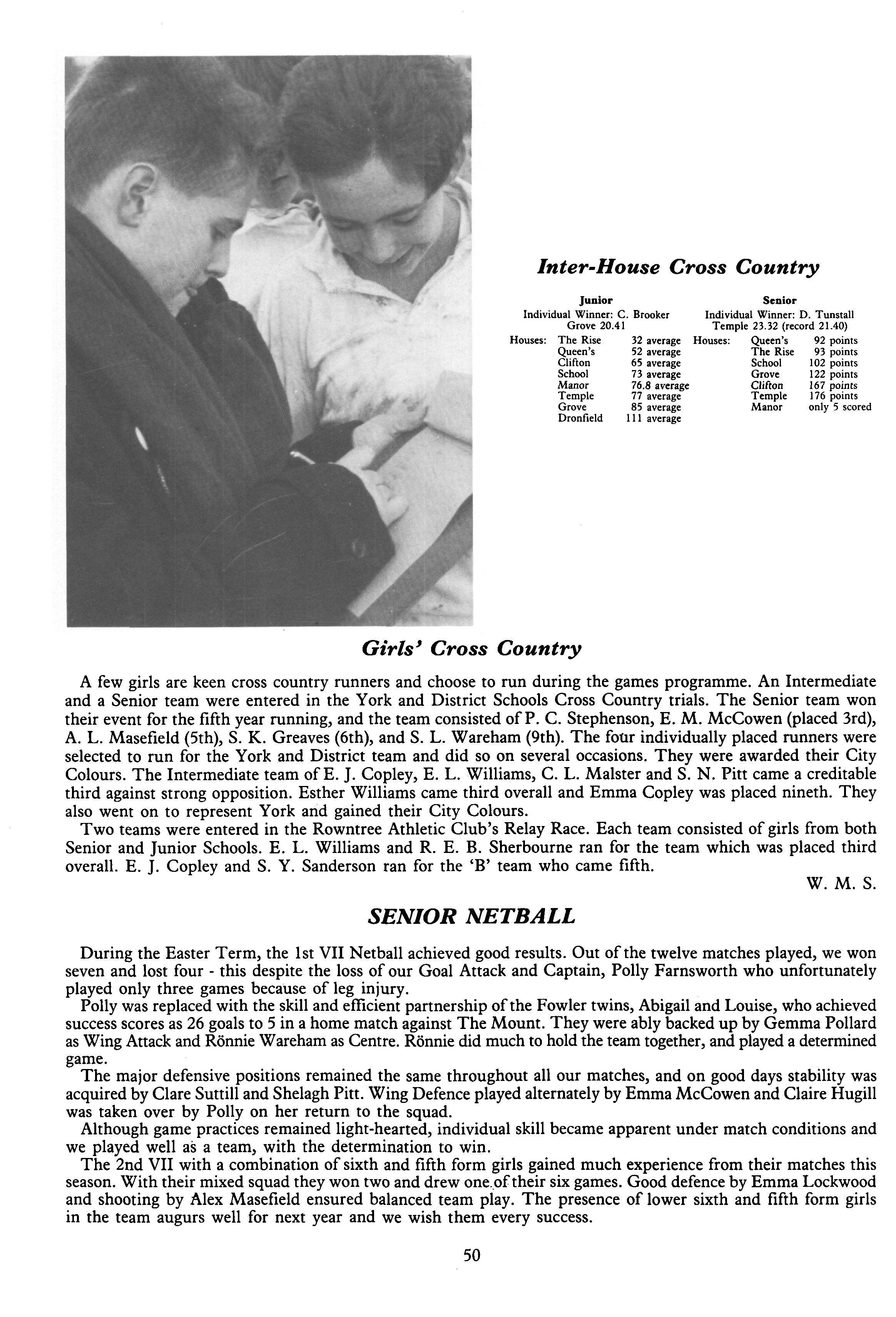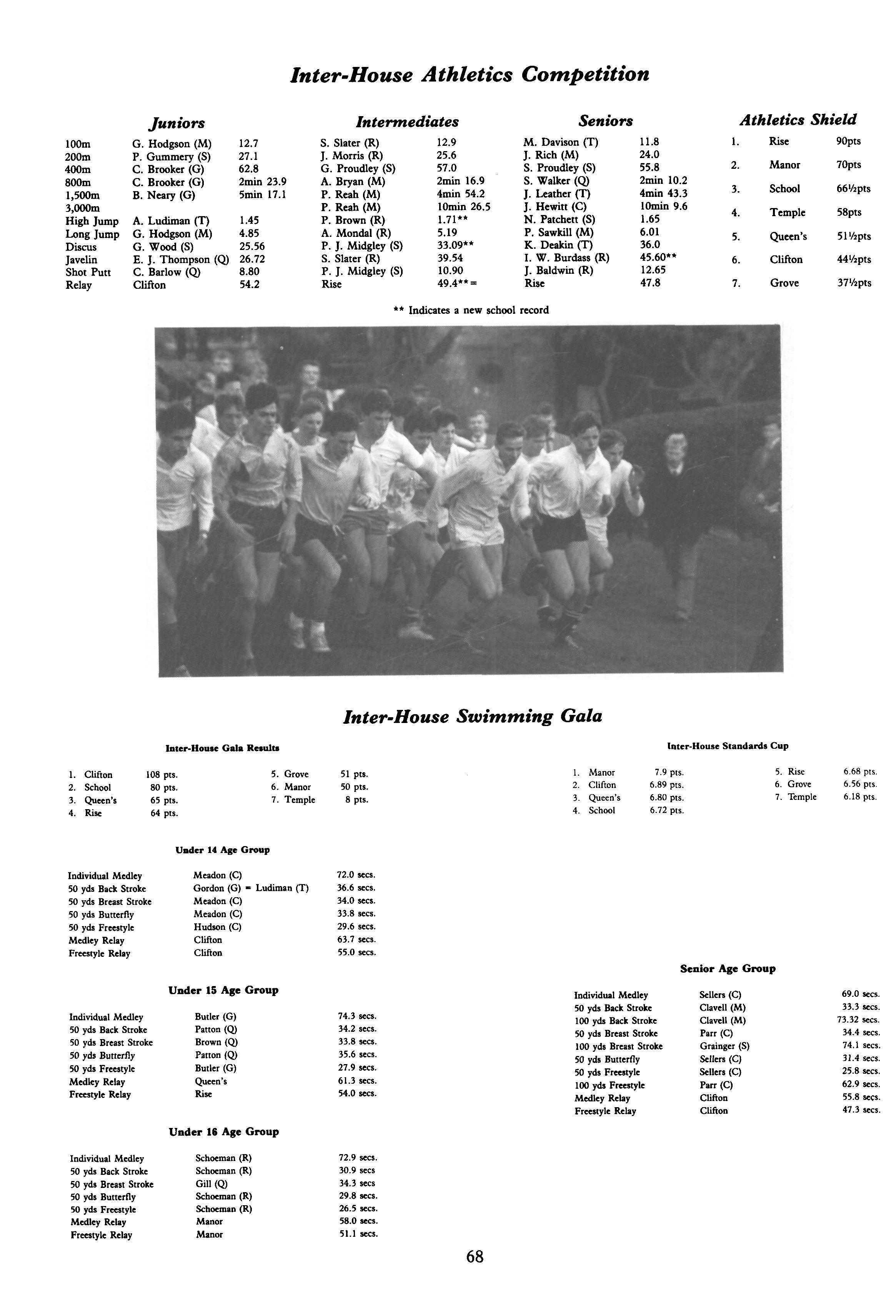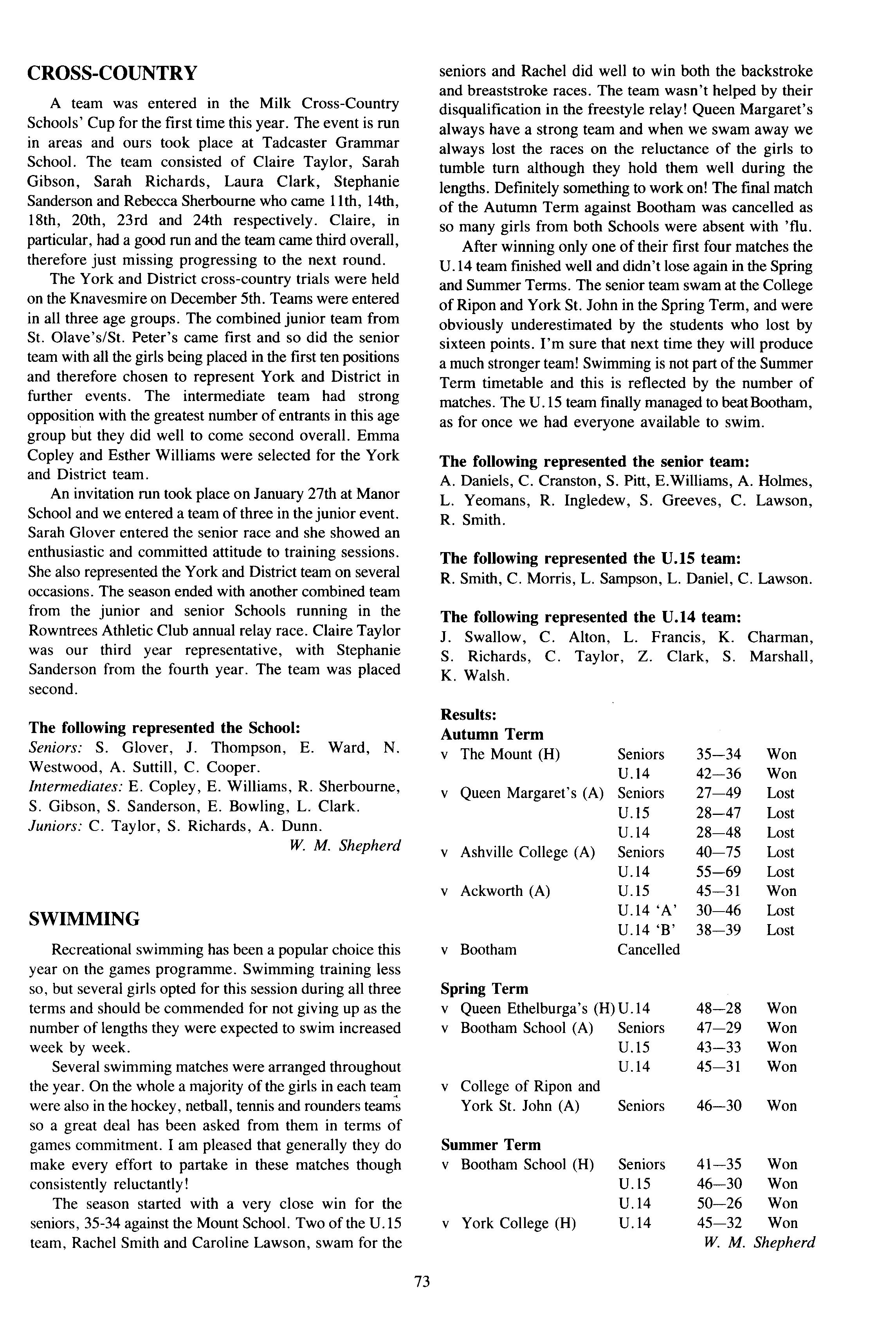 D. N. Calderhead represented England in the World Youth Fencing Championship at Stuttgart in March. Scholarships at 13+ were awarded to J. M. L. Ayers, J. J. M. Blewitt, A. G. Curtis, A. P. N. Dunn, R. M. Macleod, M. W. E. Sumpton and M. J. G. Williams, at 16+ to P. S. Bond, N. P. Durham, Jacqueline L. Grace, Marianne Klar and RebeccaJ. Sharrock.