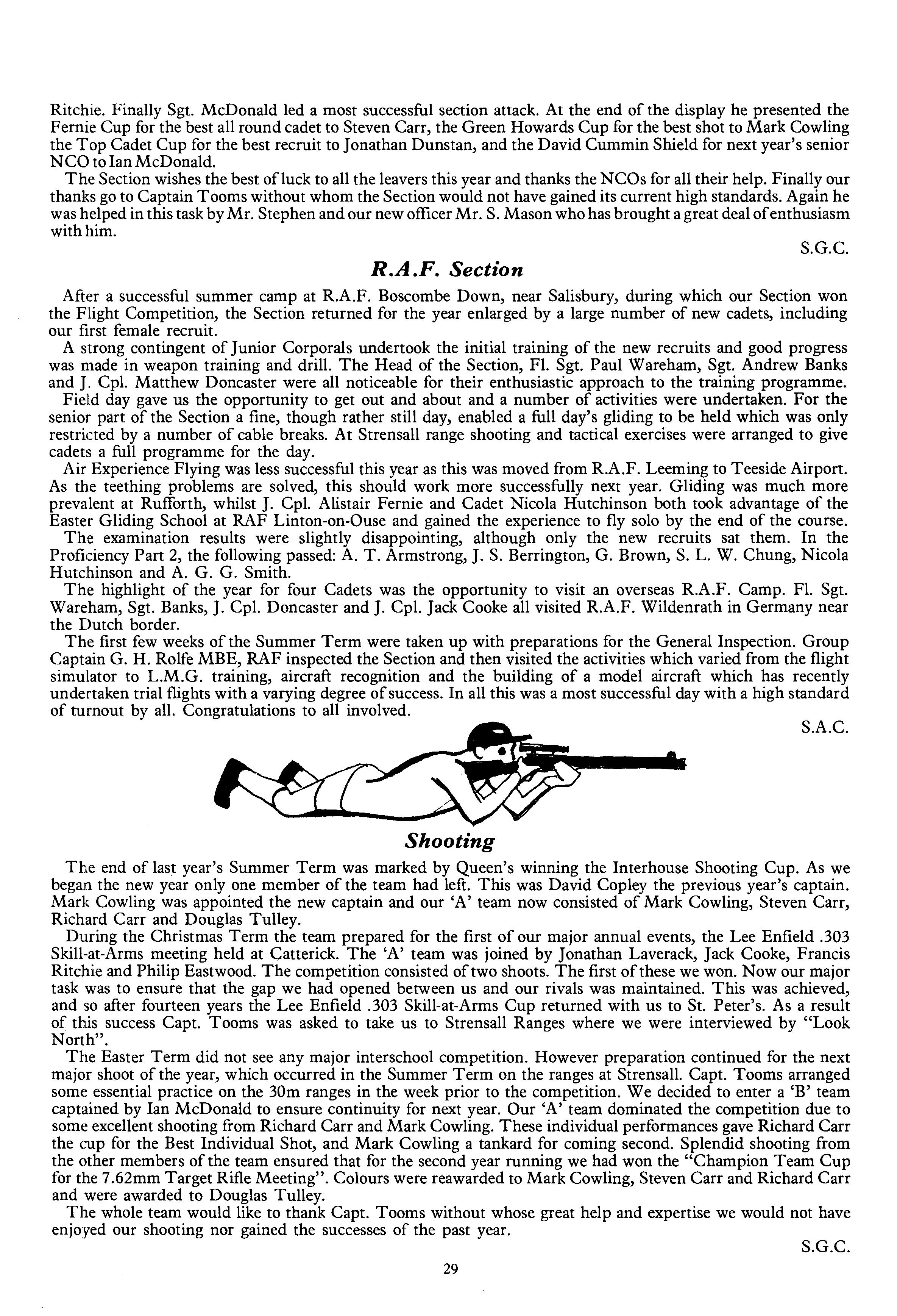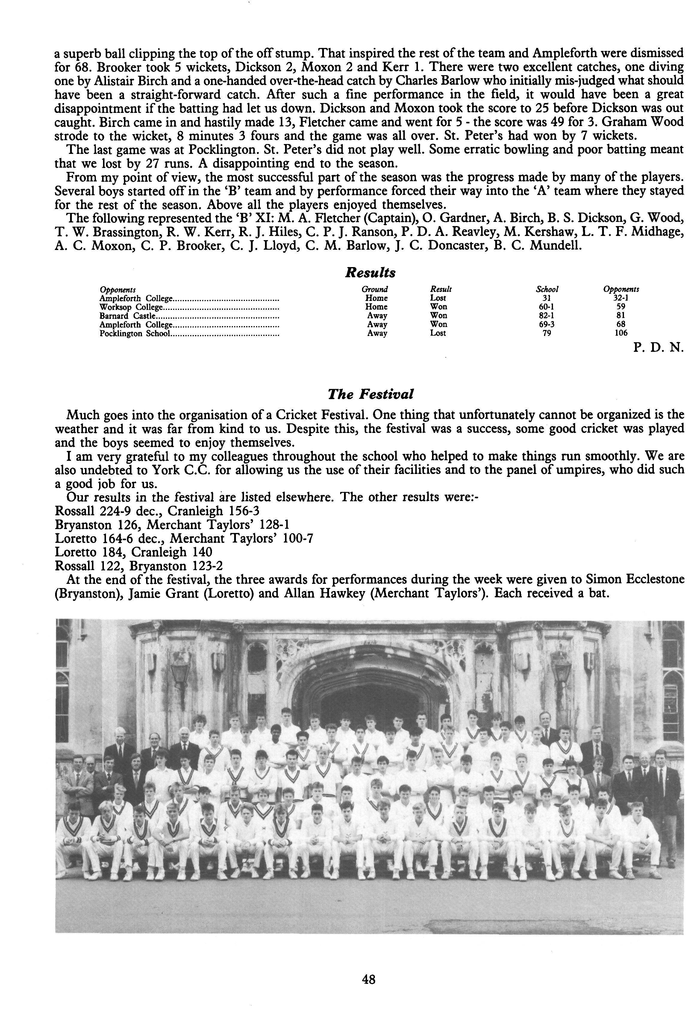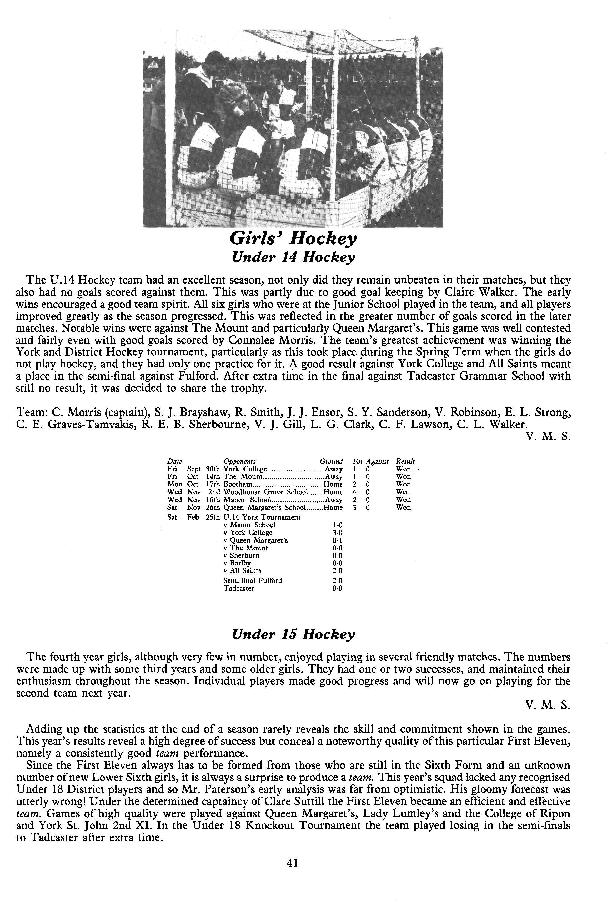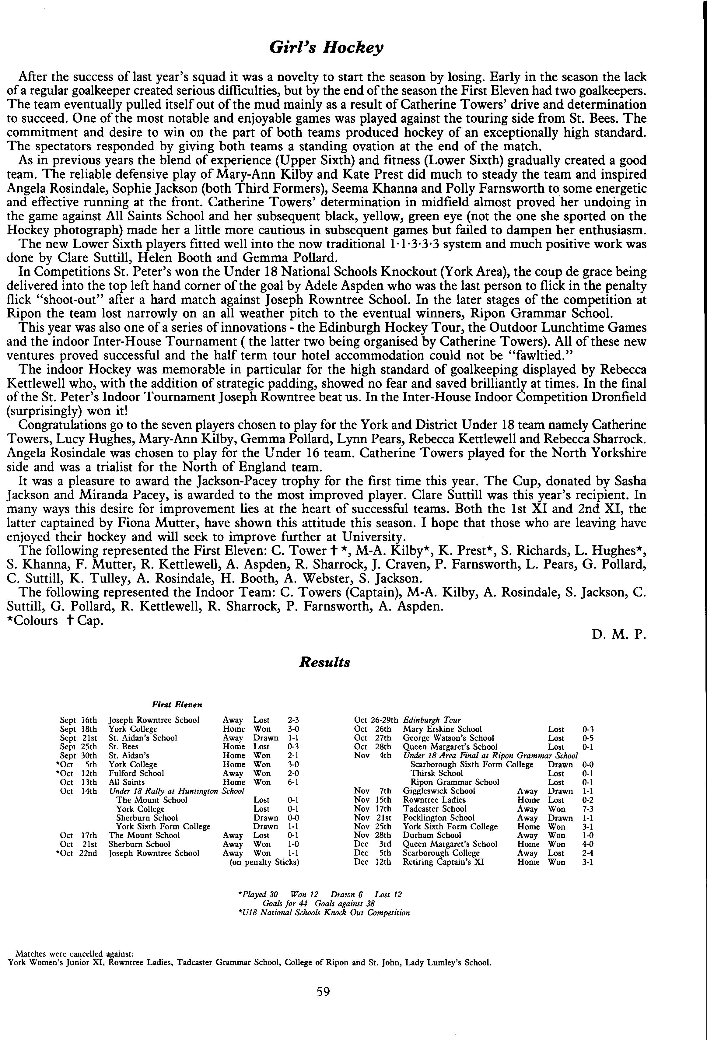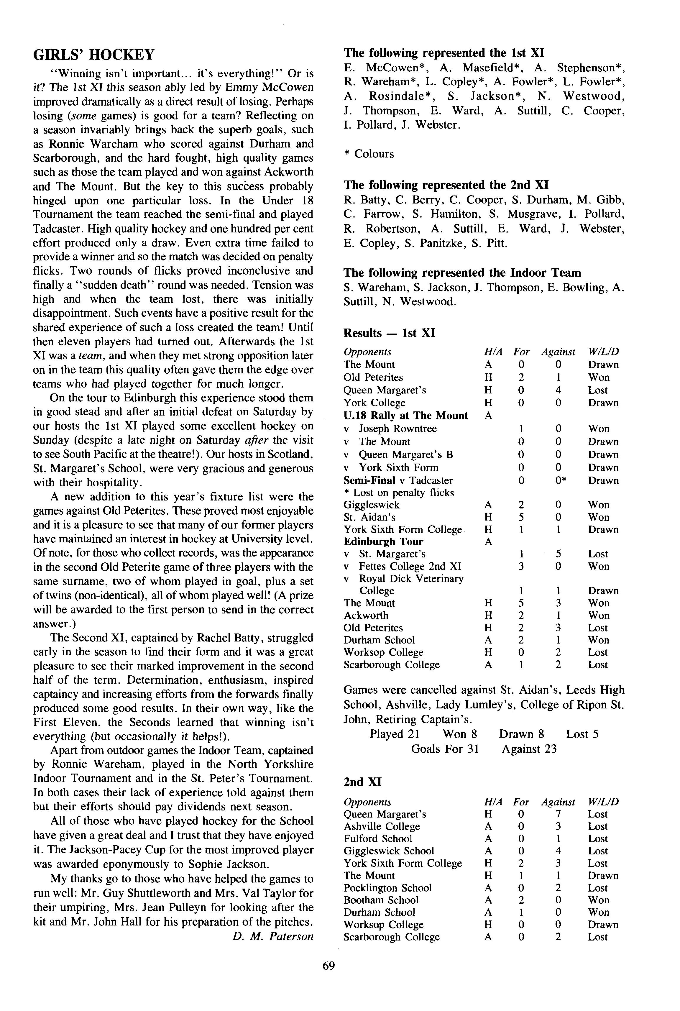 D. N. Calderhead represented England in the World Youth Fencing Championship at Stuttgart in March. Scholarships at 13+ were awarded to J. M. L. Ayers, J. J. M. Blewitt, A. G. Curtis, A. P. N. Dunn, R. M. Macleod, M. W. E. Sumpton and M. J. G. Williams, at 16+ to P. S. Bond, N. P. Durham, Jacqueline L. Grace, Marianne Klar and RebeccaJ. Sharrock.