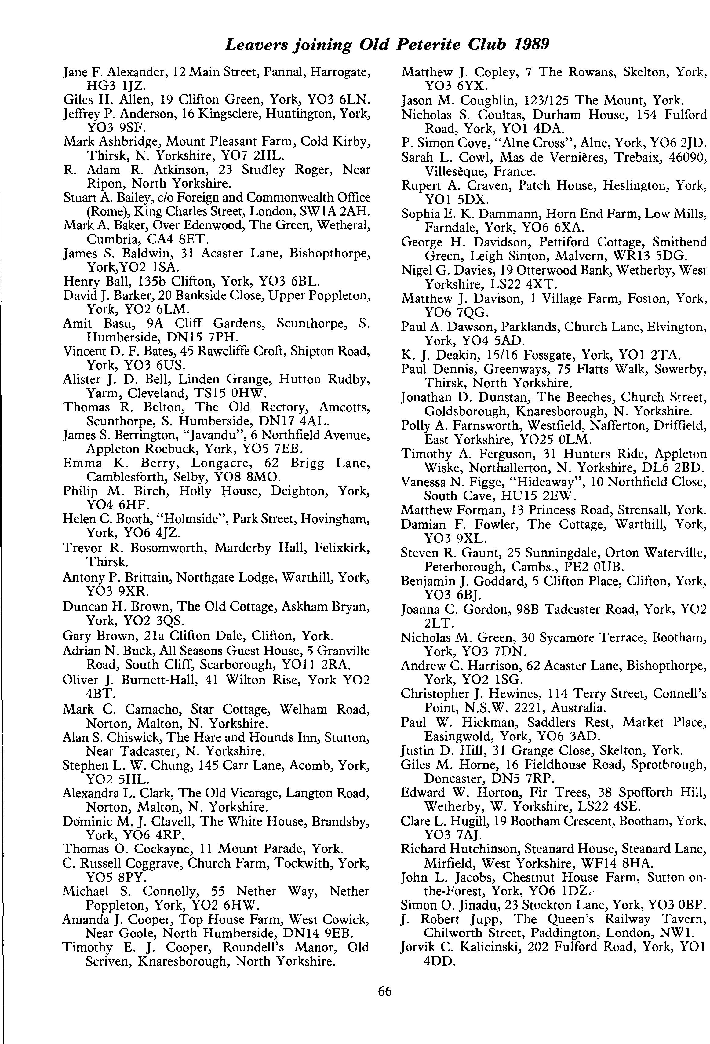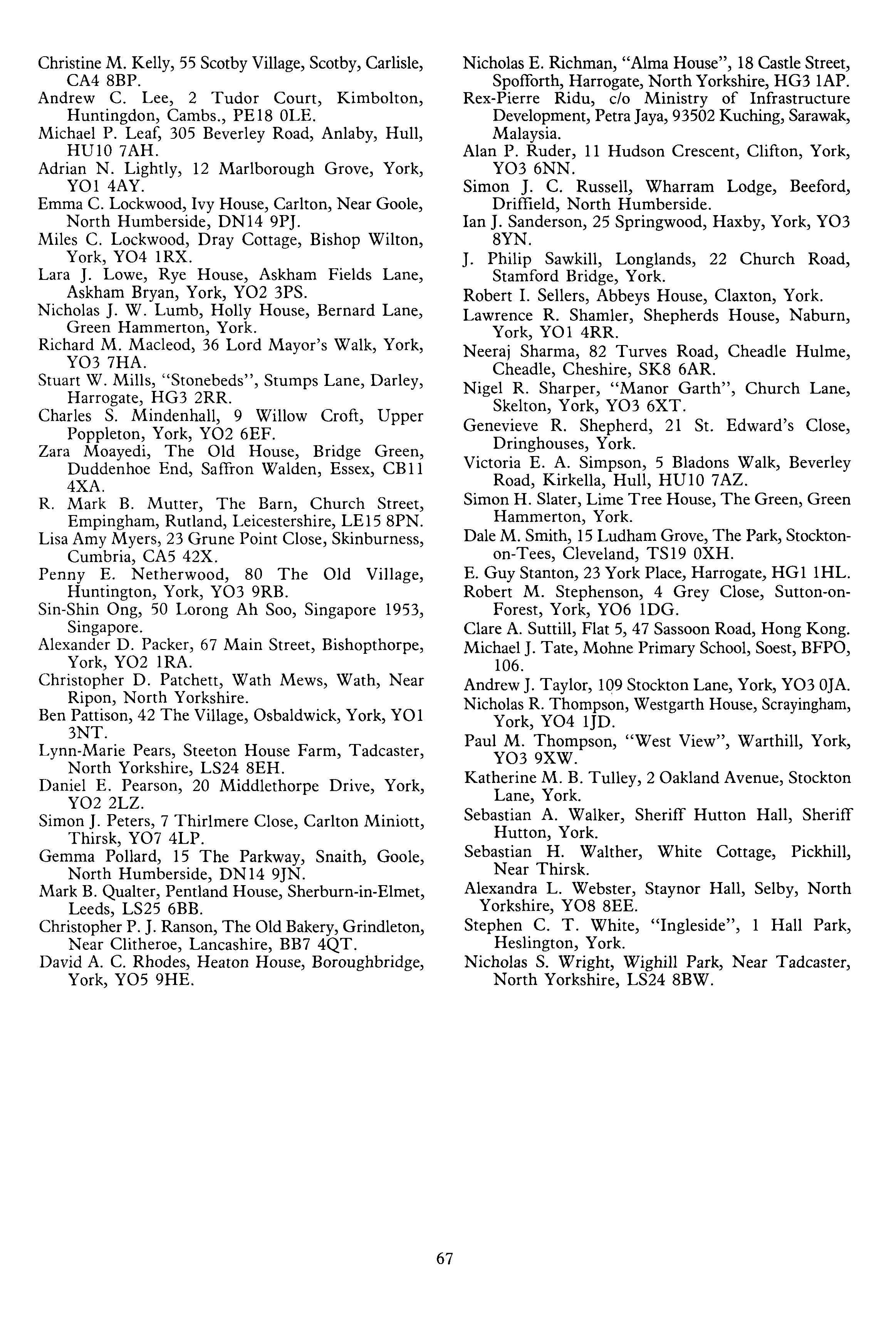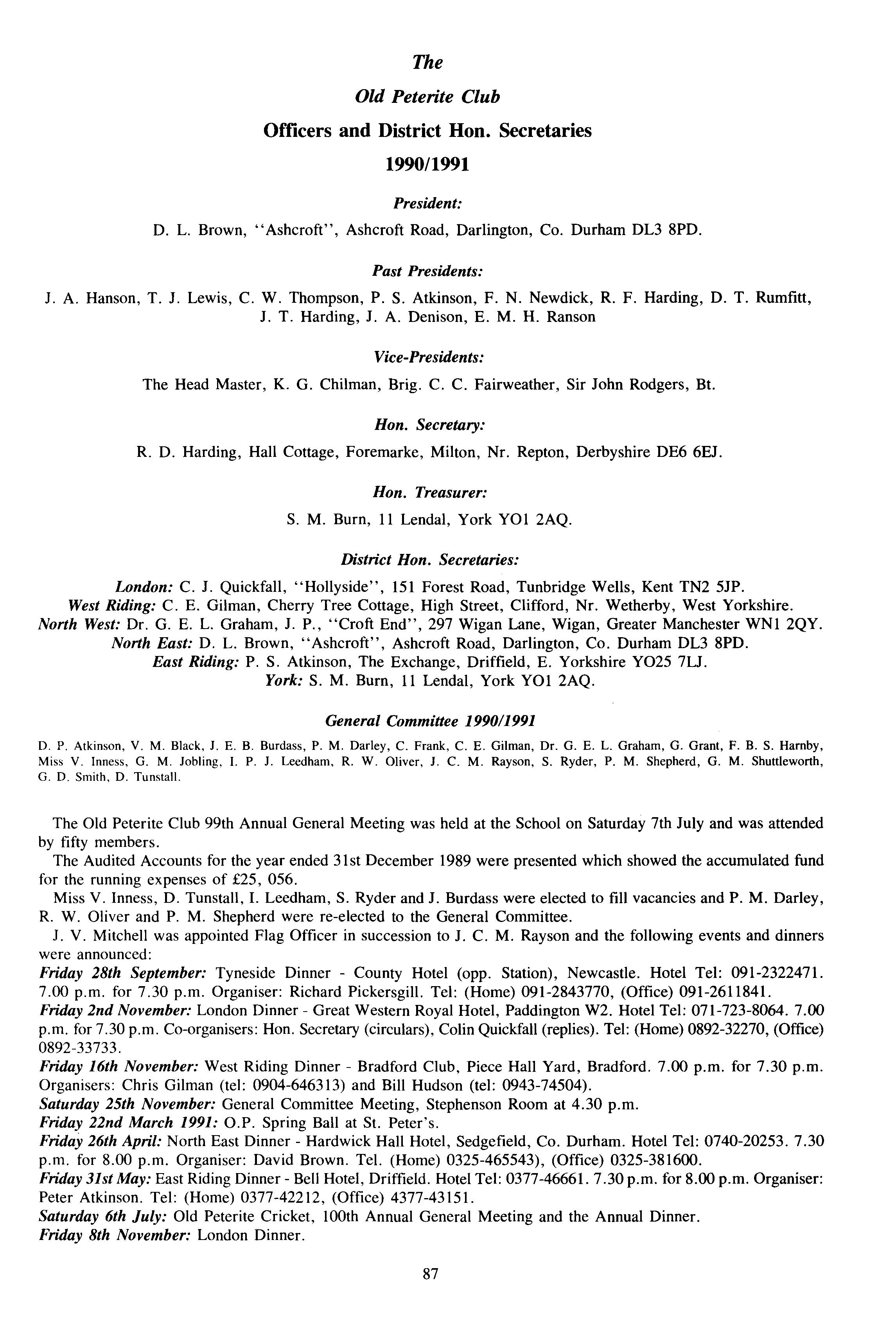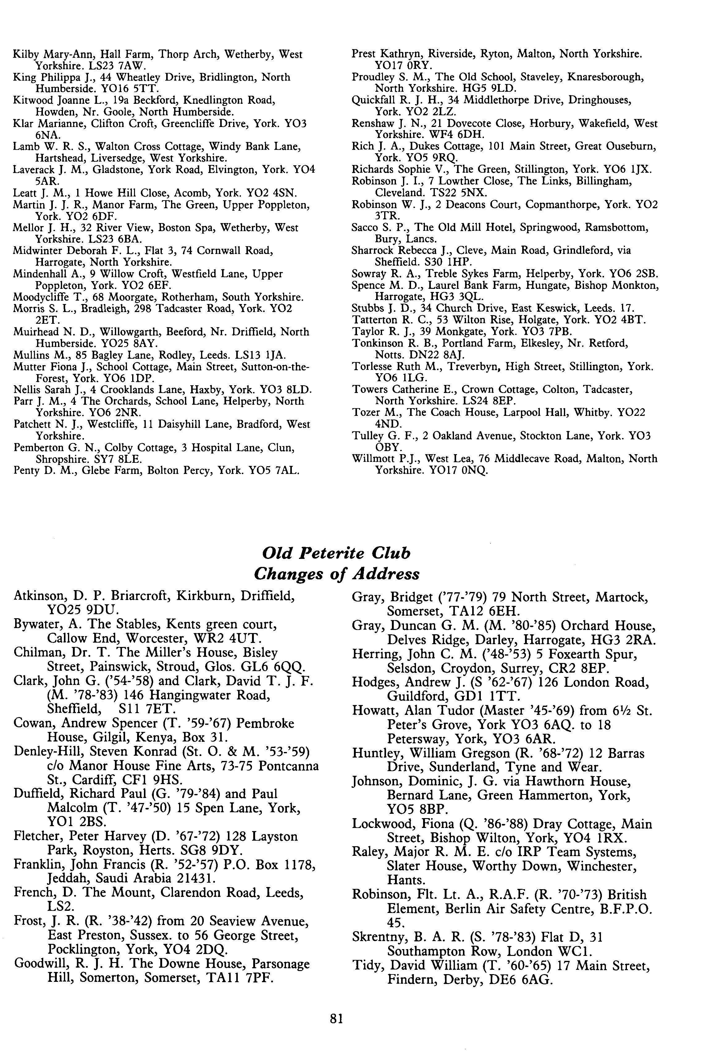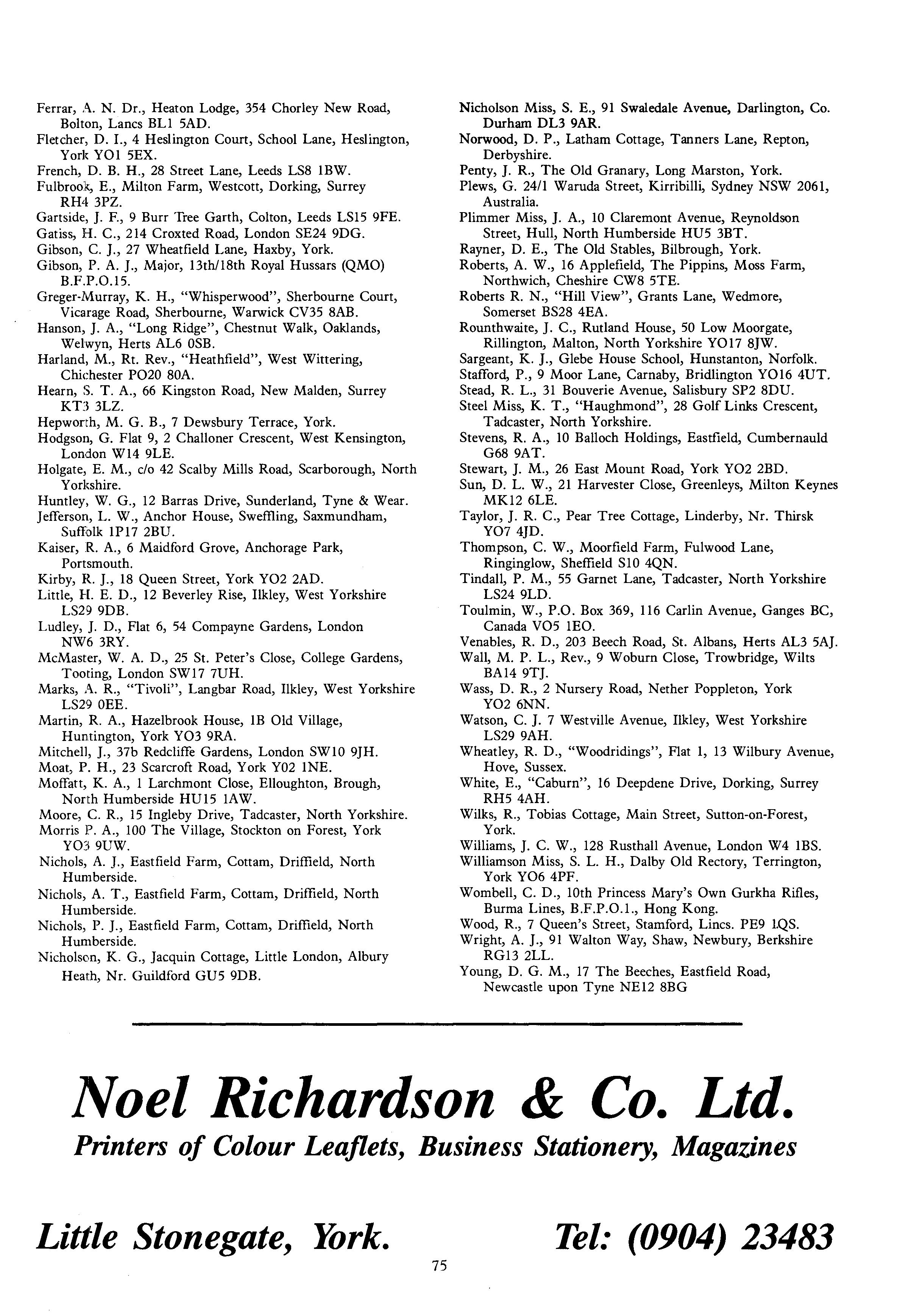 North East: D L Brown, "Ashcroft", Ashcroft Road, Darlington, Co Durham DL3 8PD East Riding: P S Atkinson, The Exchange, Driffield, E Yorkshire Y025 7LJ York: S M Burn, 11 Lendal, York YOl 2AQ