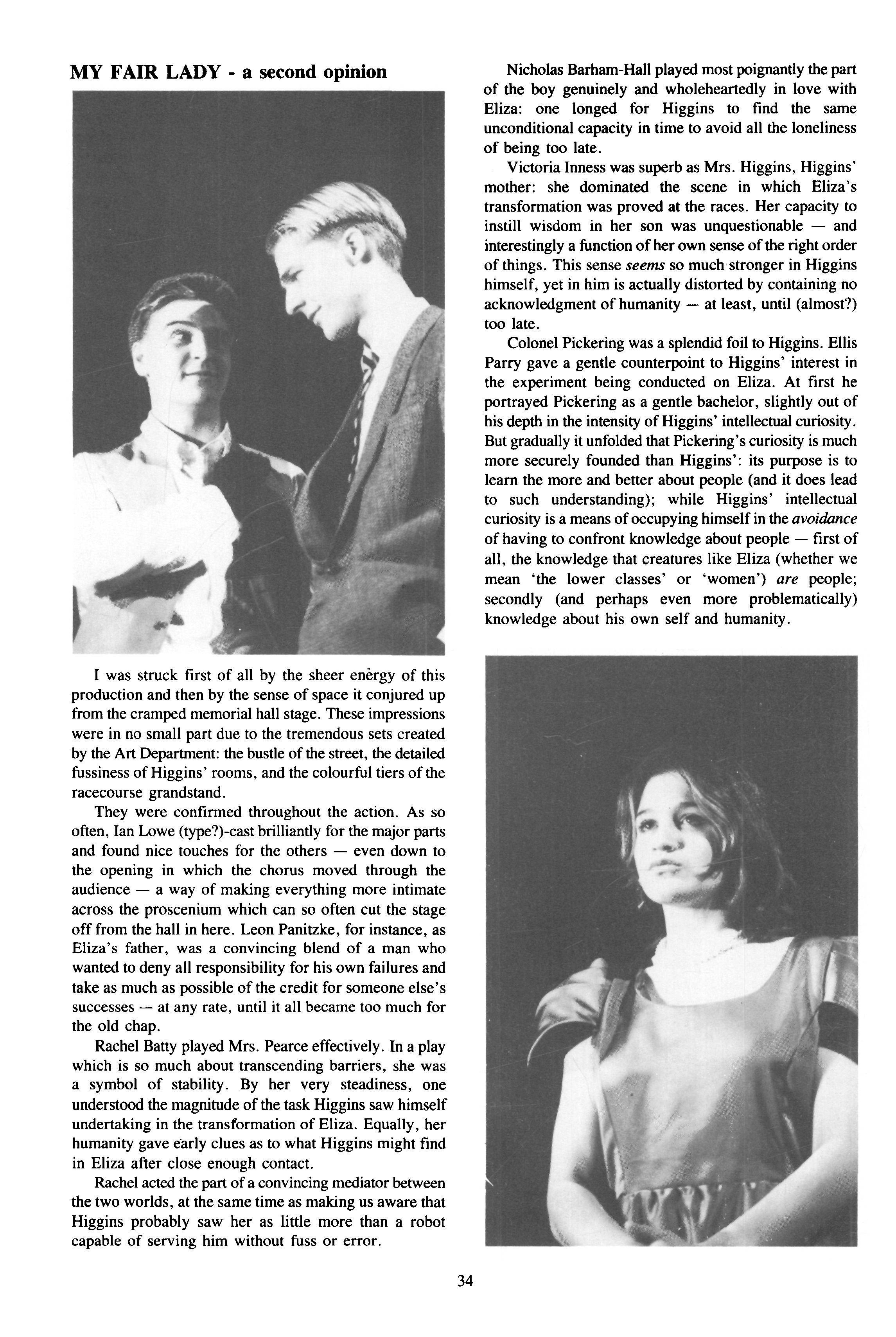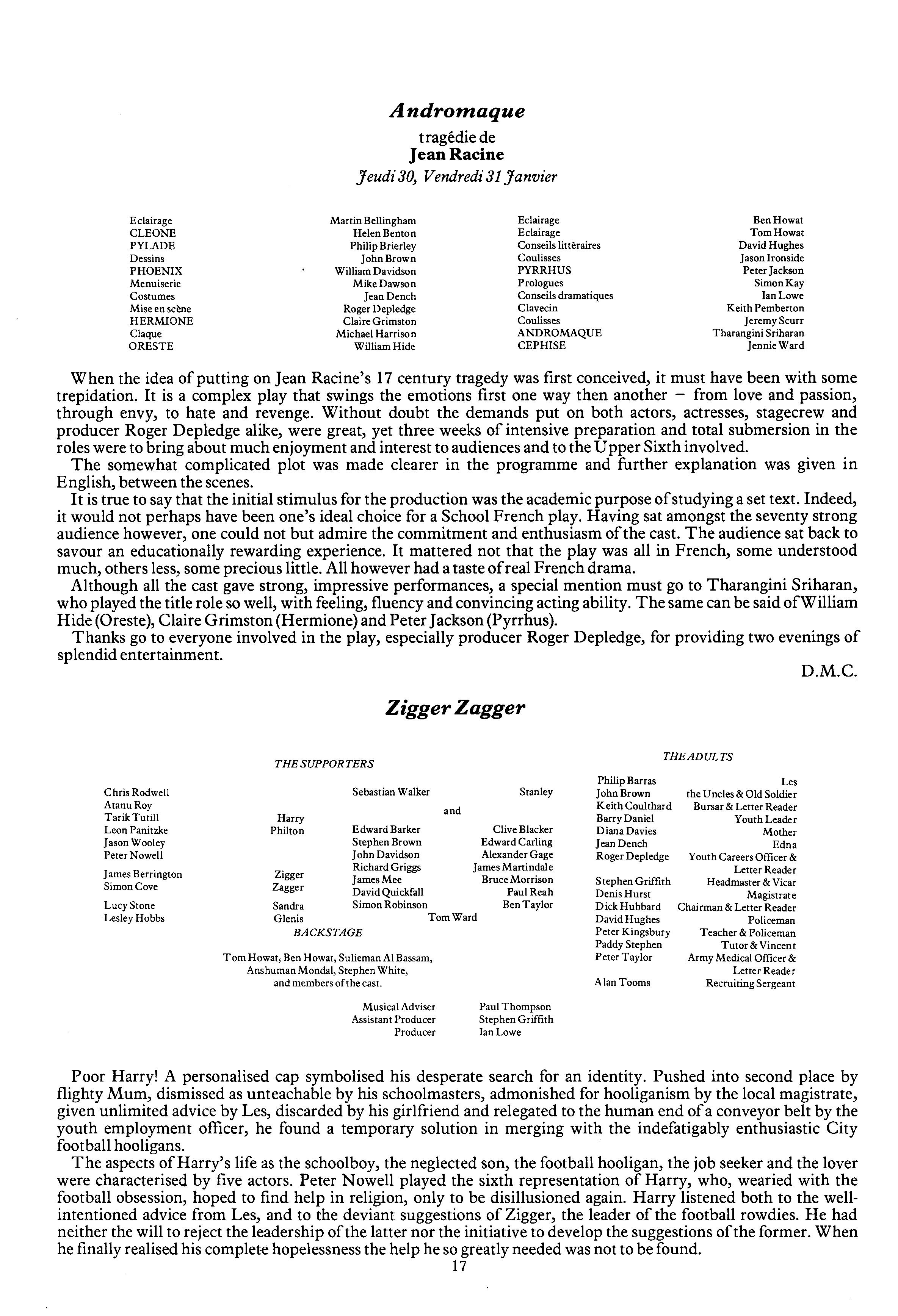 The School play, again reported elsewhere, in the Summer Term was a performance in the Chapel of Zigger Zagger. Again there was good representation from the S.C.R. and the typecasting was often so good as to be almost cruel! However all who took part enjoyed themselves to the extent that even Ian Lowe's patience was sorely tried by his colleagues