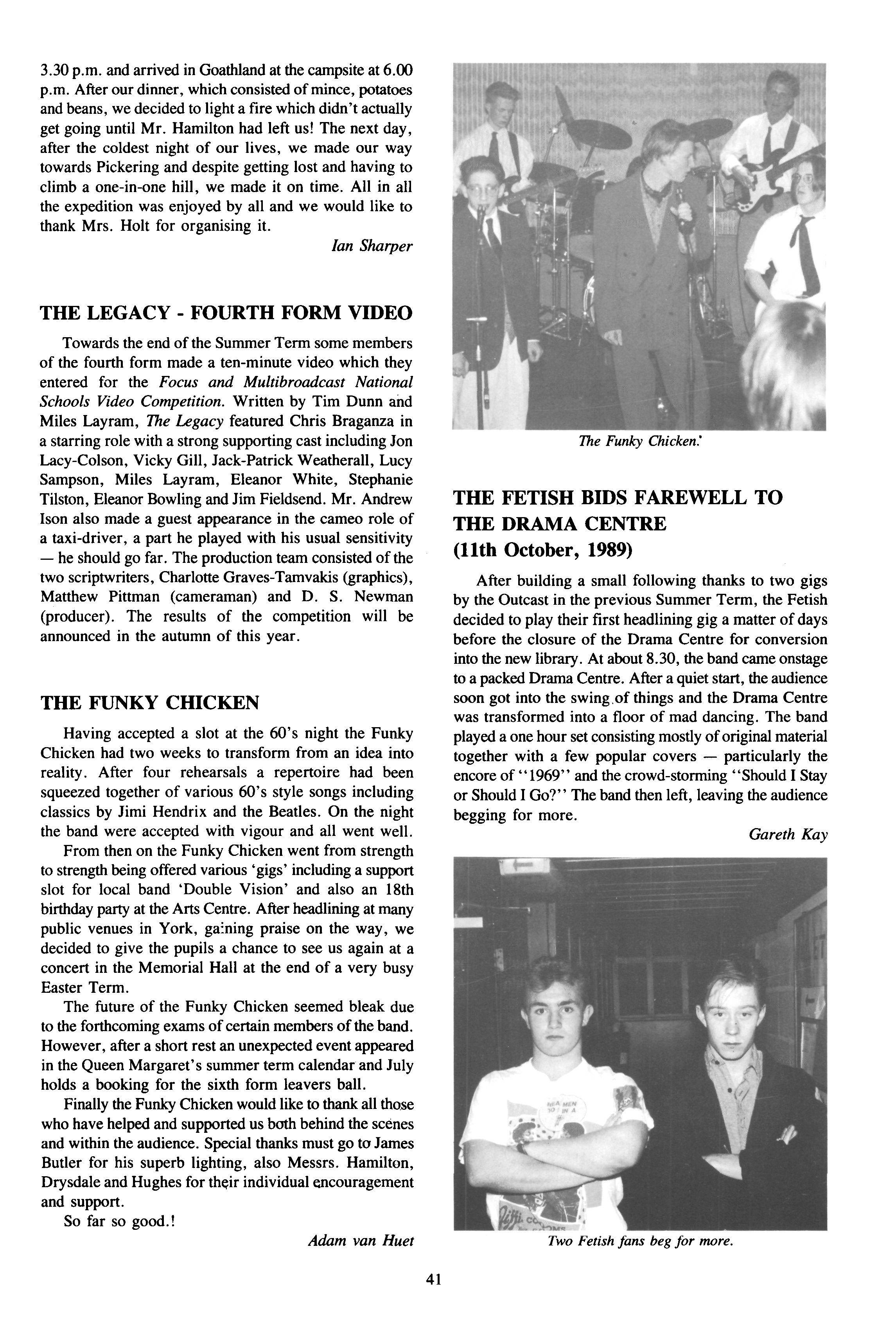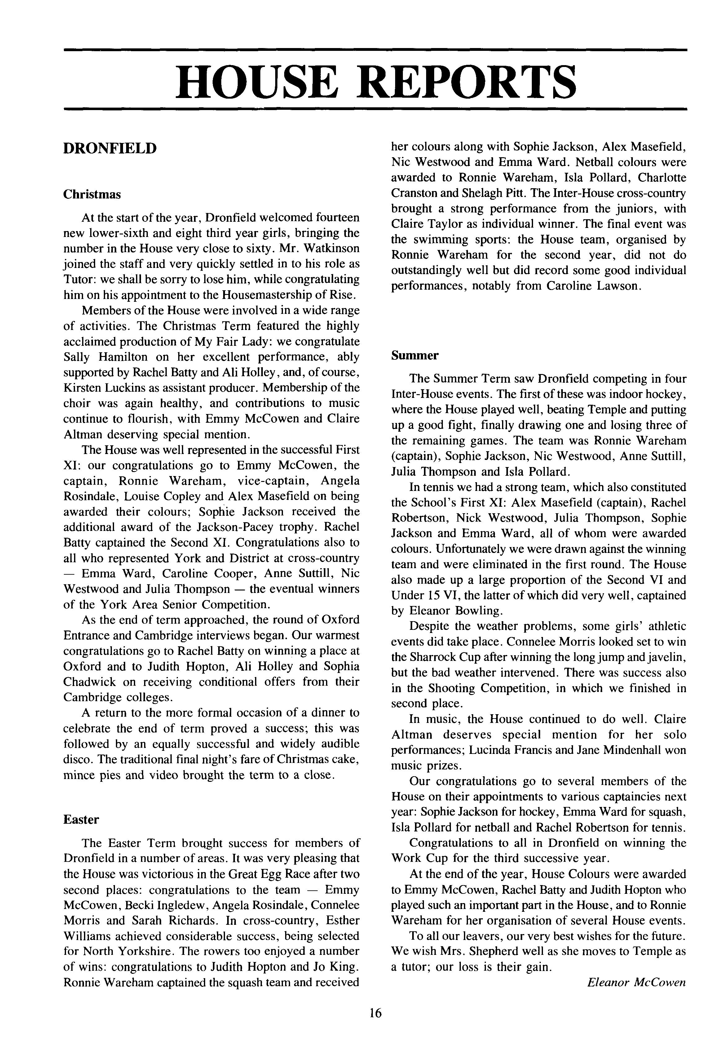 Again the School has been eager to raise money for charities A 'non-uniform' day on 4th February raised over £110 for an 'Emergency Box' appeal, and on the 25th May £210 was given to the Sport Aid Race Against Time On the 1st May the vast majority ofthe School took part in asponsored walk which raised over £9,000 for the paediatric department ofYork District Hospital