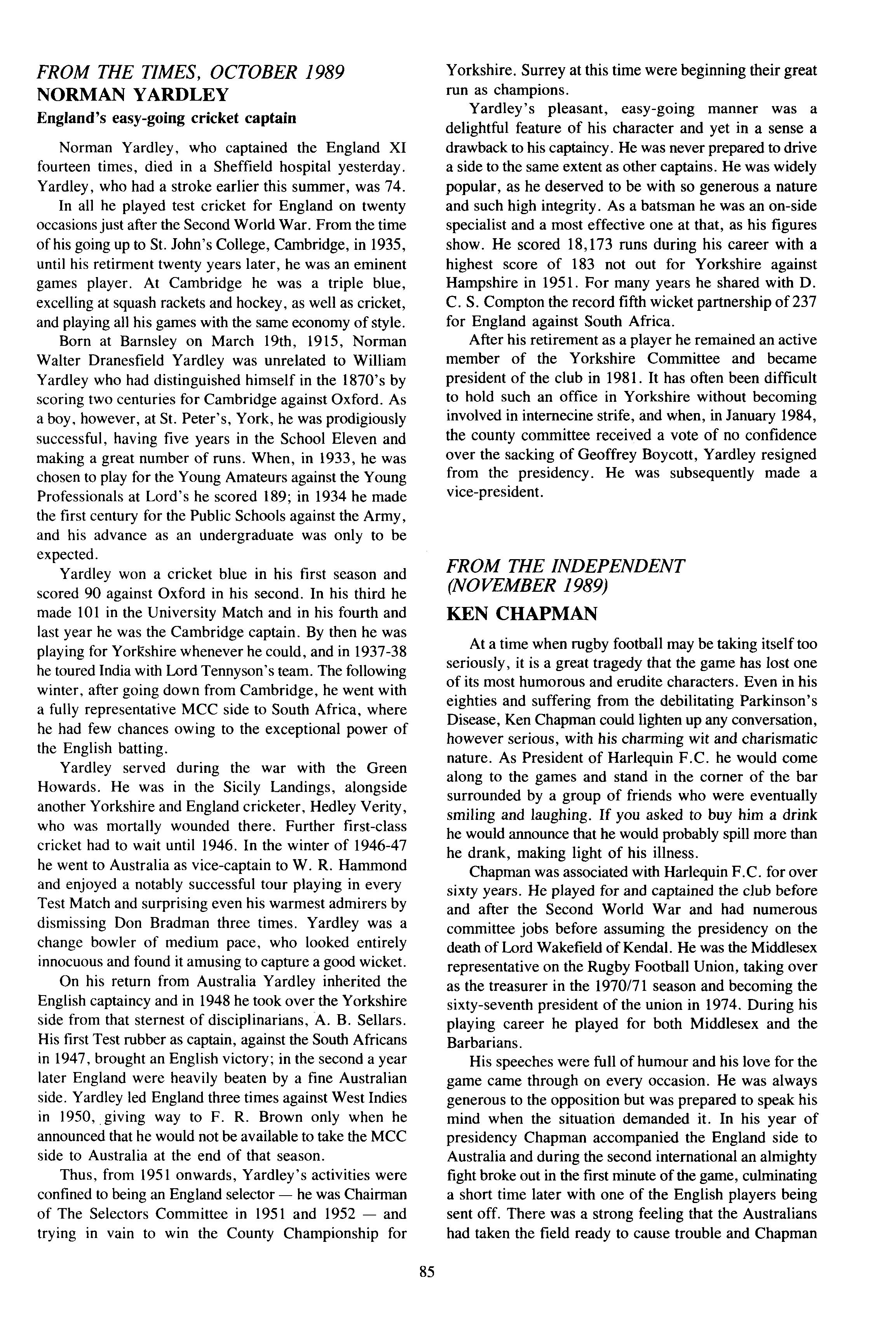 At a time when rugby football may be taking itself too seriously, it is a great tragedy that the game has lost one of its most humorous and erudite characters Even in his eighties and suffering from the debilitating Parkinson's Disease, Ken Chapman could lighten up any conversation, however serious, with his charming wit and charismatic nature As President of Harlequin F.C he would come along to the games and stand in the corner of the bar surrounded by a group of friends who were eventually smiling and laughing If you asked to buy him a drink he would announce that he would probably spill more than he drank, making light of his illness