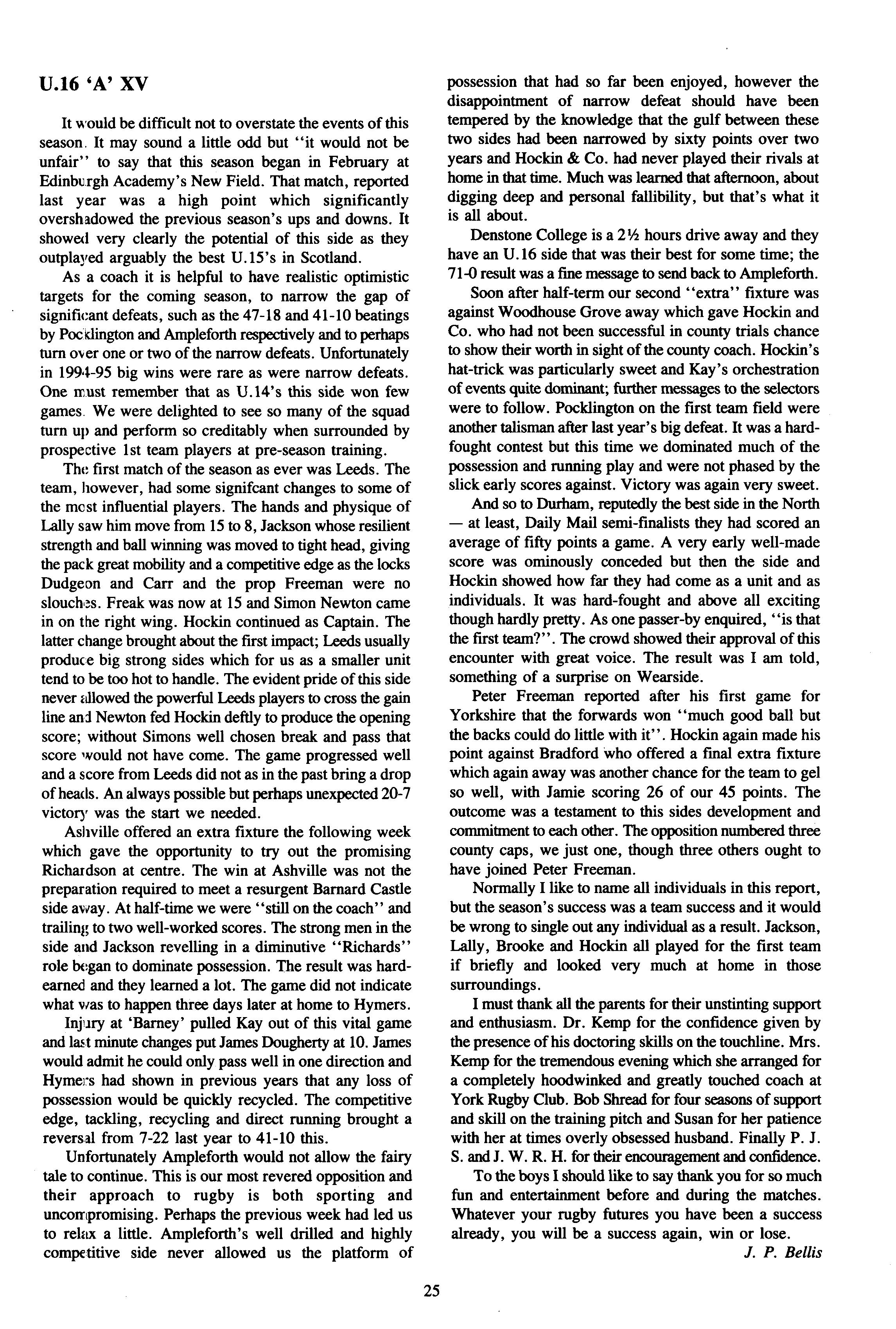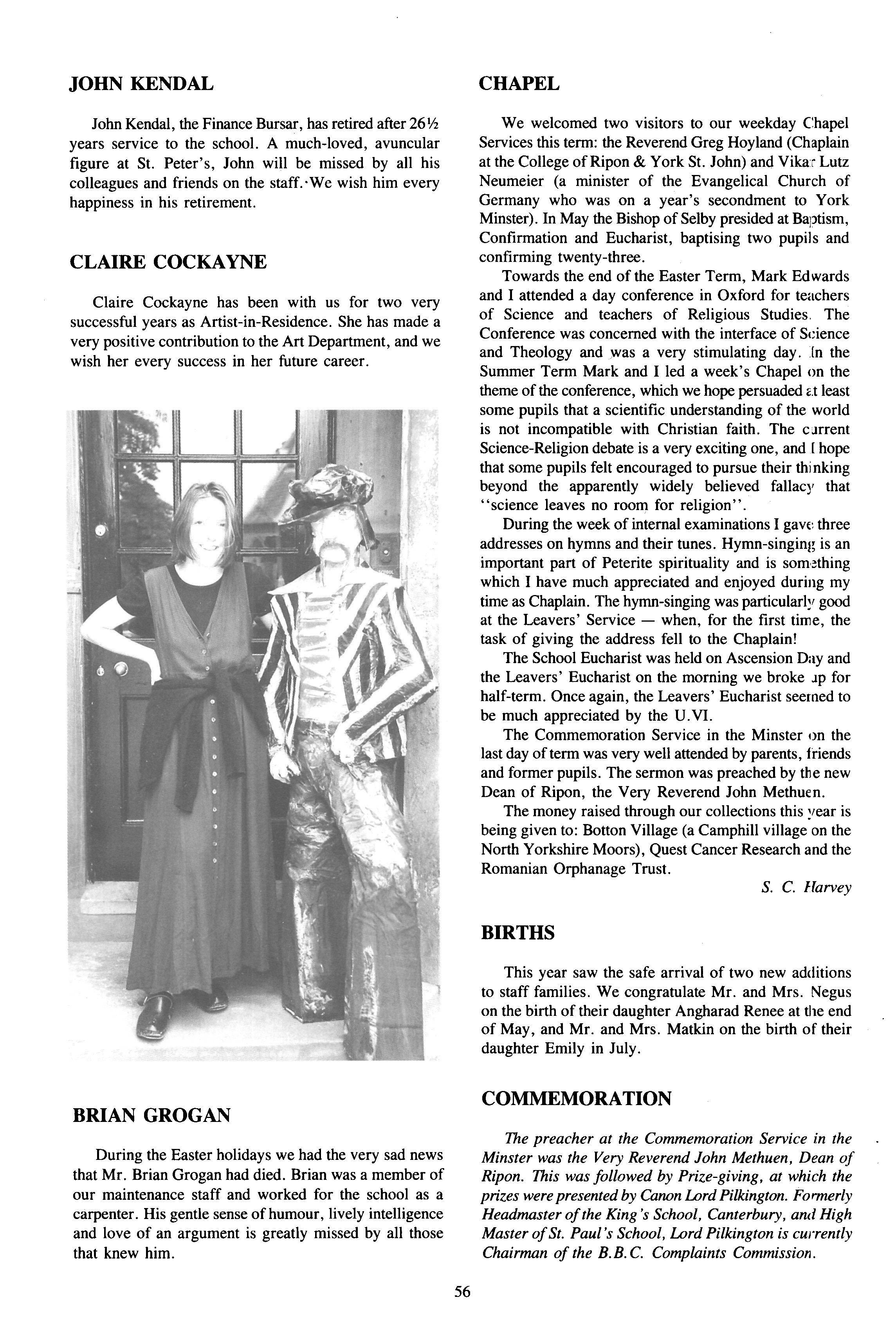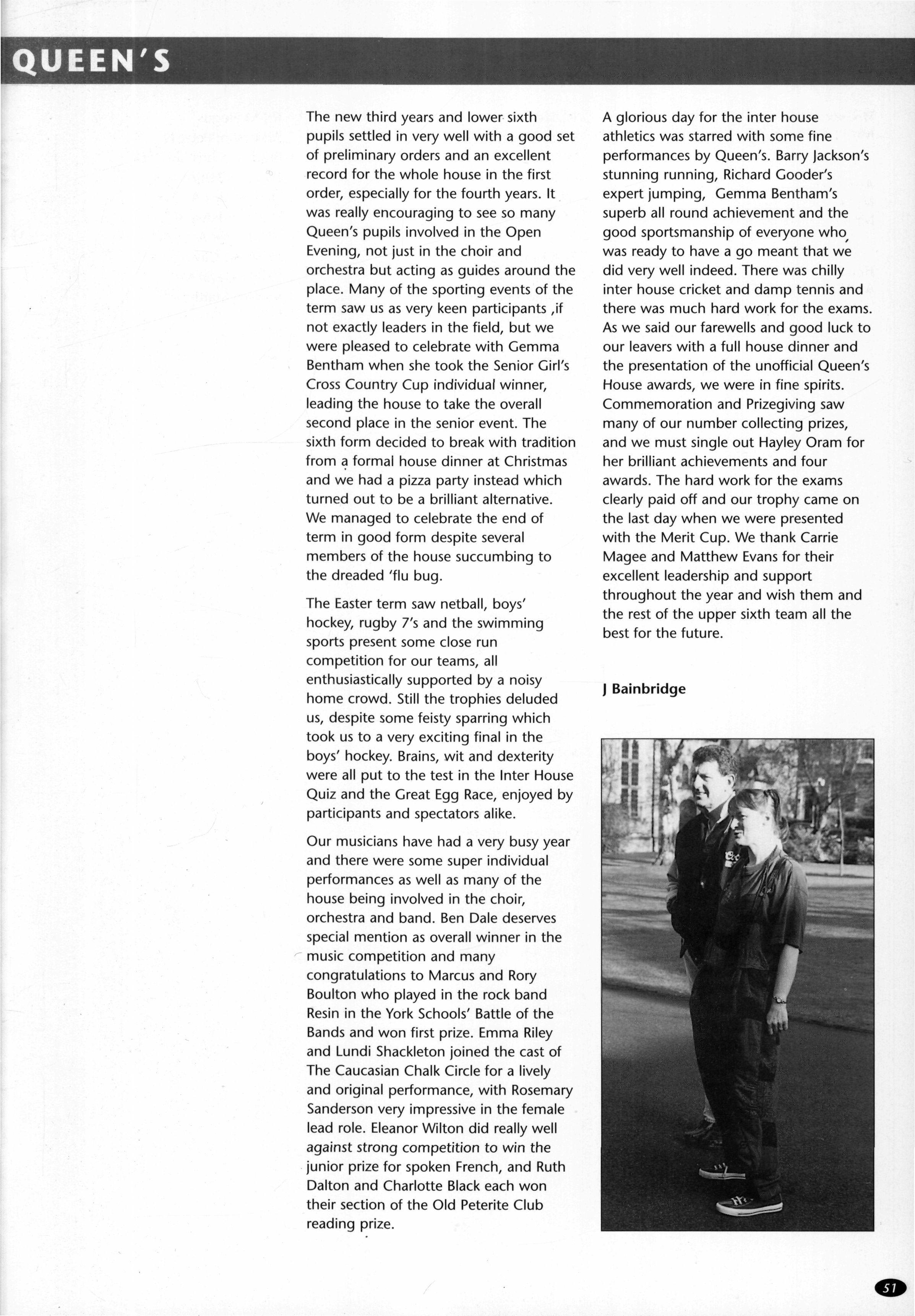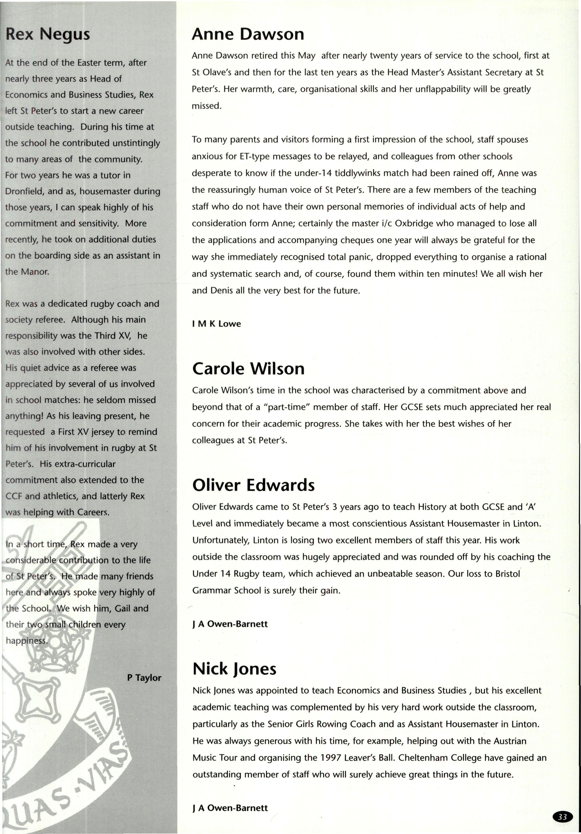 Another Christmas leaver was Mr James Bellis, of whom Mr Stephen writes: "Jim Bellis arrived from Fettes to teach Geography, stayed five years and left to run the Geography Department at Giggleswick Phrases such as "you'll love this, it's groovy" or "Geography is great" were frequently heard coming from room C His love of his subject was always evident. Giggleswick's gain is but our loss The fact that Jim has left us to take up a Head of Department post indicates his work as a teacher of geography. He has been on field trips to Arran, run courses on field days around the school, helped many projects and was part of the I.T. revolution! However, these are bland facts and Jim was never bland!! He was House Tutor/Assistant first in The Rise and then in School/Linton His commitment to boarding and its ethos was never in doubt, and he has moved on to a "real boarding school"! As well as his family, which increased by two whilst with us, his next love was rugby Here he stewarded the U.15 XV for several years. However his, and probably their, finest hours came when he took over the U.16 XV this season Tremendous wins over all our major opponents (except Ampleforth 13-0 (A)) was testament to both the team spirit and skill he achieved with this group of young men. Certainly his commitment was rewarded with his move onto the committee of Yorkshire U.16 Colts Jim also loved touring, either organising wonderfully successful tours back to Scotland with the U.15's or accompanying the 1st XV to Ireland Jim was a good organiser of certain events: his "Black Sheep" at the end of term "do's" sticks in the mind (as it always did the next day!!). However, we should not forge': his geography and those who went on field trips We'll never forget the ultimate fifth form experience of being sent in boxer shorts onto the tennis courts at midnight These mild disciplinary methods highlighted his desire that things should go well and be done properly. He wanted those he taught to be self-disciplined and proud of (heir achievements. Our good wishes go to Sue, Catriona and Rory and a huge thanks, as colleague and friend, go to Jim."