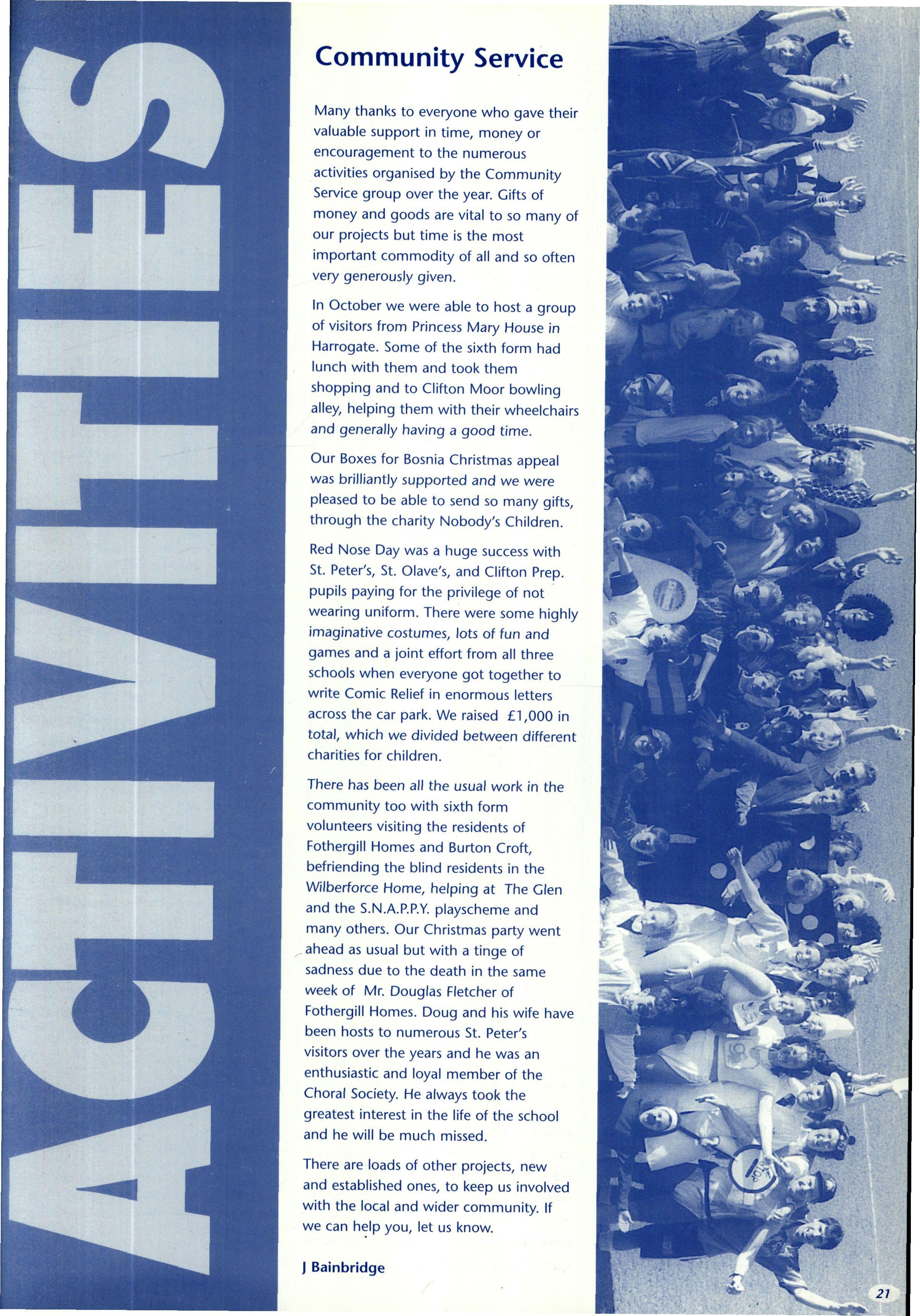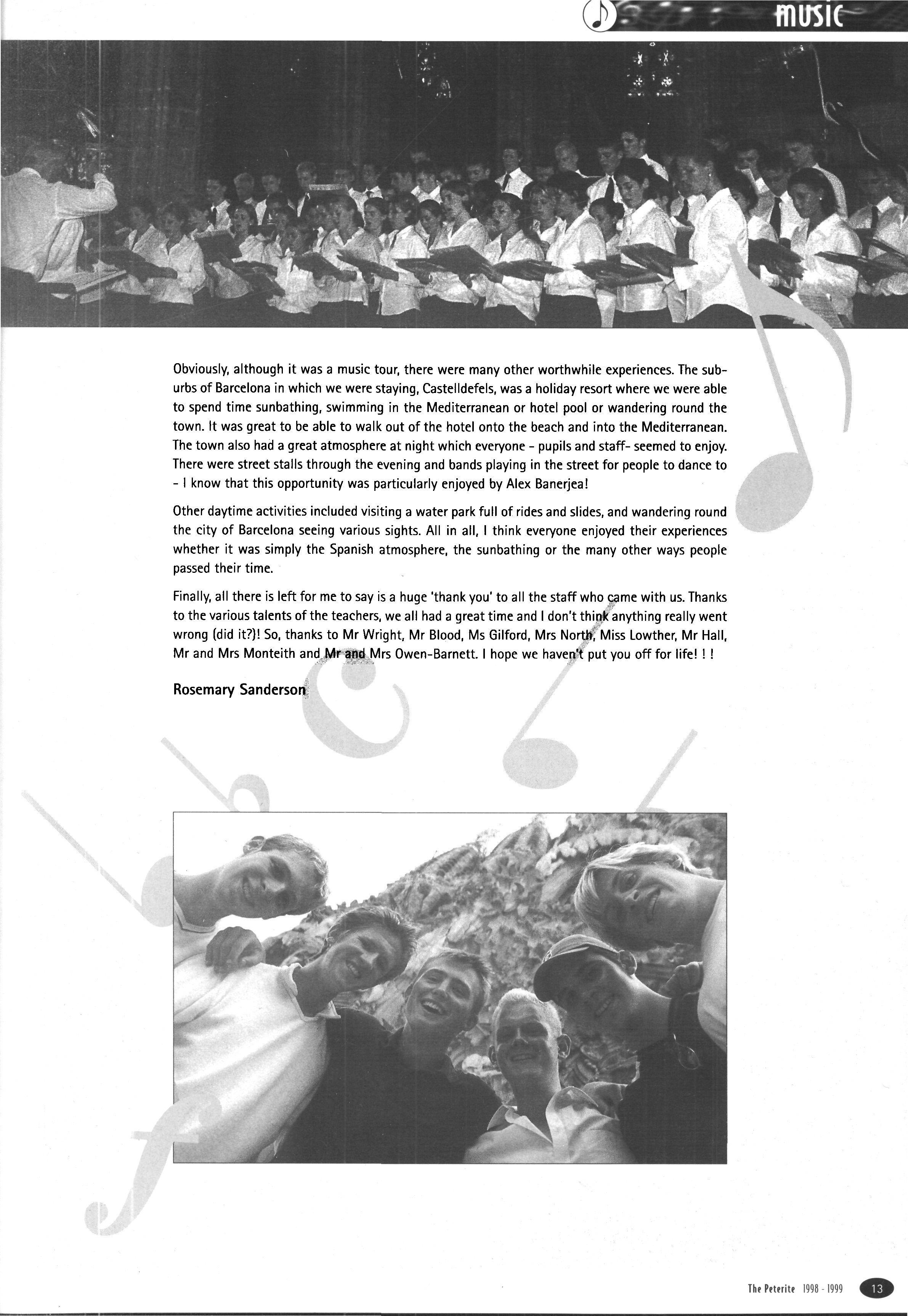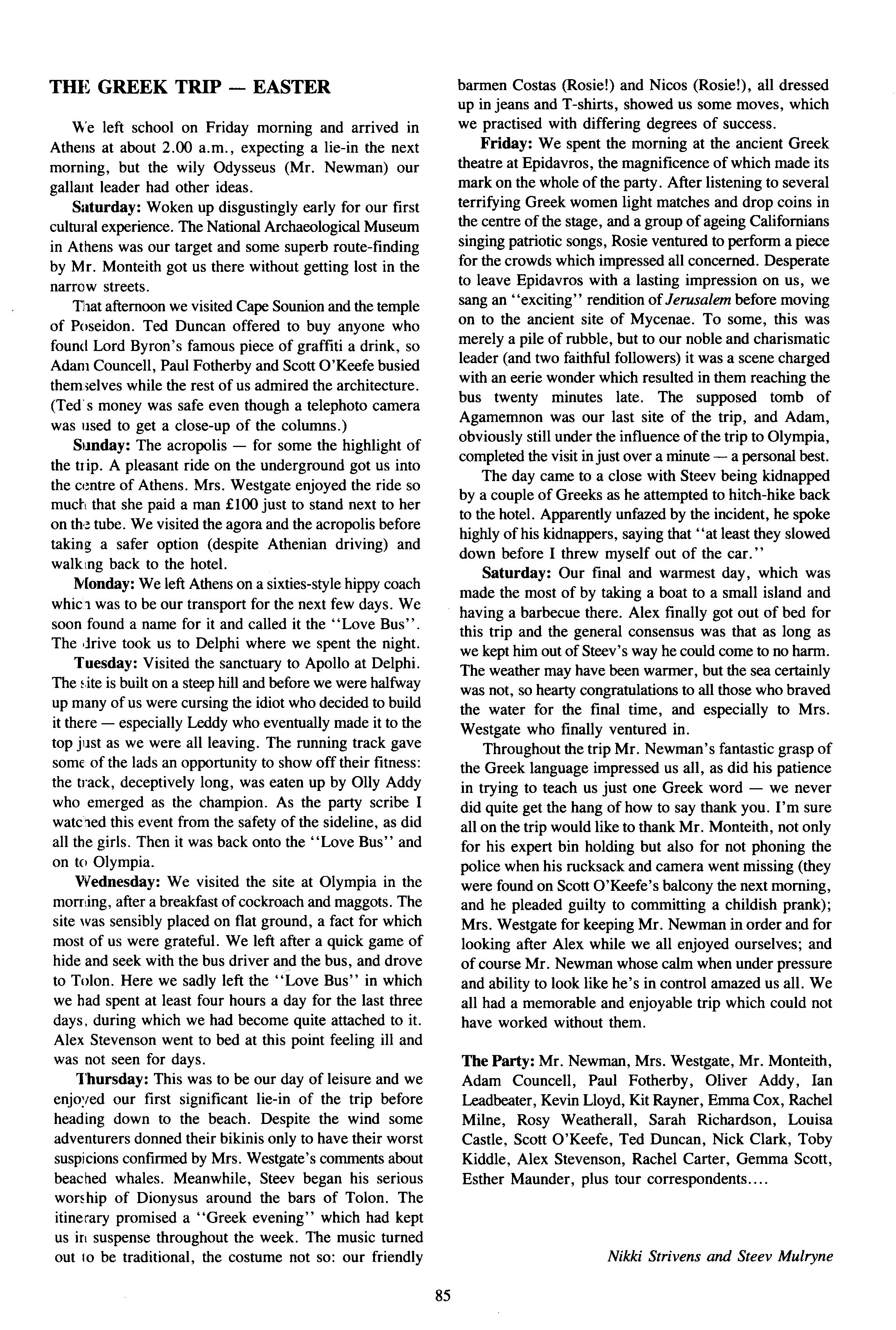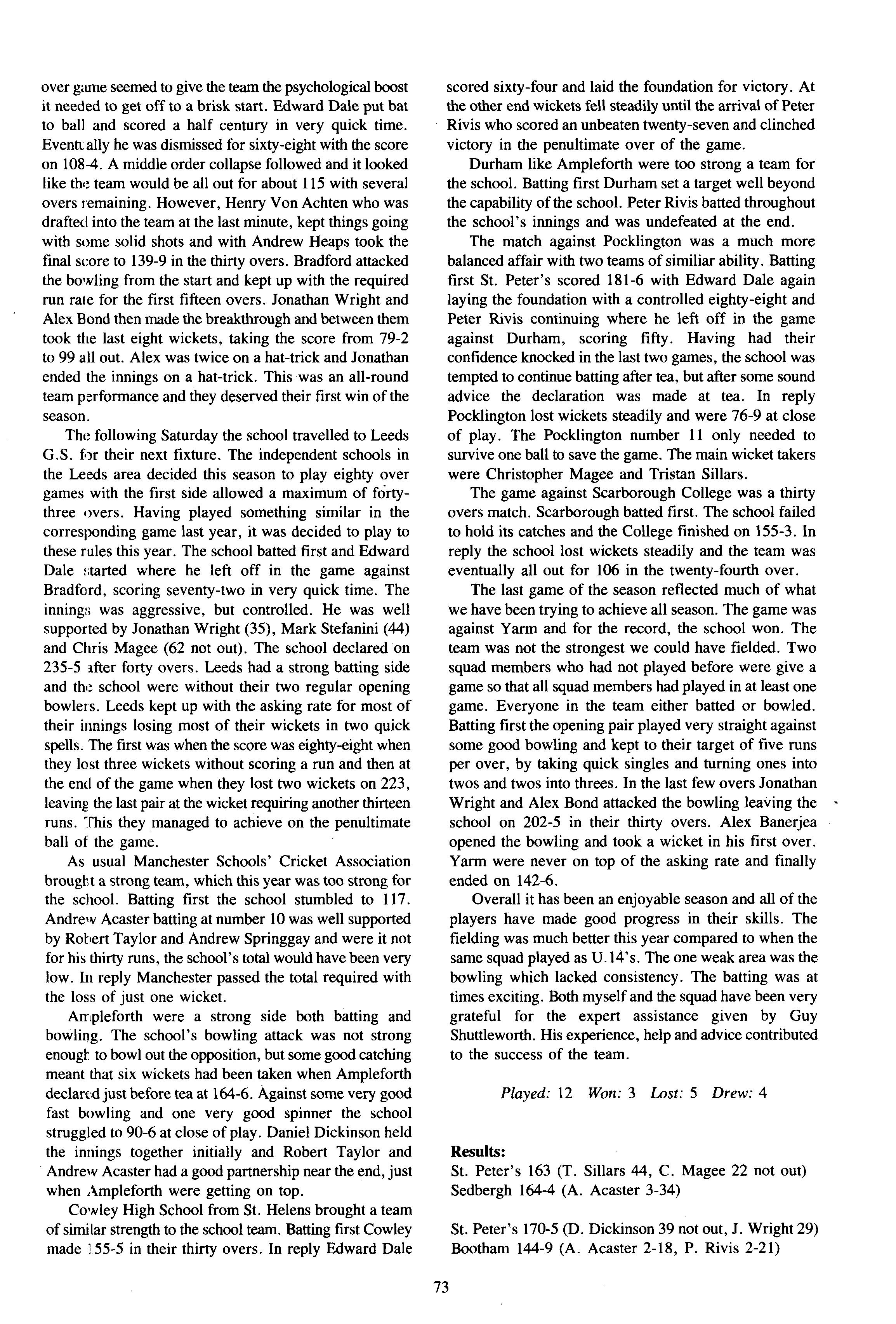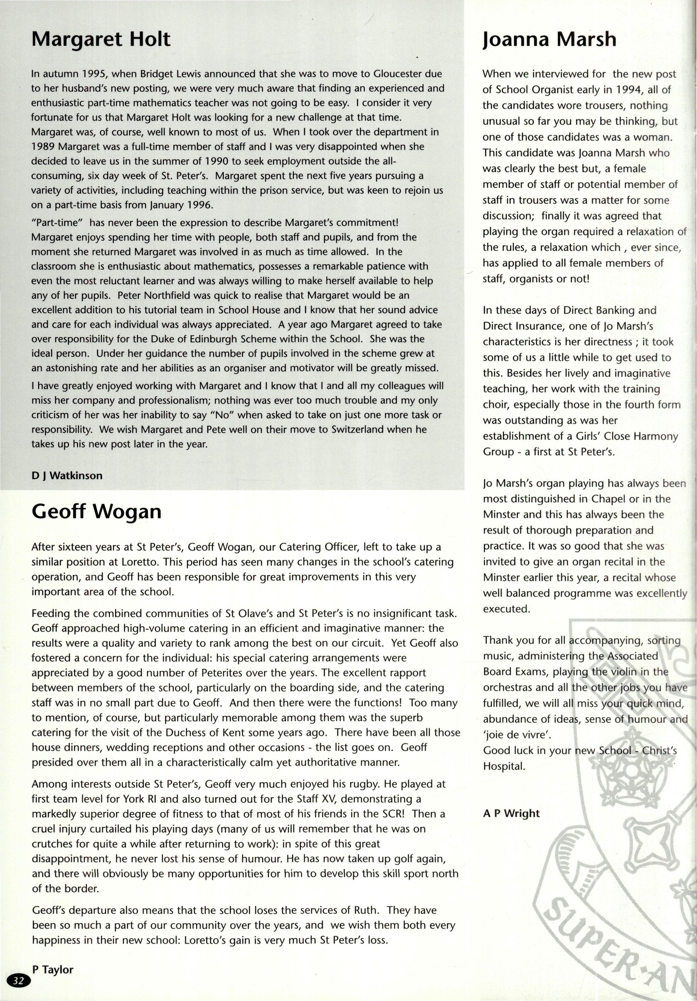 Another Christmas leaver was Mr James Bellis, of whom Mr Stephen writes: "Jim Bellis arrived from Fettes to teach Geography, stayed five years and left to run the Geography Department at Giggleswick Phrases such as "you'll love this, it's groovy" or "Geography is great" were frequently heard coming from room C His love of his subject was always evident. Giggleswick's gain is but our loss The fact that Jim has left us to take up a Head of Department post indicates his work as a teacher of geography. He has been on field trips to Arran, run courses on field days around the school, helped many projects and was part of the I.T. revolution! However, these are bland facts and Jim was never bland!! He was House Tutor/Assistant first in The Rise and then in School/Linton His commitment to boarding and its ethos was never in doubt, and he has moved on to a "real boarding school"! As well as his family, which increased by two whilst with us, his next love was rugby Here he stewarded the U.15 XV for several years. However his, and probably their, finest hours came when he took over the U.16 XV this season Tremendous wins over all our major opponents (except Ampleforth 13-0 (A)) was testament to both the team spirit and skill he achieved with this group of young men. Certainly his commitment was rewarded with his move onto the committee of Yorkshire U.16 Colts Jim also loved touring, either organising wonderfully successful tours back to Scotland with the U.15's or accompanying the 1st XV to Ireland Jim was a good organiser of certain events: his "Black Sheep" at the end of term "do's" sticks in the mind (as it always did the next day!!). However, we should not forge': his geography and those who went on field trips We'll never forget the ultimate fifth form experience of being sent in boxer shorts onto the tennis courts at midnight These mild disciplinary methods highlighted his desire that things should go well and be done properly. He wanted those he taught to be self-disciplined and proud of (heir achievements. Our good wishes go to Sue, Catriona and Rory and a huge thanks, as colleague and friend, go to Jim."