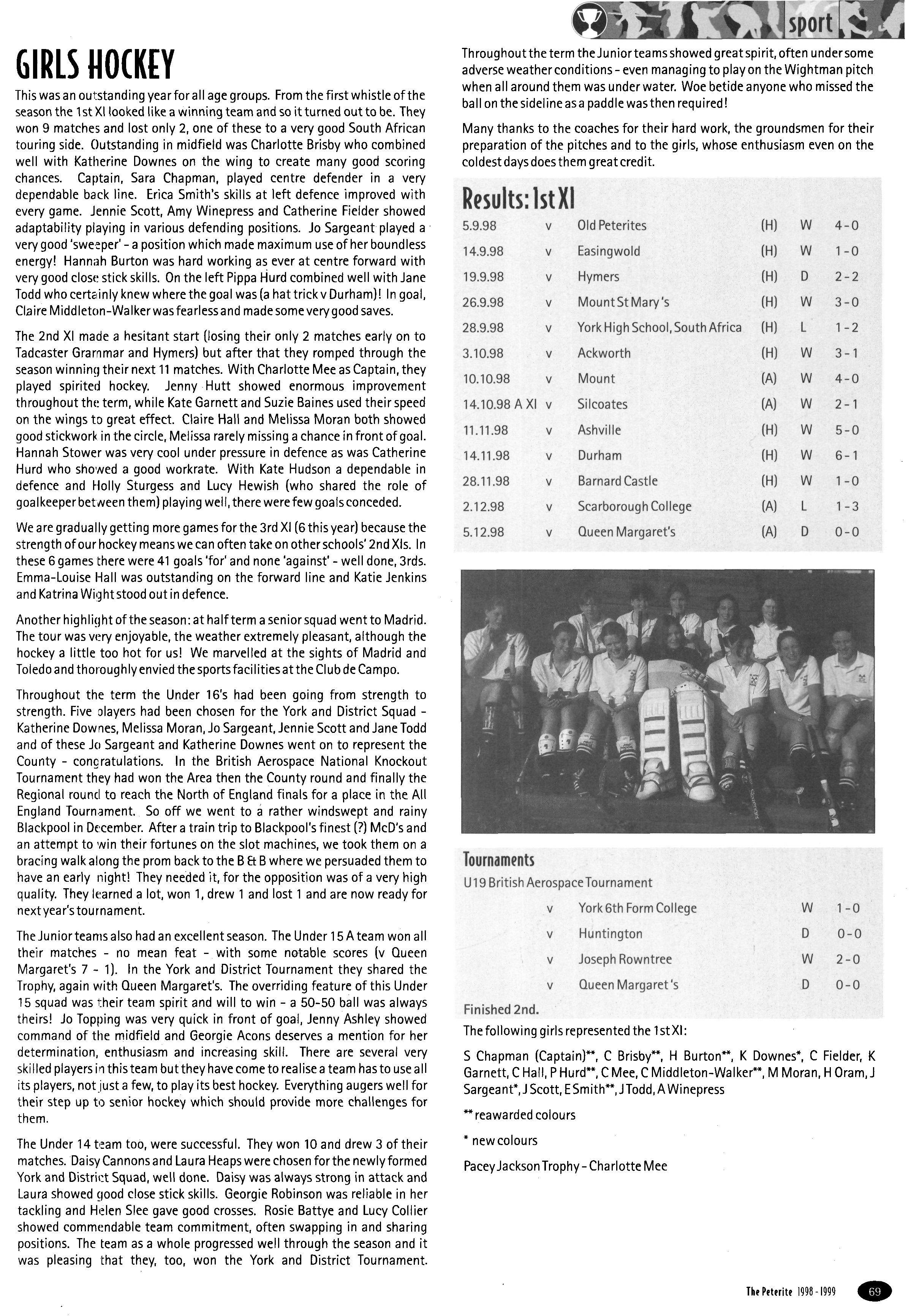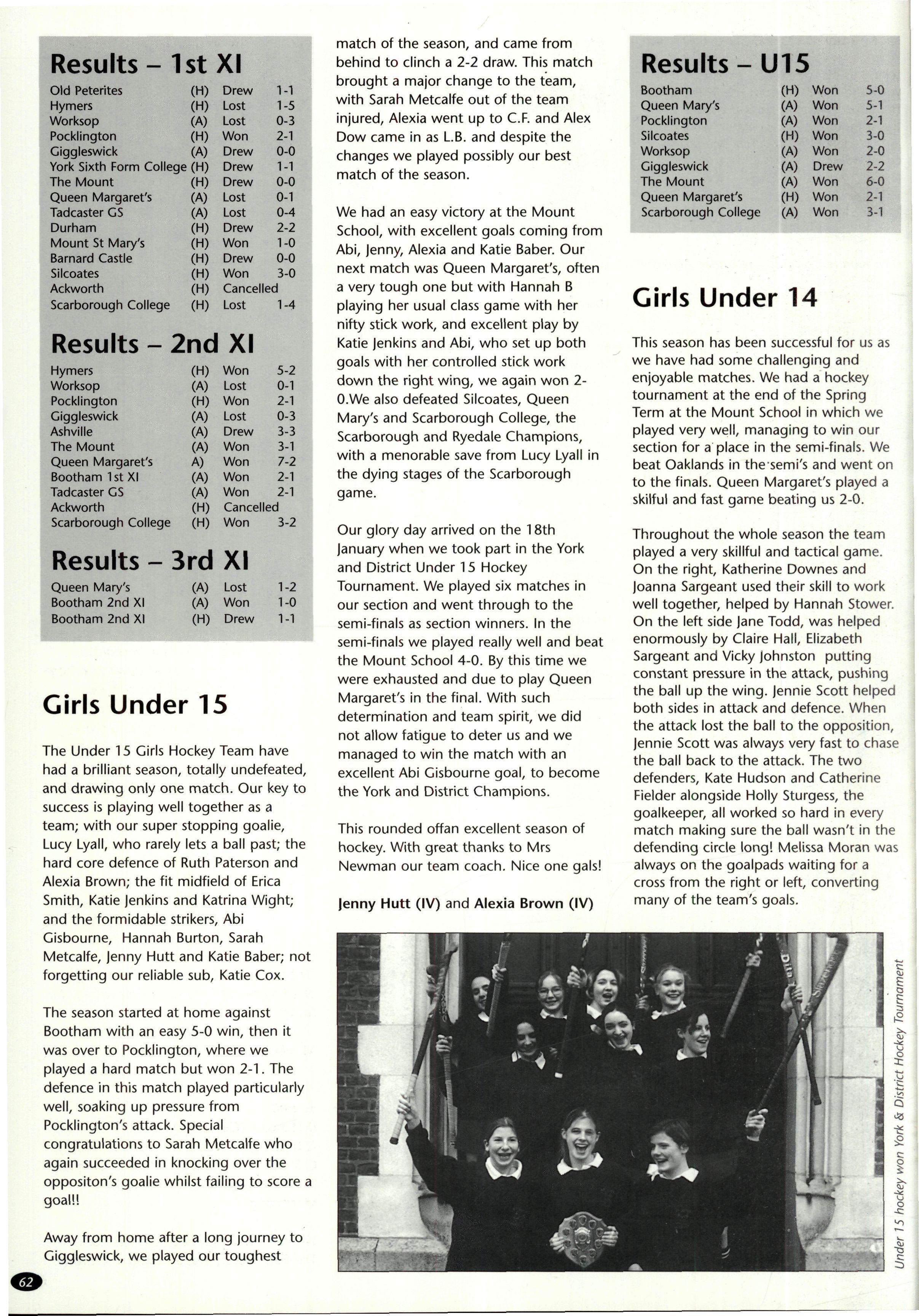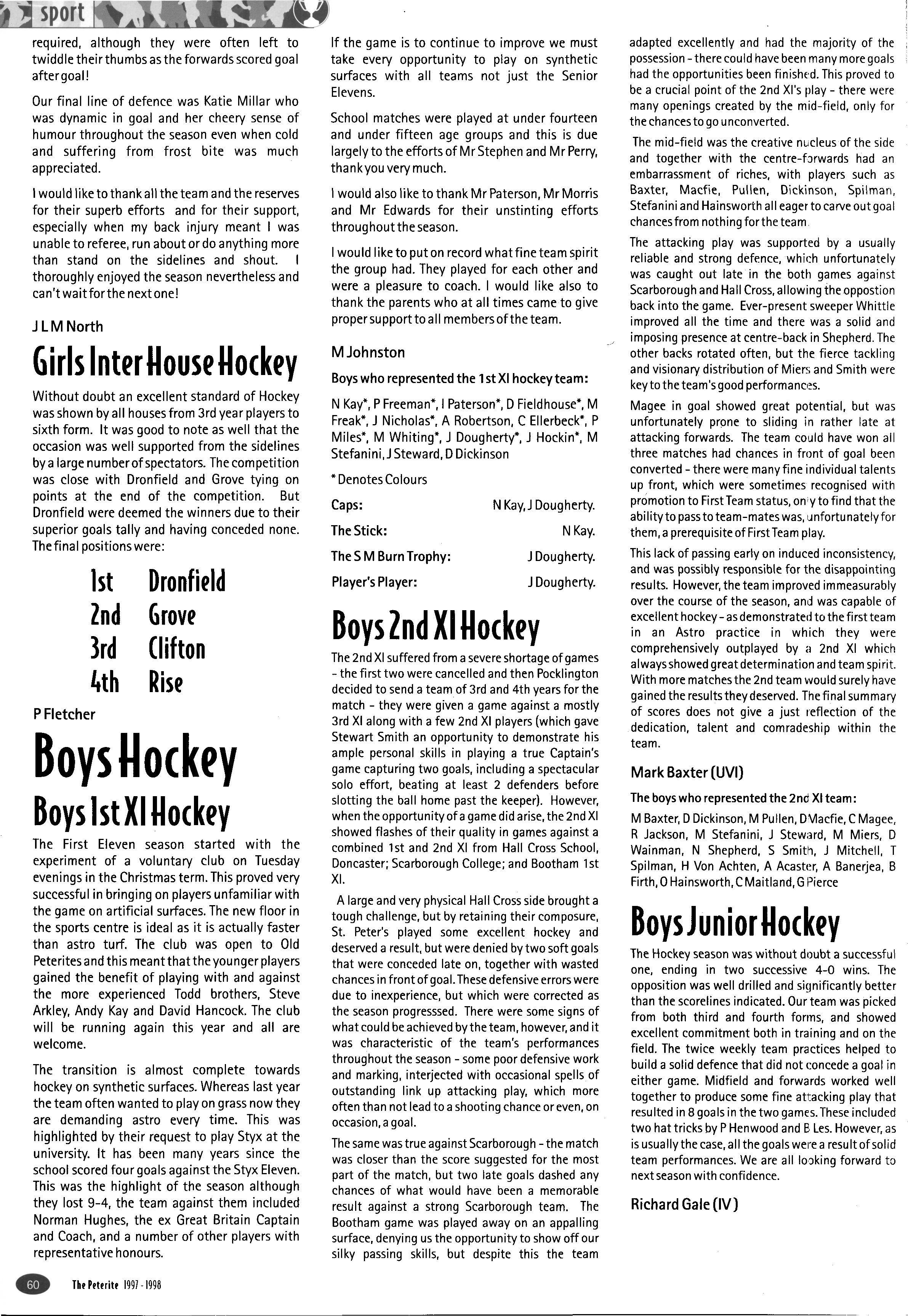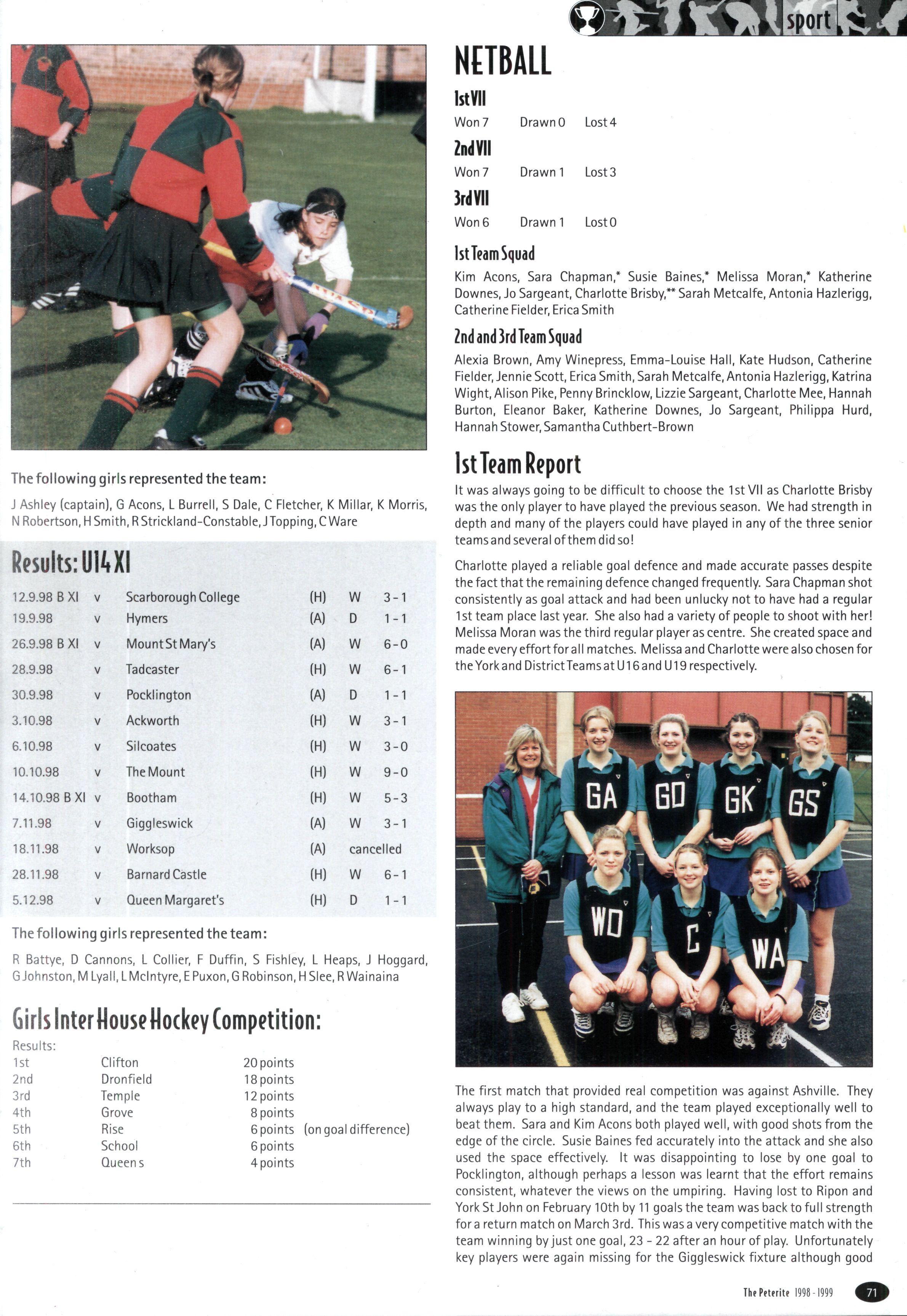 The inter-House girls' hockey was played with customary verve and determination but, unfortunately, despite our best efforts the House came sixth Somehow we found it difficult to score goals. The support team members gave each other and the spirit of the team were both superb The following played for the team: Lucy Wright, Faith Alexander, Emma Fitton, Helen Williamson, Katie Jenkins, Helen Austin, Emily Brown, Sarah Metcalfe, Alison Pike, Karly Hoggard and Louise Hudson (captain) We shall be able to field exactly the same team next year