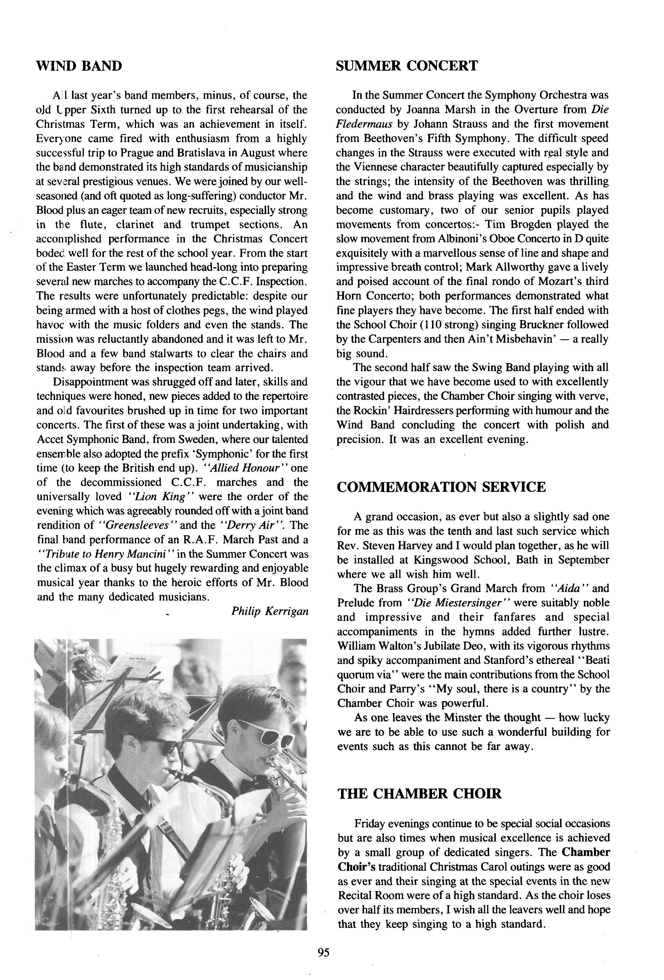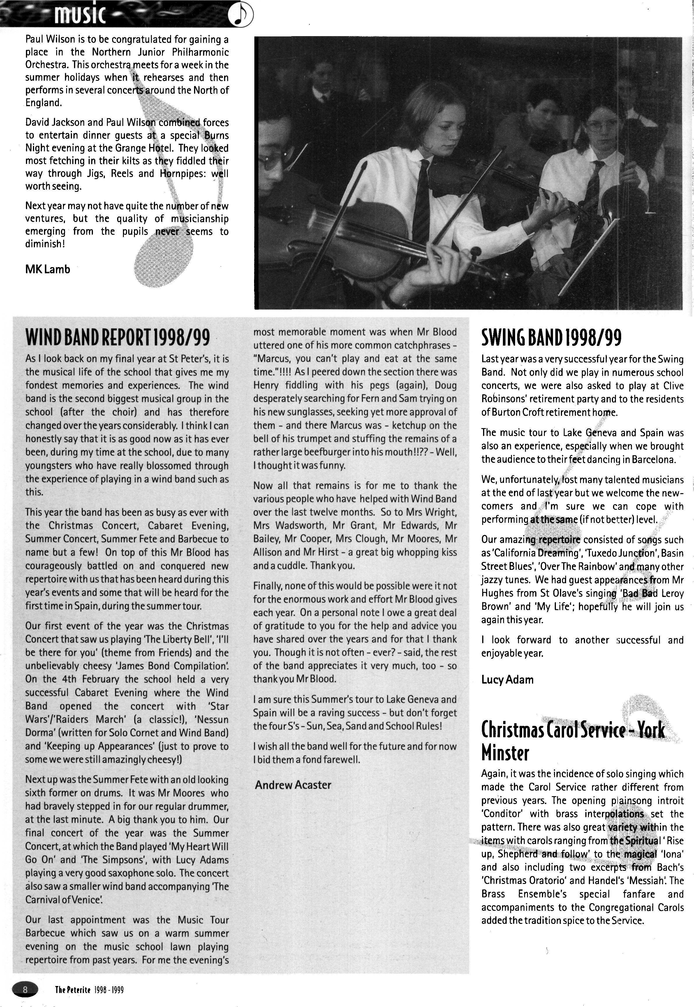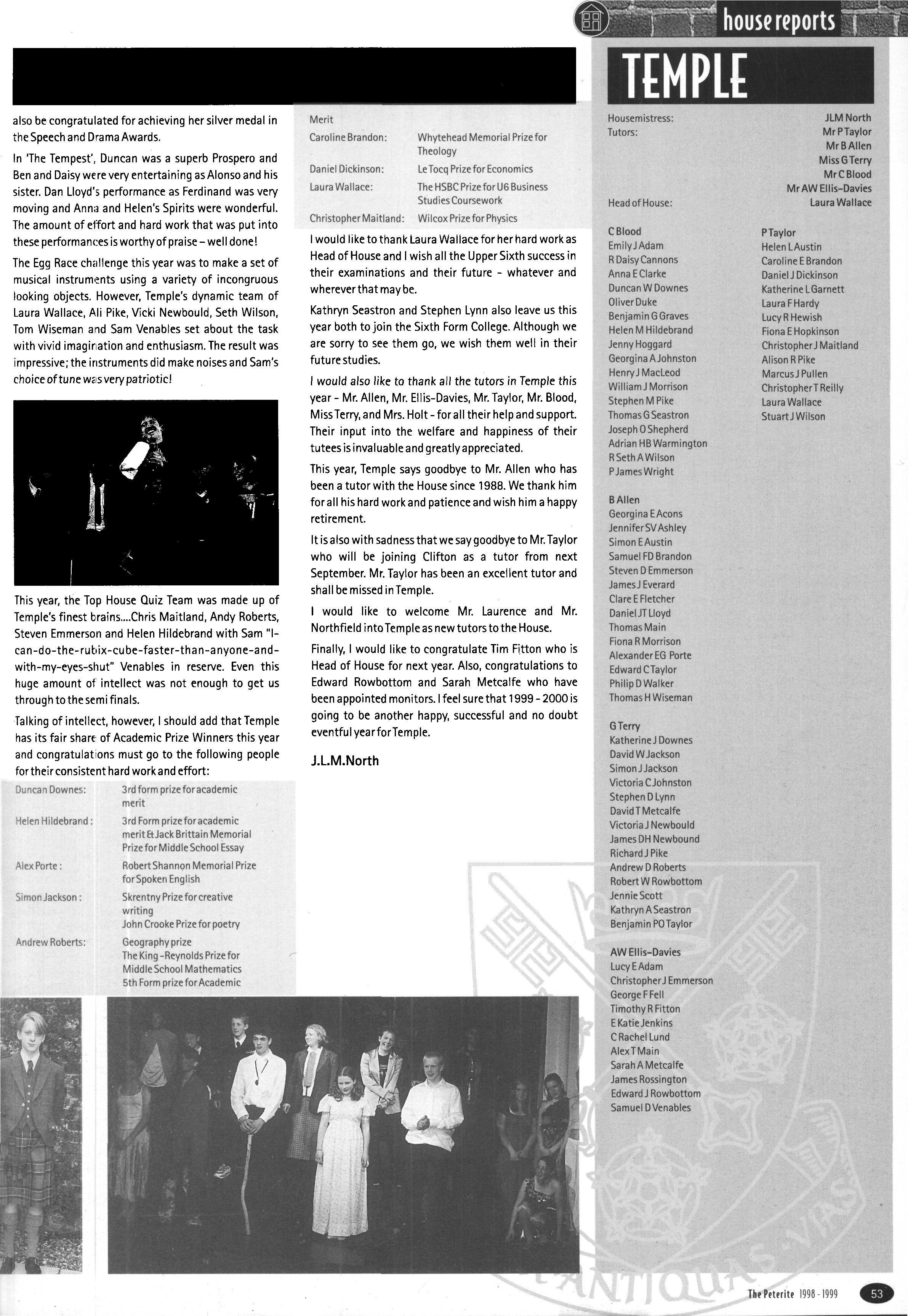 The House was also well represented intheend of term drama productions Jim Bloor and Chris Ball acted with an impressive degree of confidence and conviction in "Roots" while Catherine Hopkinson's portrayal of Alison's mother in "Look Back in Anger" was a measured and convincing performance. Richard Collier worked behind stage to ensure that everything went well Still on the cultural side, Faith Alexander and Philip Kerrigan played outstandingly in the Soloists' Concert A high proportion of the House is involved in the Choir, Band or Orchestra.