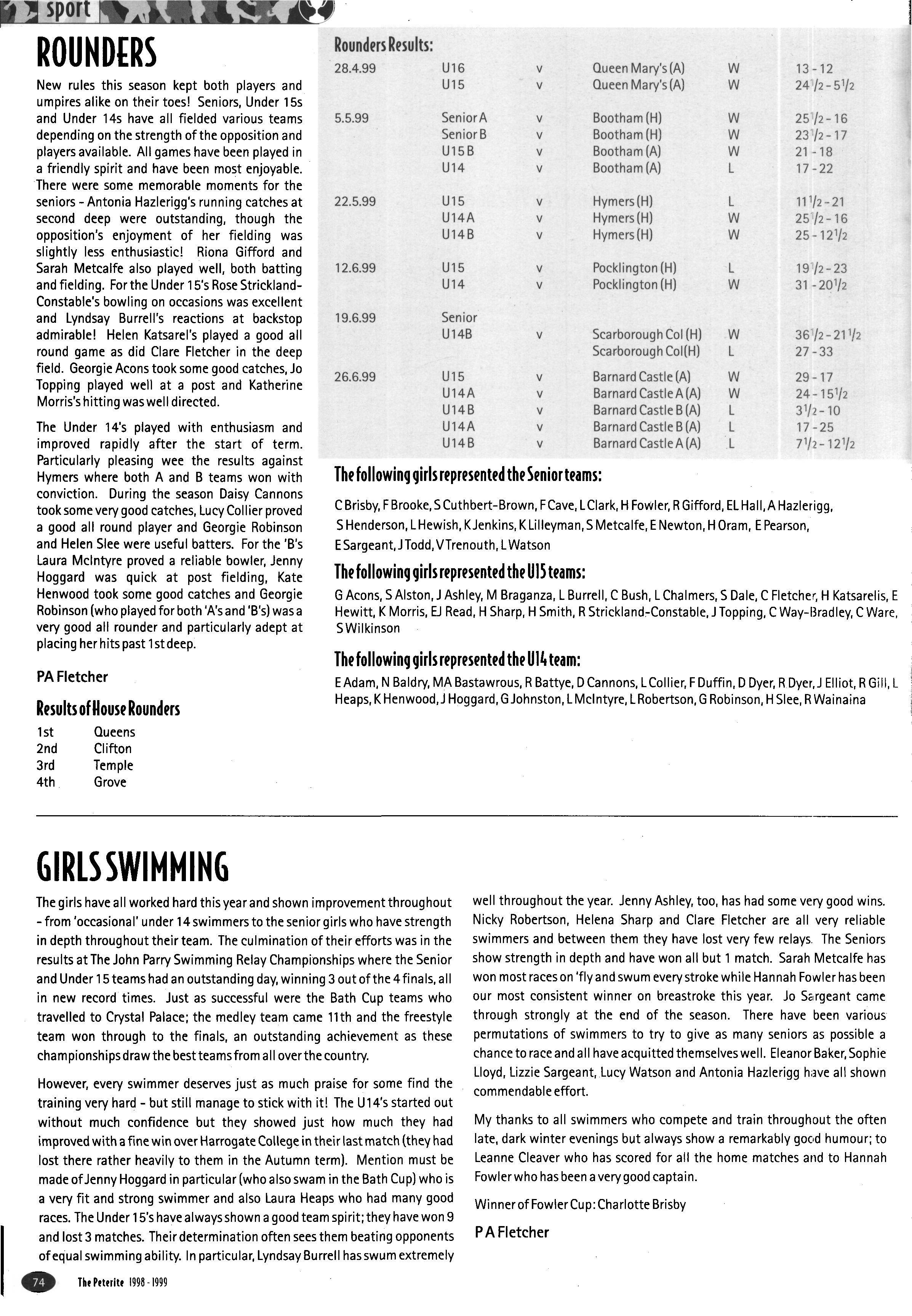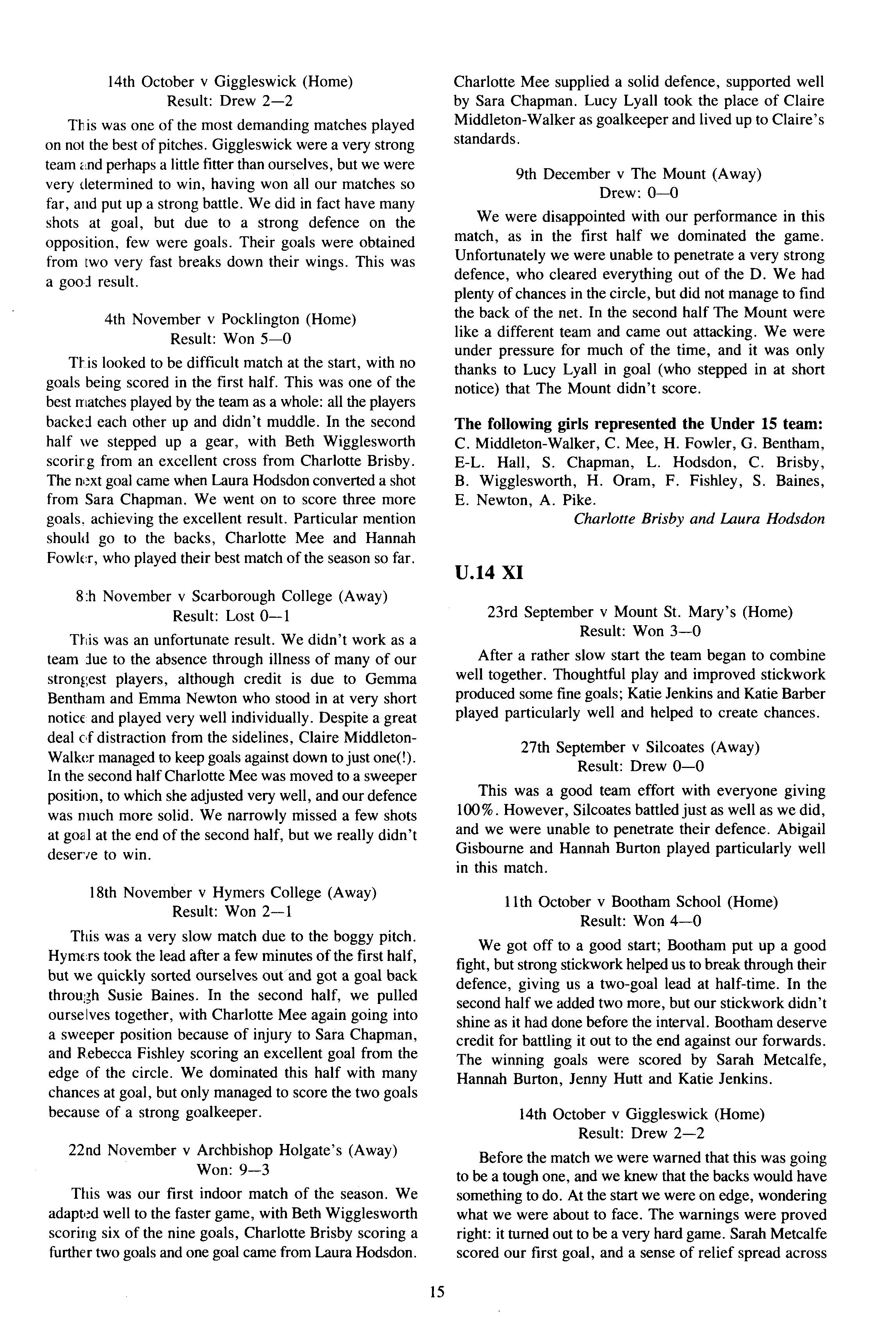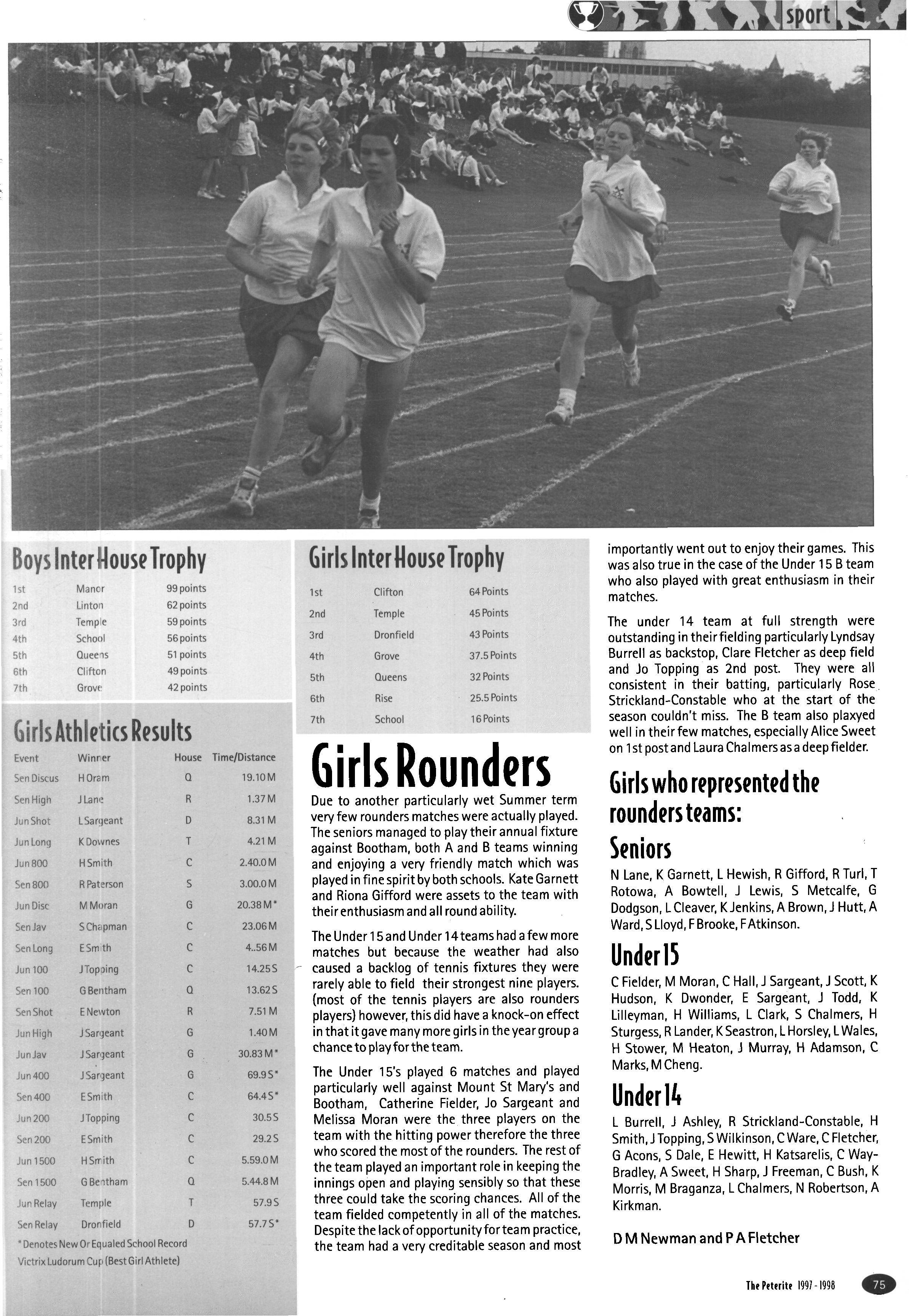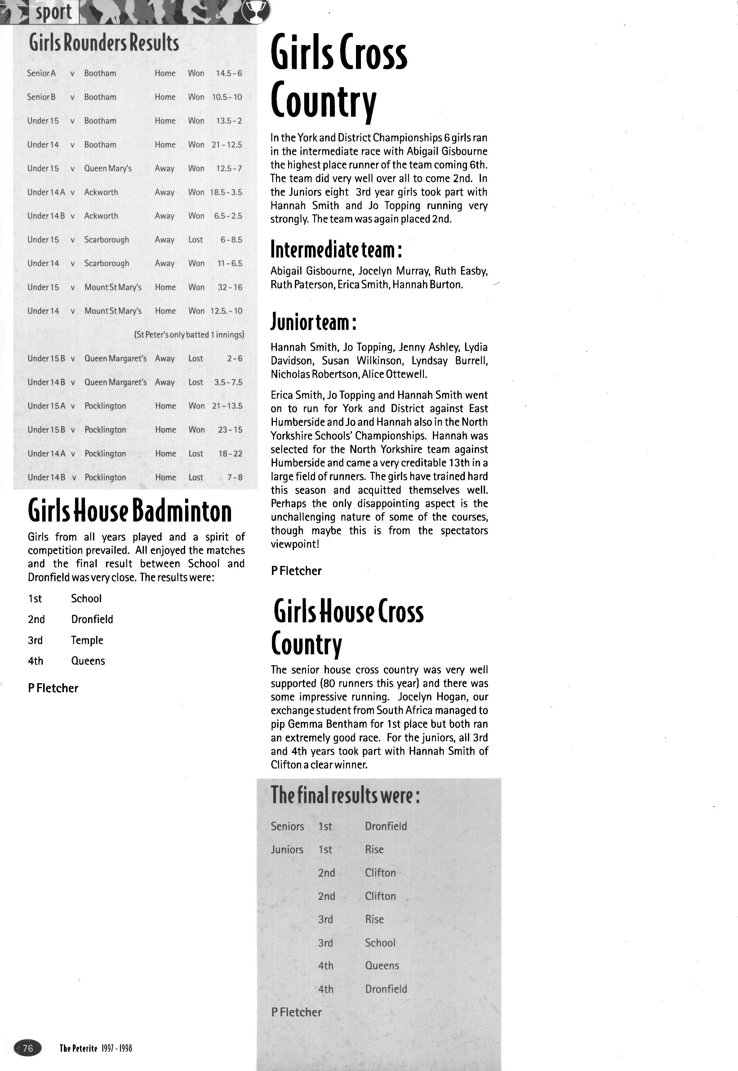 The girls' badminton team tried hard, but failed to reach the first round of the competition It was pleasing to see so many girls competing in the Cross-Country Competition Out of the fifteen senior girls eligible to compete, twelve ran Gemma Croft came 7th, Katy Ramskill 12th, Charlotte Brassington 19th and Mauricia Hart 29th out of the field of sixty-six In the Junior Competition, Ruth Paterson came 8th, Rebeccca Crowther 14th, Katie Cockill 16thand Emily Hamilton 26th In both competitions the House came fifth overall