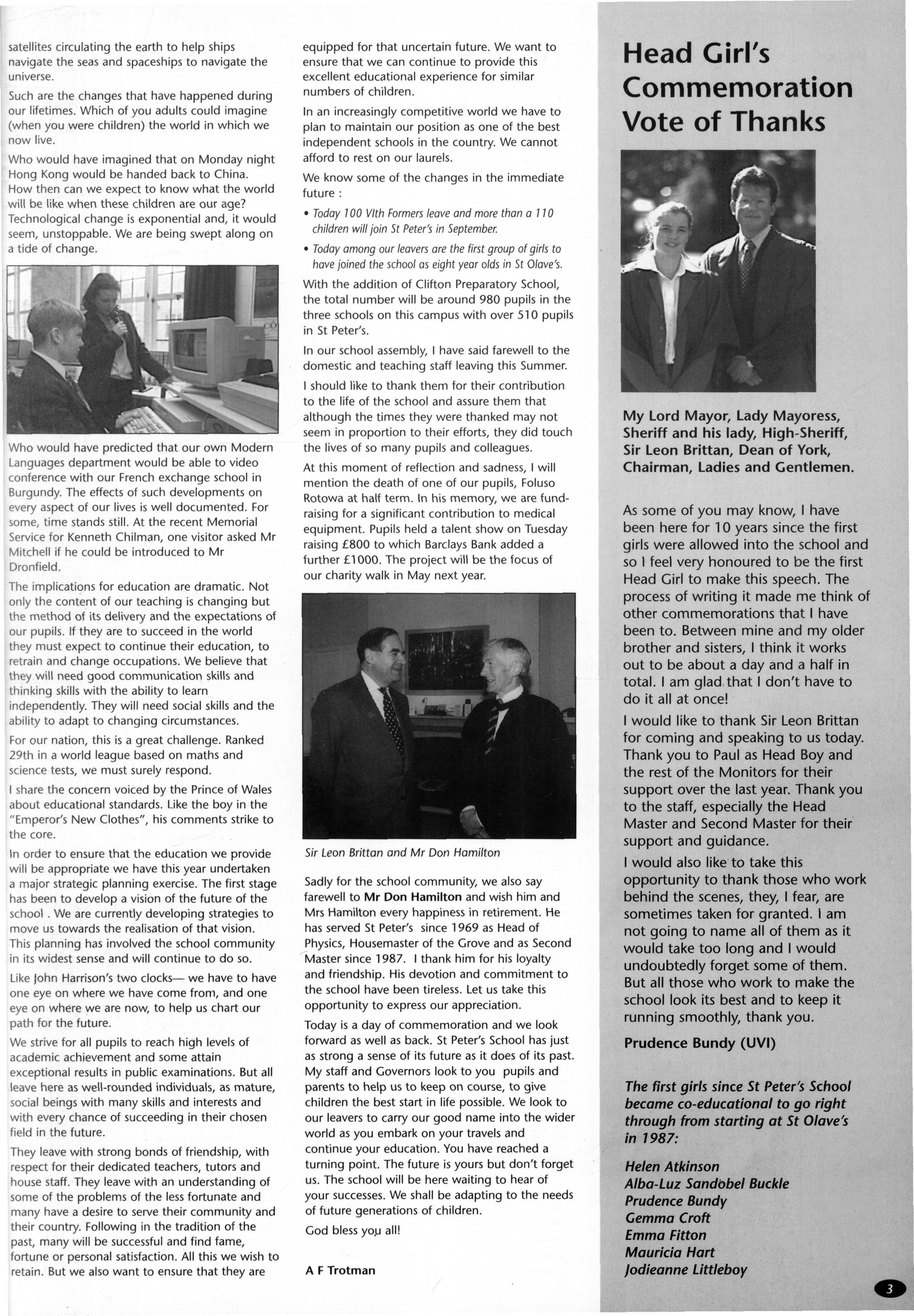 At the end of the Christmas Term, we said goodbye to Mrs Susie Roberts, the Headmaster's Secretary In his final Commemoration address last summer, Mr. Robin Pittman paid her this tribute: "Susie Roberts took over from Betty Clarkson in 1987 and has been a marvellous help to me for these last eight years Her technical skills are remarkable: just see her and hear her performing at her word-processor. But beyond that she has been such an able personal assistant, fulfilling the role of registrar for her new pupils and being both competent and charming to all the staff, parents and others with whom she deals