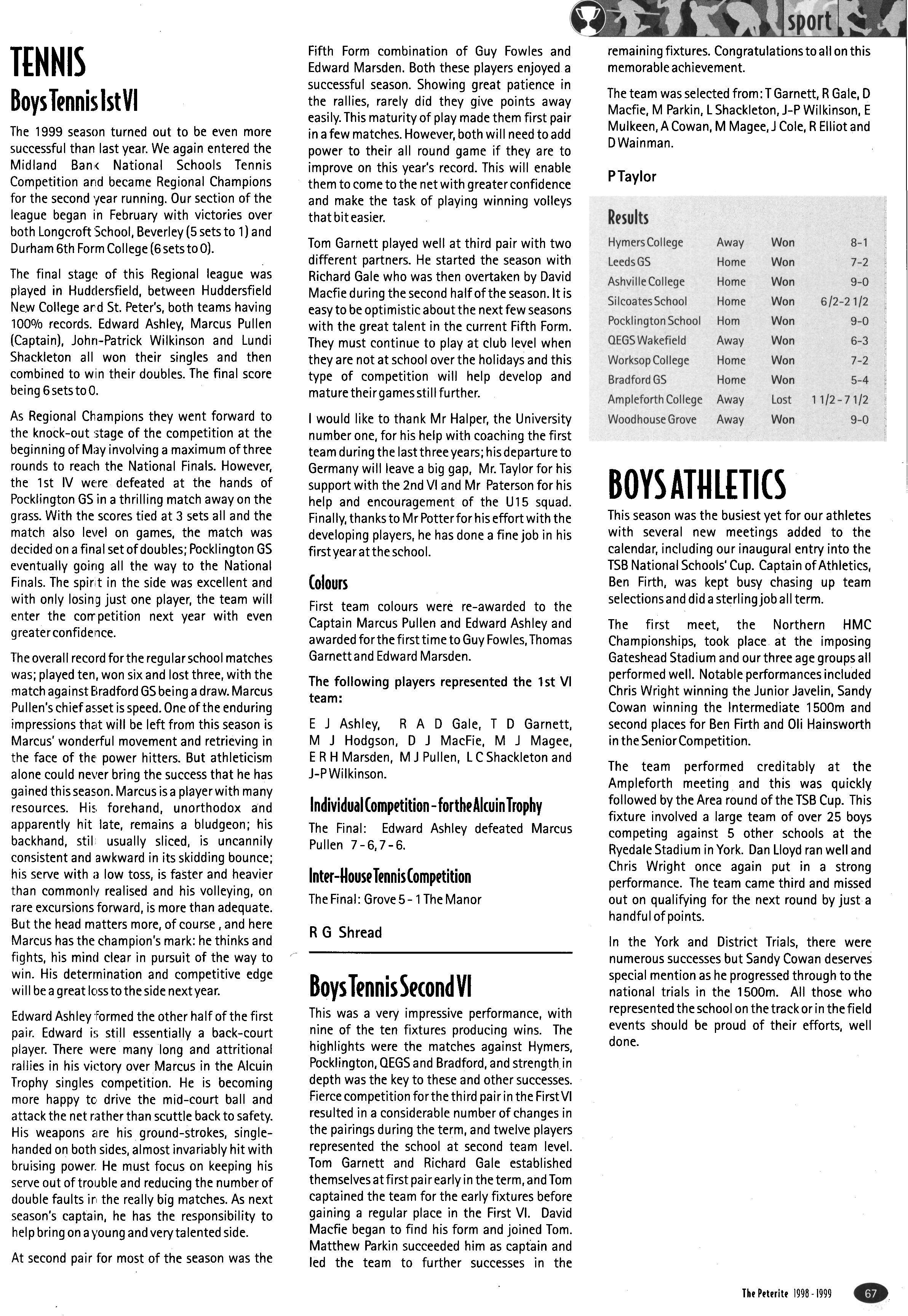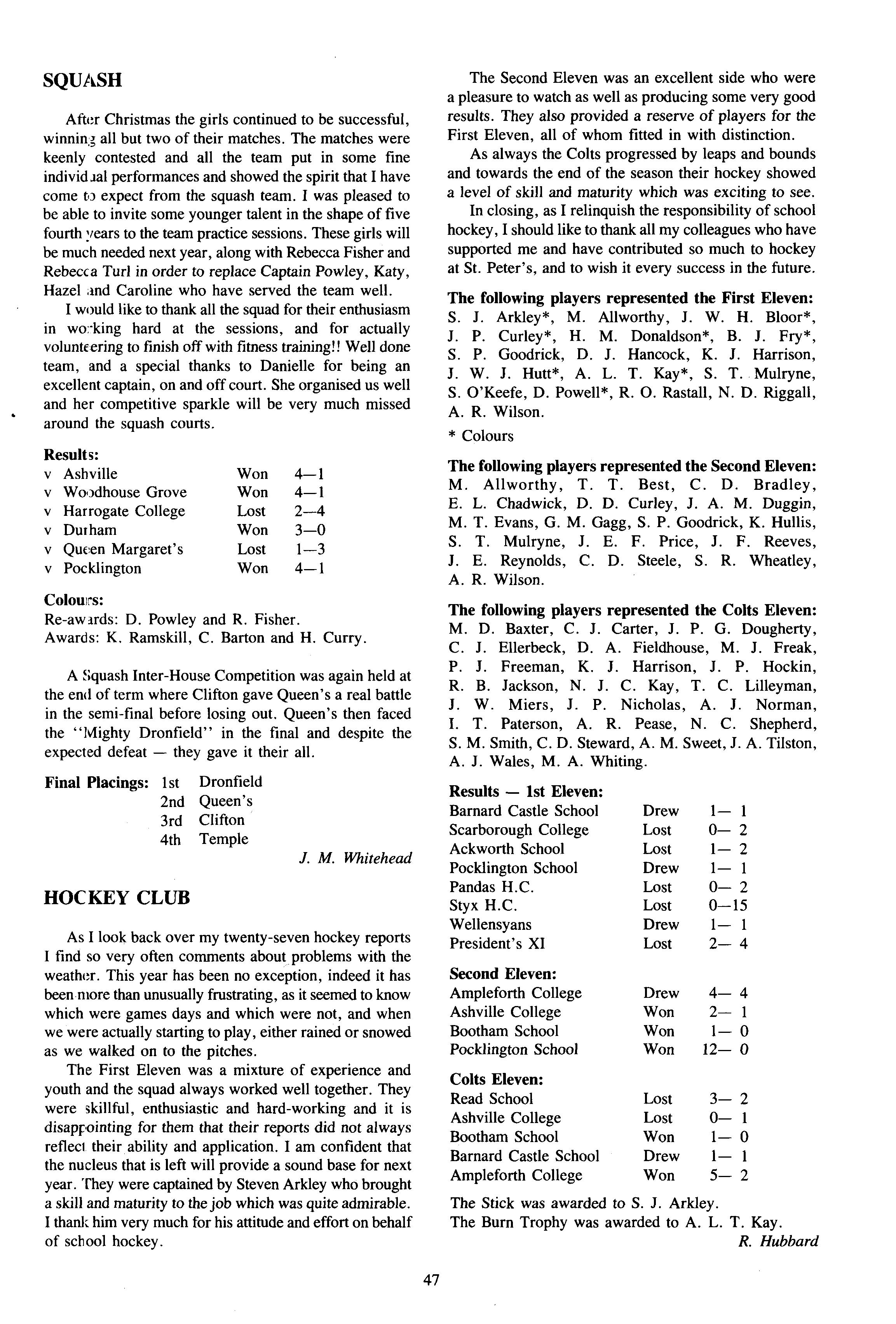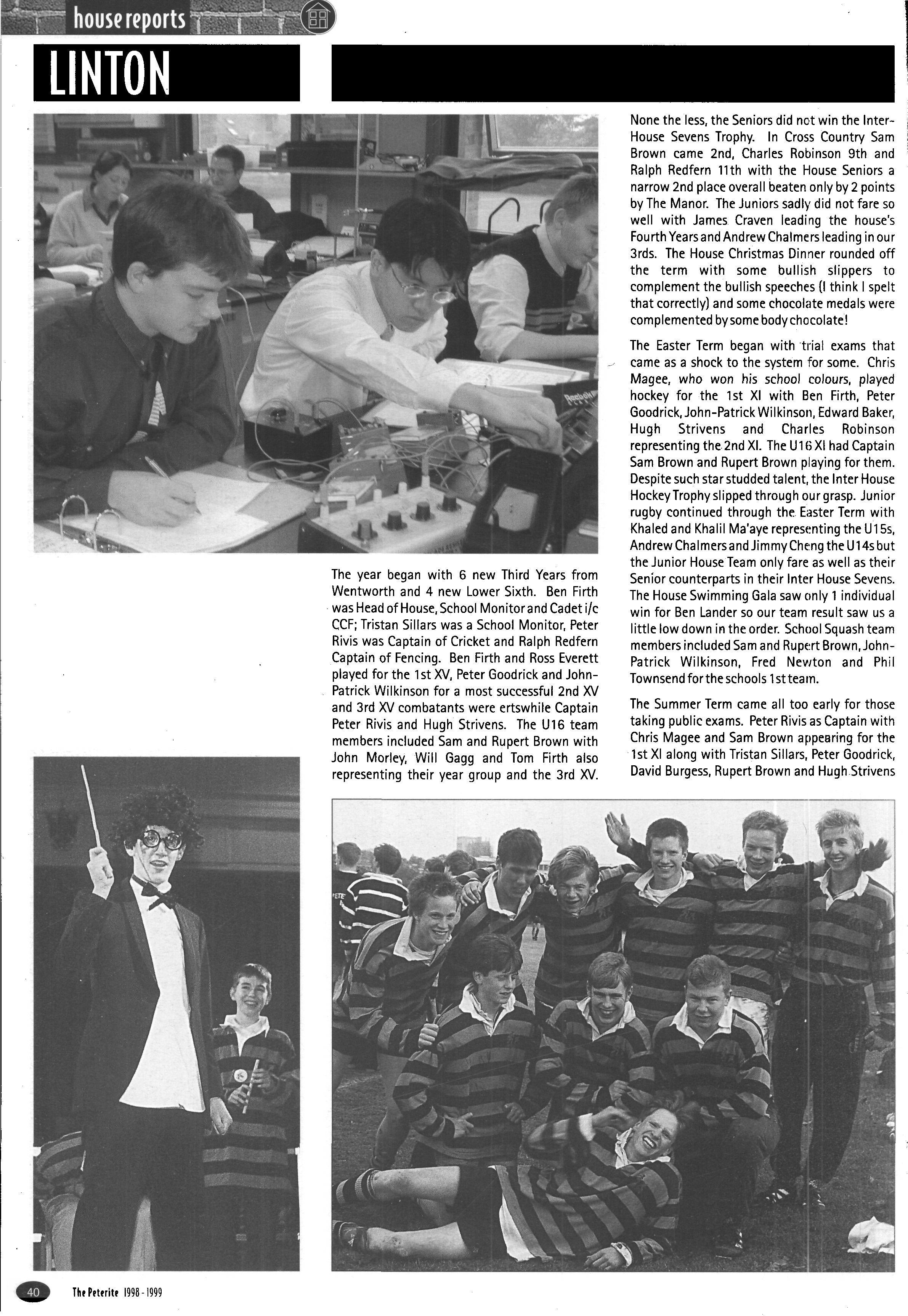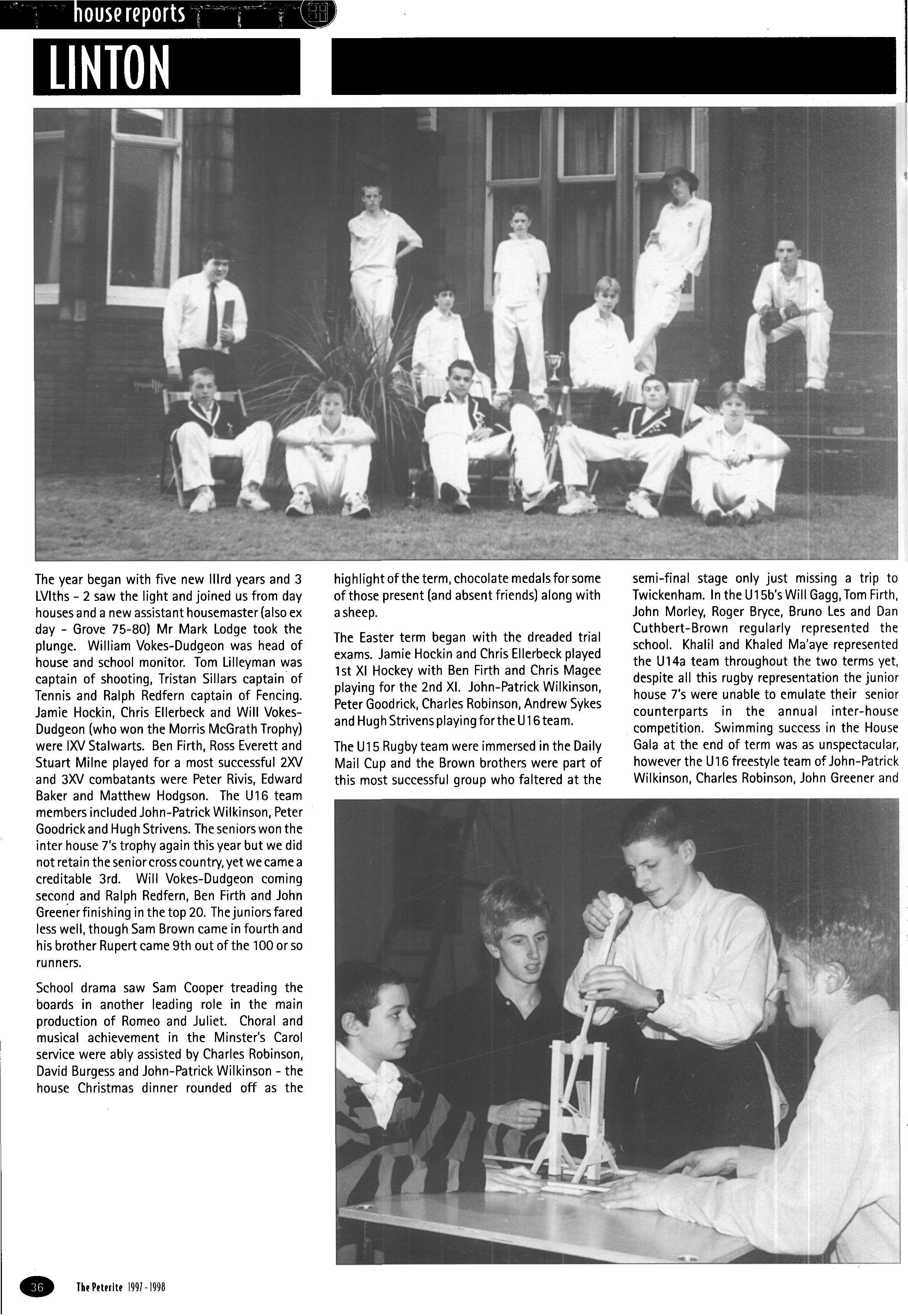 The year began with some twelve new third years and one new fourth (we gained an extra new fourth year day boarder during the term). James Mee was Head of House, James Griffith — cadet-in-charge C.C.F and Head Chorister — and Christopher Maunder was a school Monitor as well with Steven Arkley as school 1st XI hockey captain The House had some four 1stXV players, Scott O'Keefe, James Mee, Richard Rastall and Kirk Hullis — the latter winning the Morris McGrath Trophy for most-improved player —and some six other regular 2nd XV combatants The U 16 XV's ably led by James Hockin, saw some five other House members represented and six fourth years and three third years represented their year group rugby teams respectively Senior House Rugby 7's and Squash were duly fought over with some success but particular success in the inter-House cross-country where the seniors took the overall team trophy with Steve Arkley (2), Tristan Best (3), Will Vokes-Dudgeon (7), and Chris Ellerbeck (9) all finishing in the top ten (out of some 120 runners) and Ralph Redfern coming in sixth for the juniors