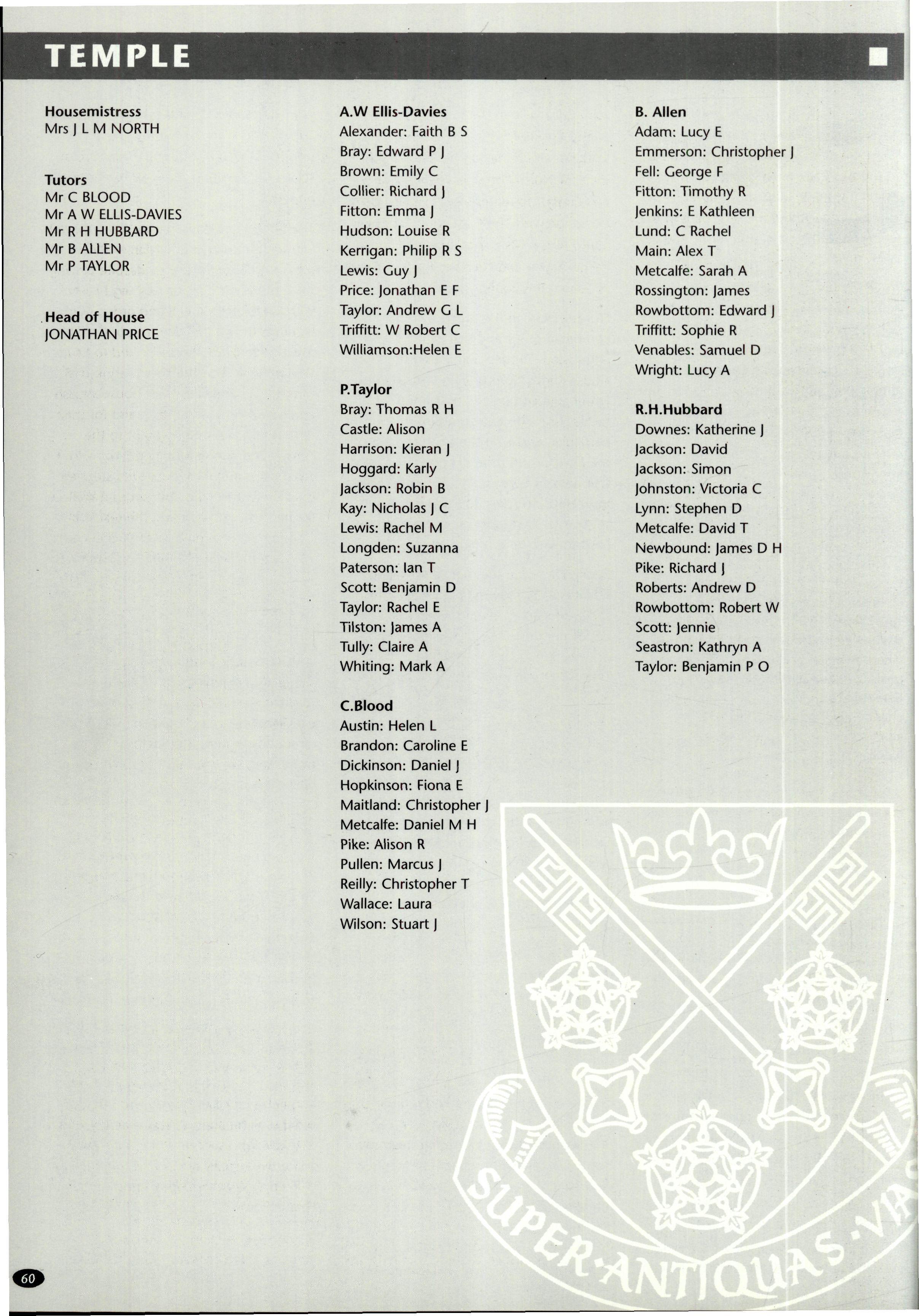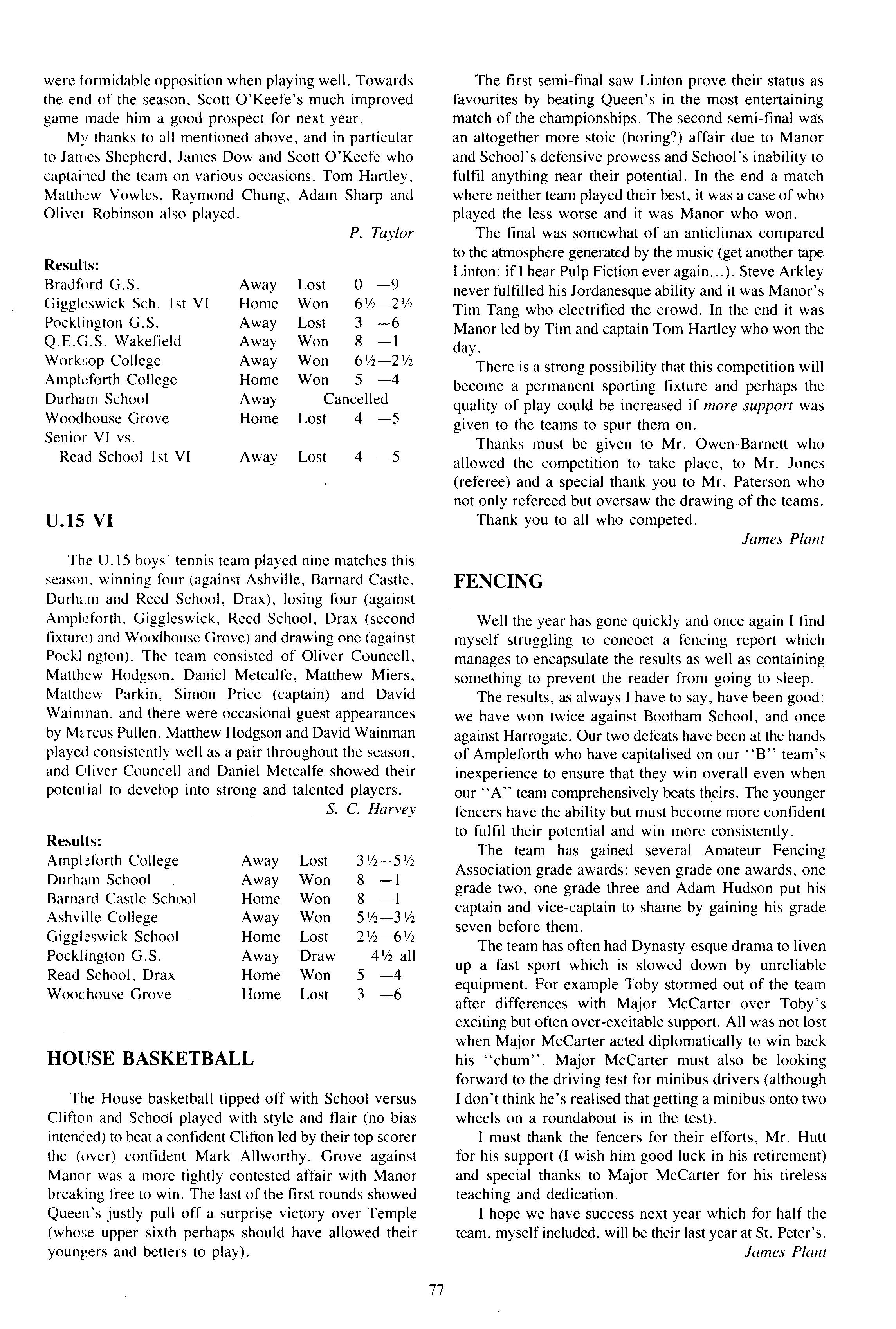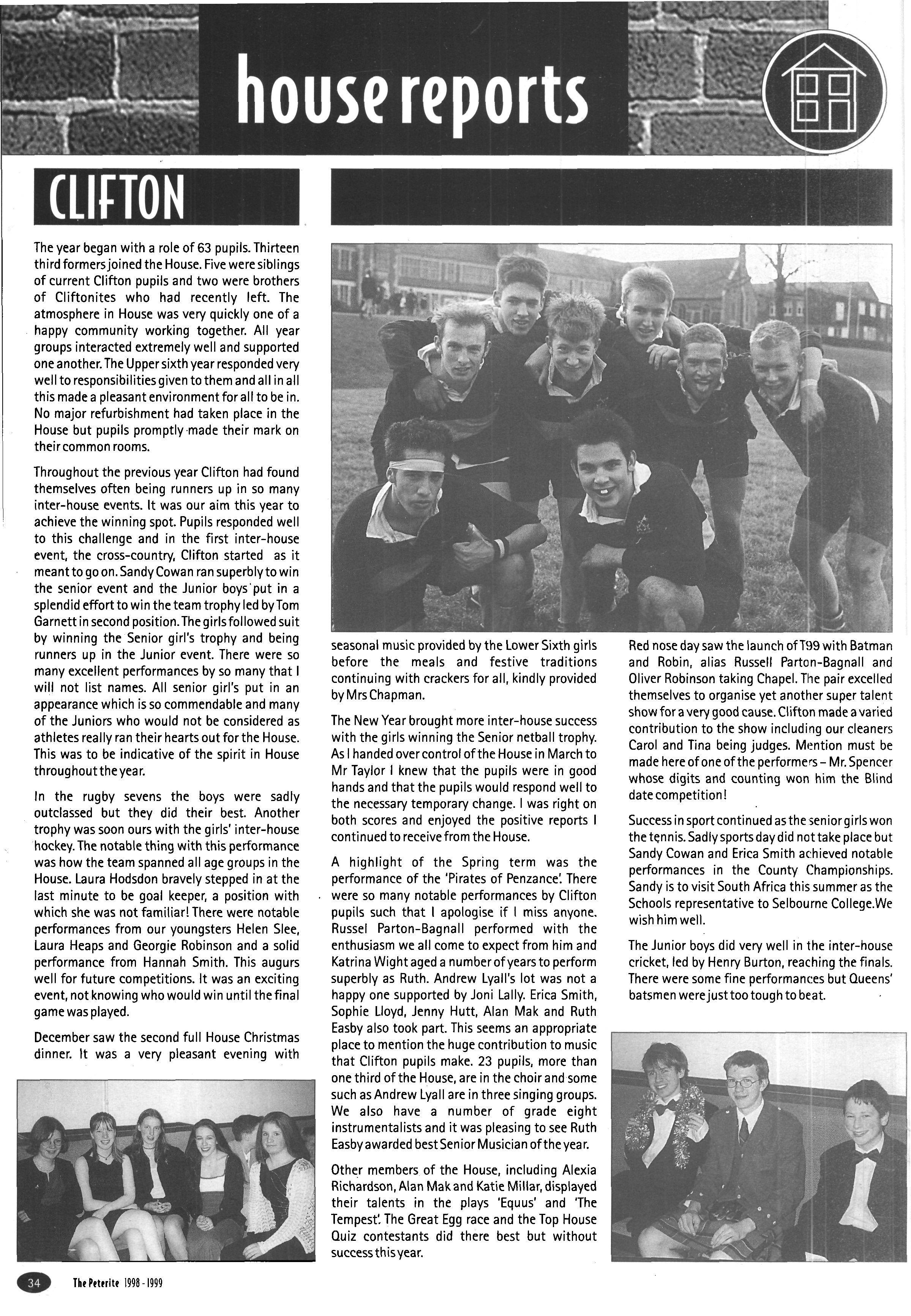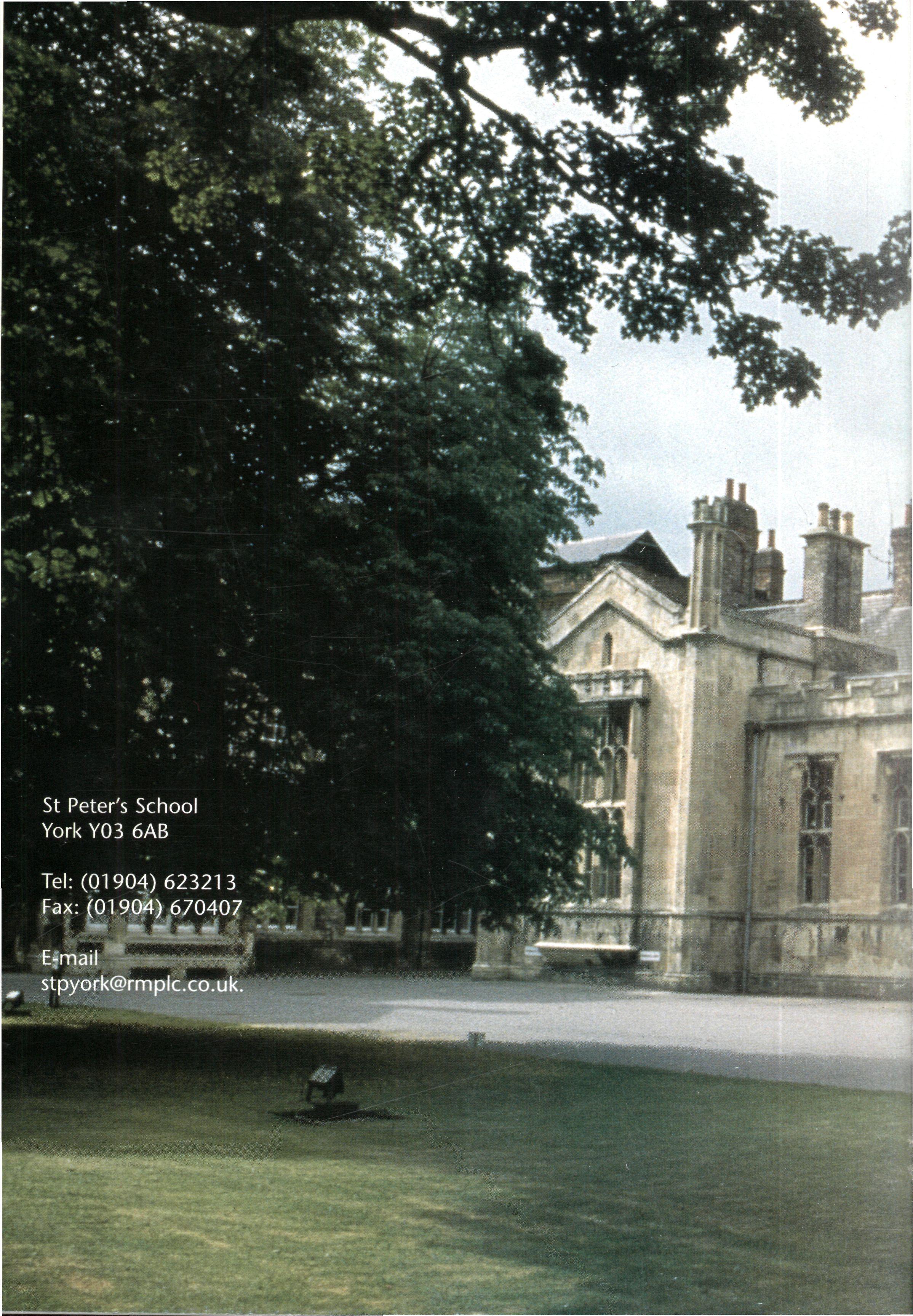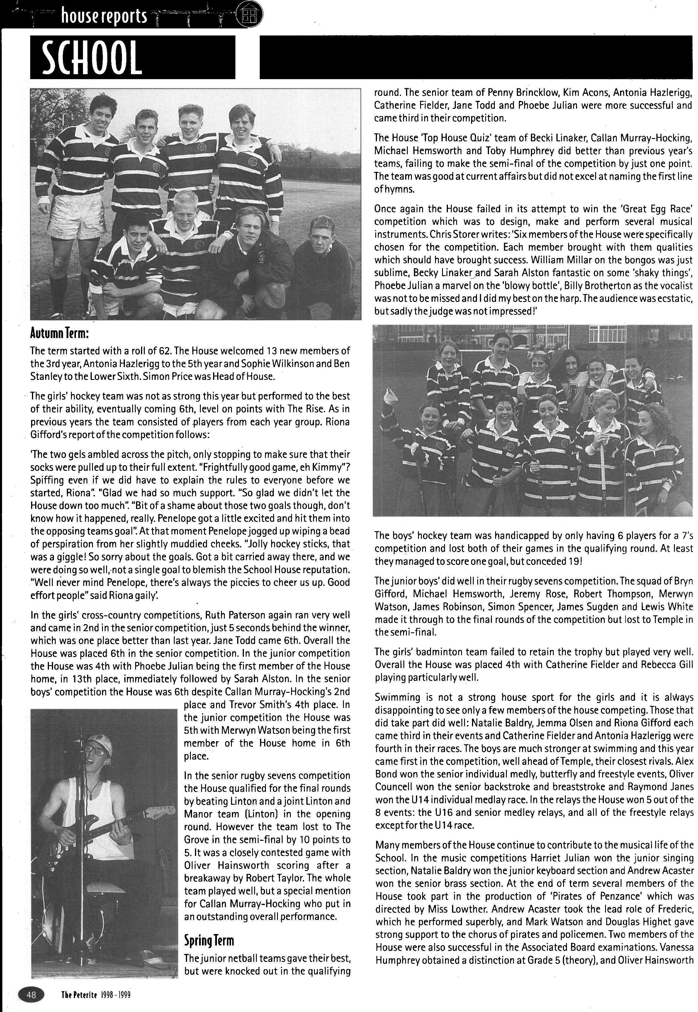 In its second year as a day House, the House started with a roll of sixty-one, but this soon went up to sixtytwo (thirty-eight boys and twenty-four girls) when Fraser Dunn returned to continue his studies at St Peter's Head of House was Stephen Mulryne and four other members of the upper sixth, Katy Ramskill, Emma Sherbourne, Paul Fotherby and James Duggin, were also School Monitors After the usual first day arrangement and rearrangement of who should be in which lower sixth study, the House got down to a long term of hard work The first decision the House had to make was whether to buy a fridge or microwave with money from the embellishment fund The House was fairly equally split on this and so it was left to the Head of House to make the final decision Being a person who likes his food, a microwave was bought It has been money well spent, with many members of the House using it and despite my reservations, the kitchen has been left reasonably tidy each day If there was any washing-up needed, then there was always someone who had failed to sign out the previous day who could make amends by tidying the kitchen