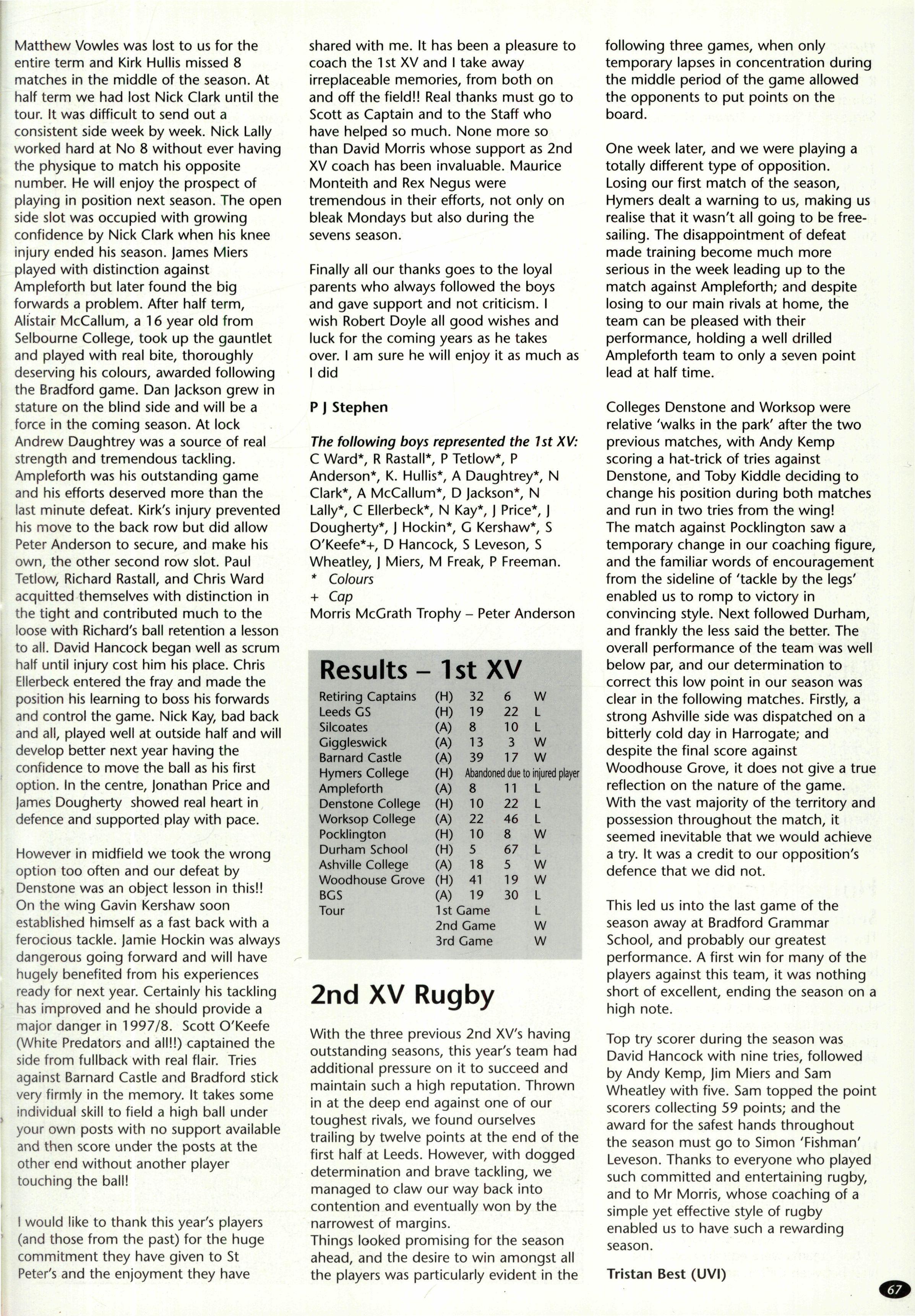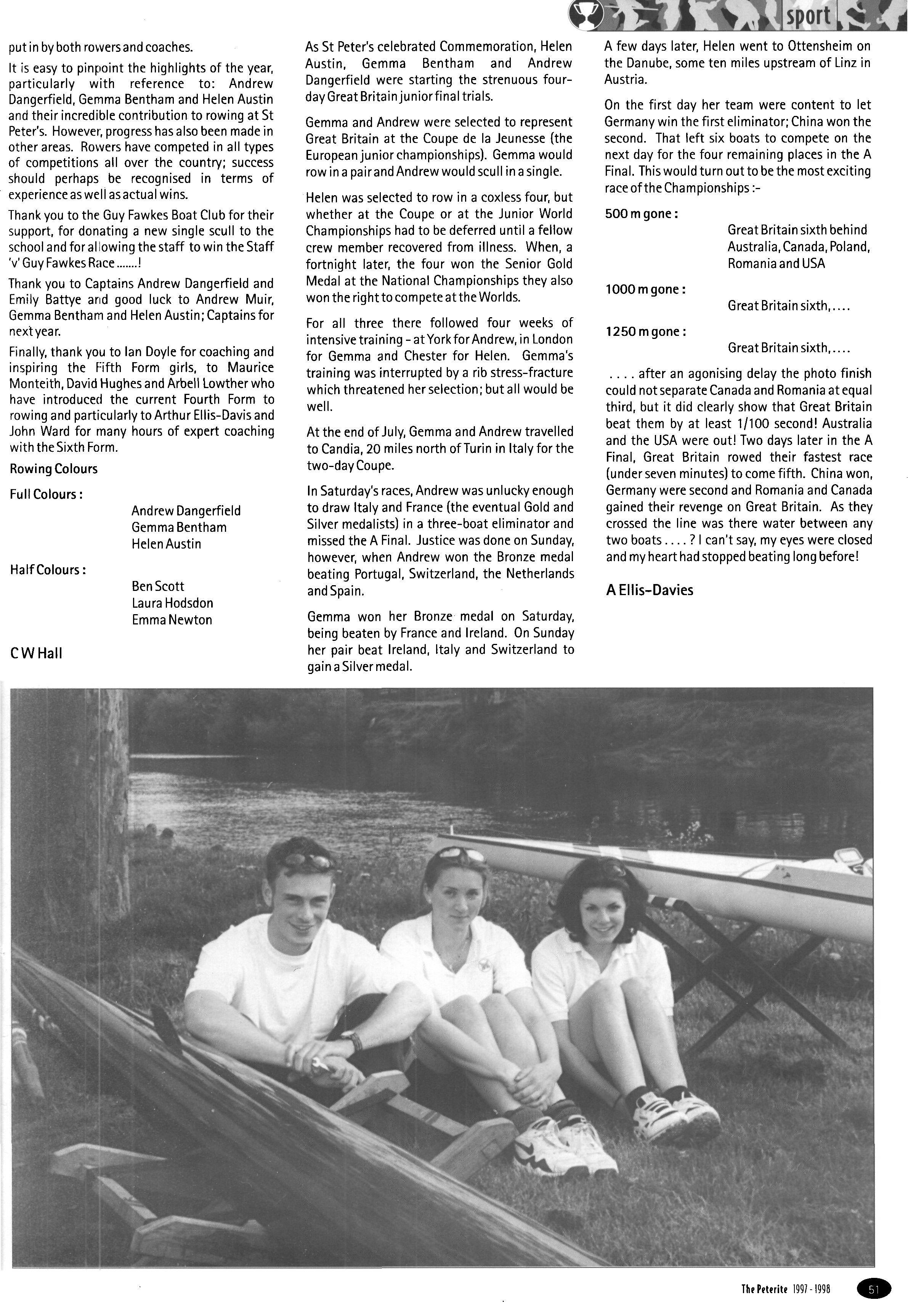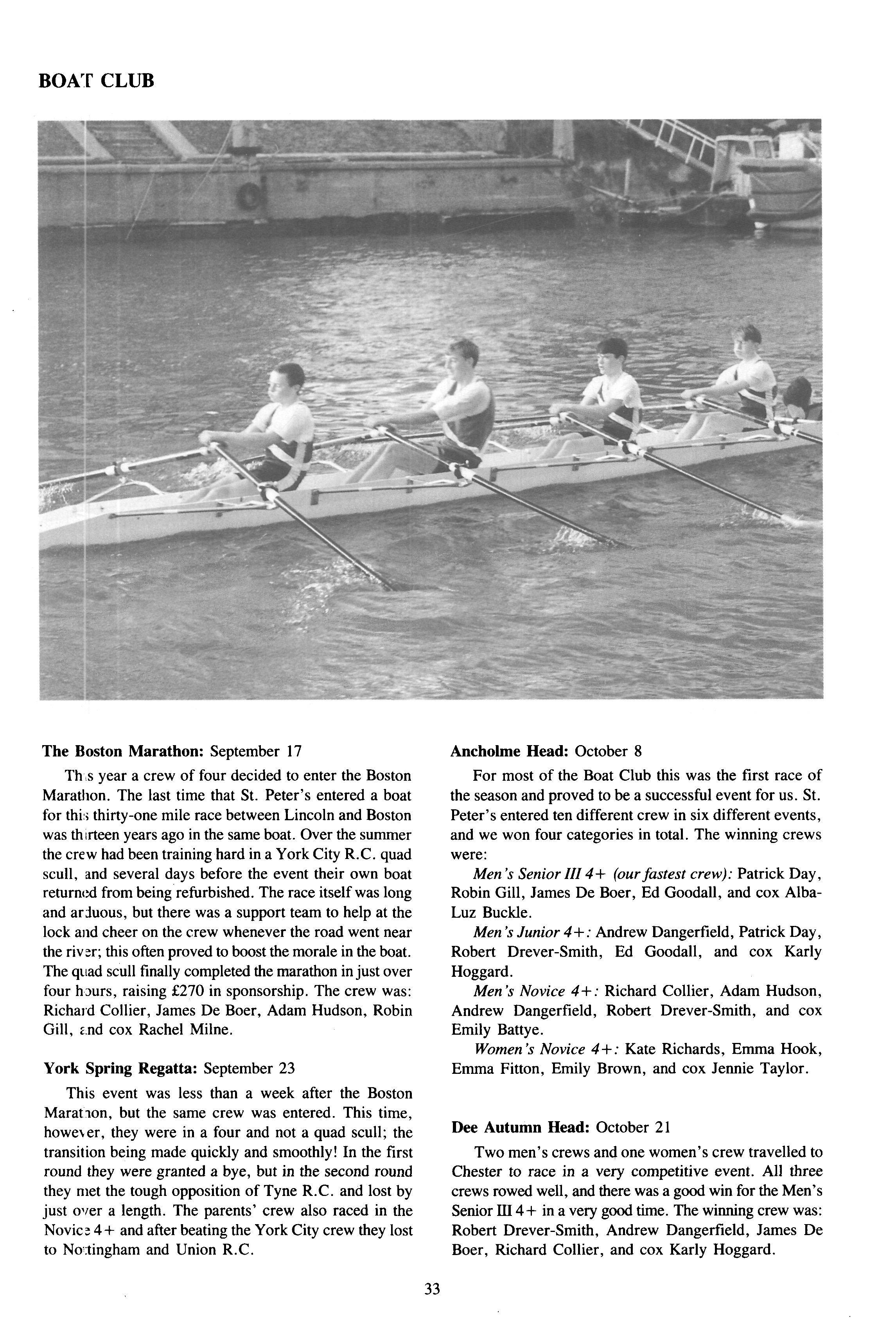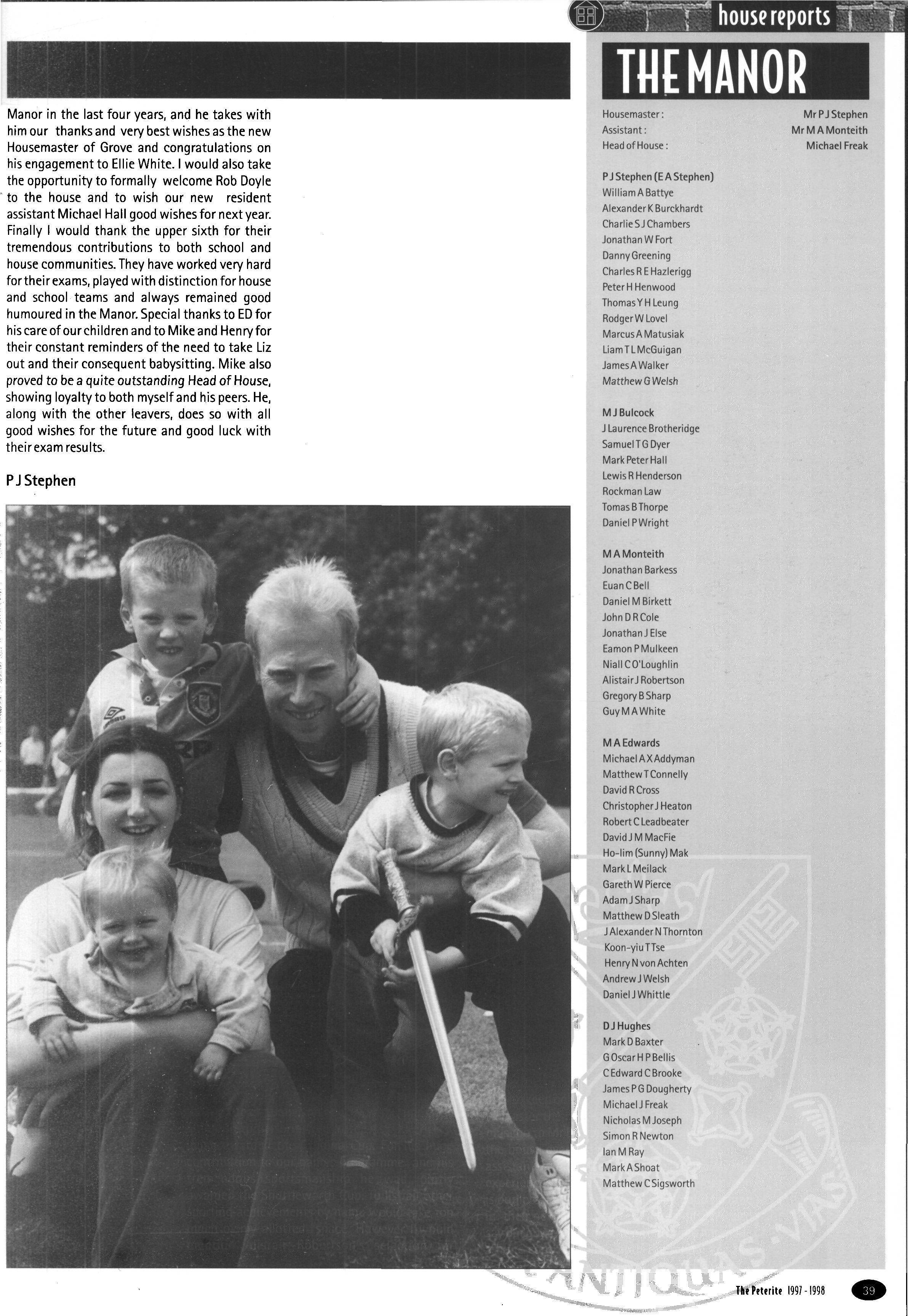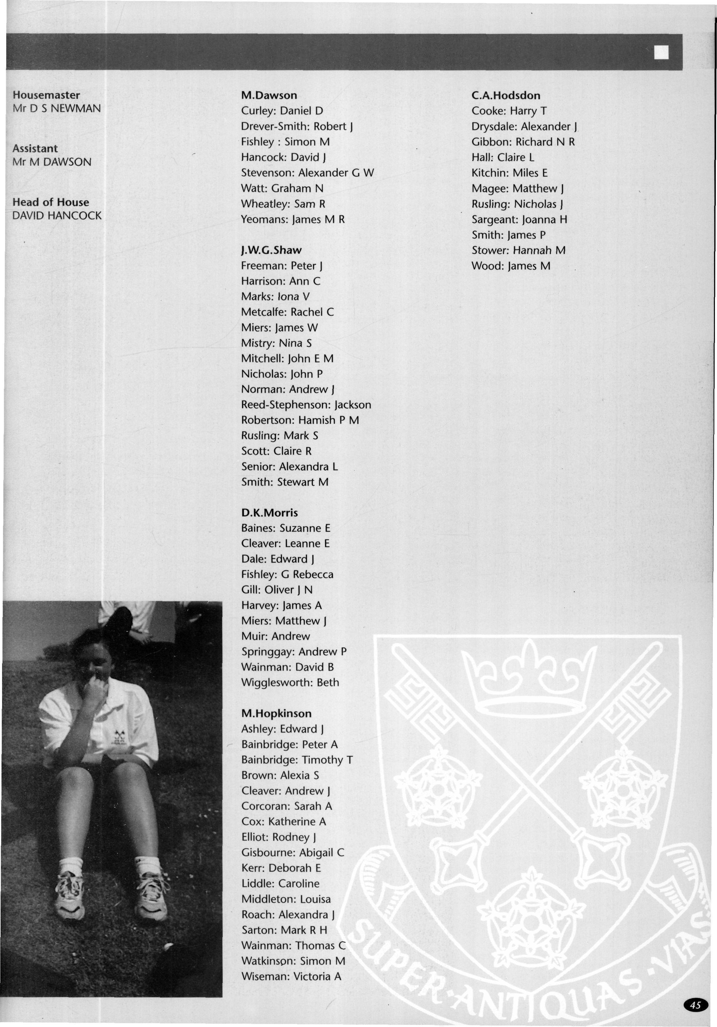 In its second year as a day House, the House started with a roll of sixty-one, but this soon went up to sixtytwo (thirty-eight boys and twenty-four girls) when Fraser Dunn returned to continue his studies at St Peter's Head of House was Stephen Mulryne and four other members of the upper sixth, Katy Ramskill, Emma Sherbourne, Paul Fotherby and James Duggin, were also School Monitors After the usual first day arrangement and rearrangement of who should be in which lower sixth study, the House got down to a long term of hard work The first decision the House had to make was whether to buy a fridge or microwave with money from the embellishment fund The House was fairly equally split on this and so it was left to the Head of House to make the final decision Being a person who likes his food, a microwave was bought It has been money well spent, with many members of the House using it and despite my reservations, the kitchen has been left reasonably tidy each day If there was any washing-up needed, then there was always someone who had failed to sign out the previous day who could make amends by tidying the kitchen