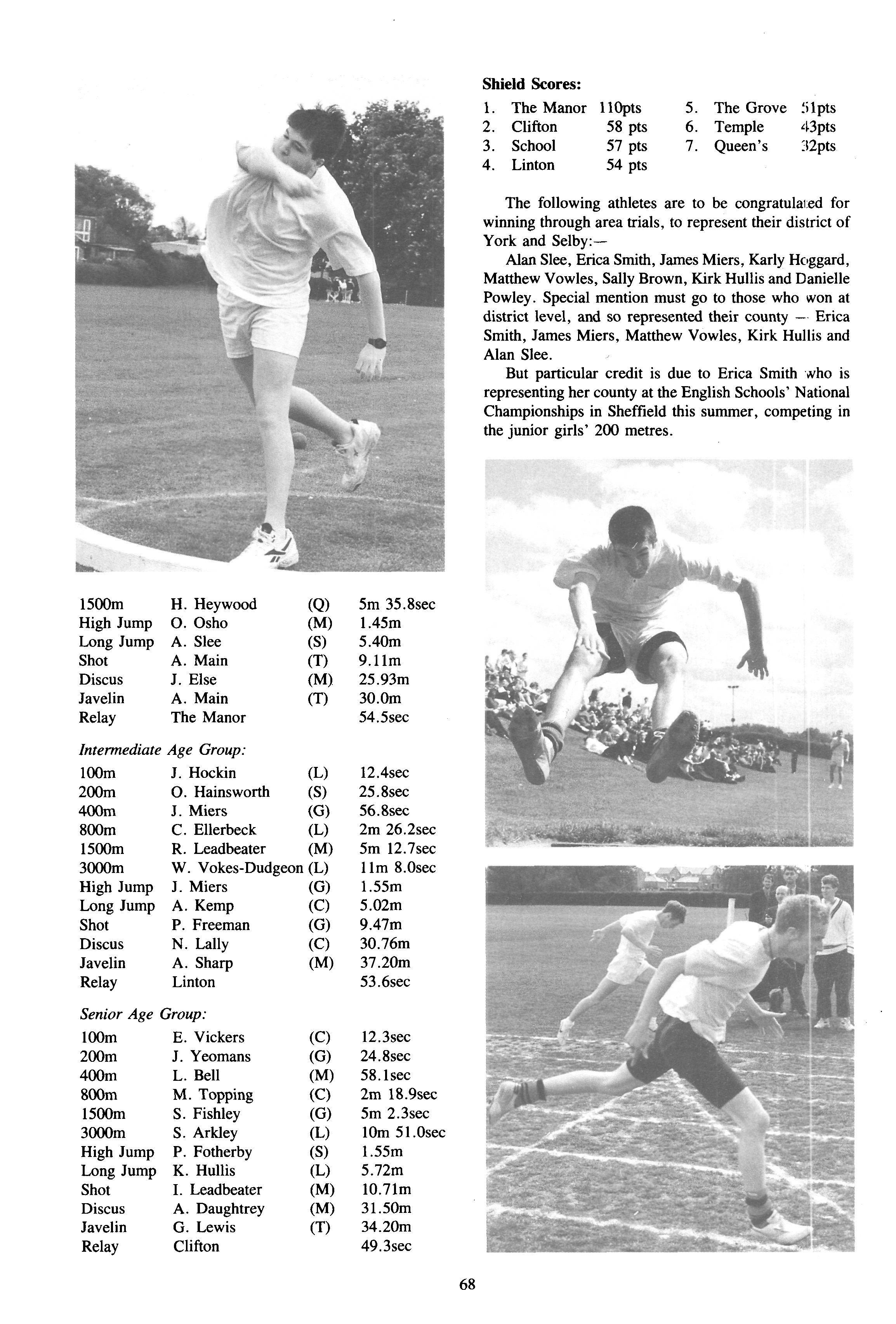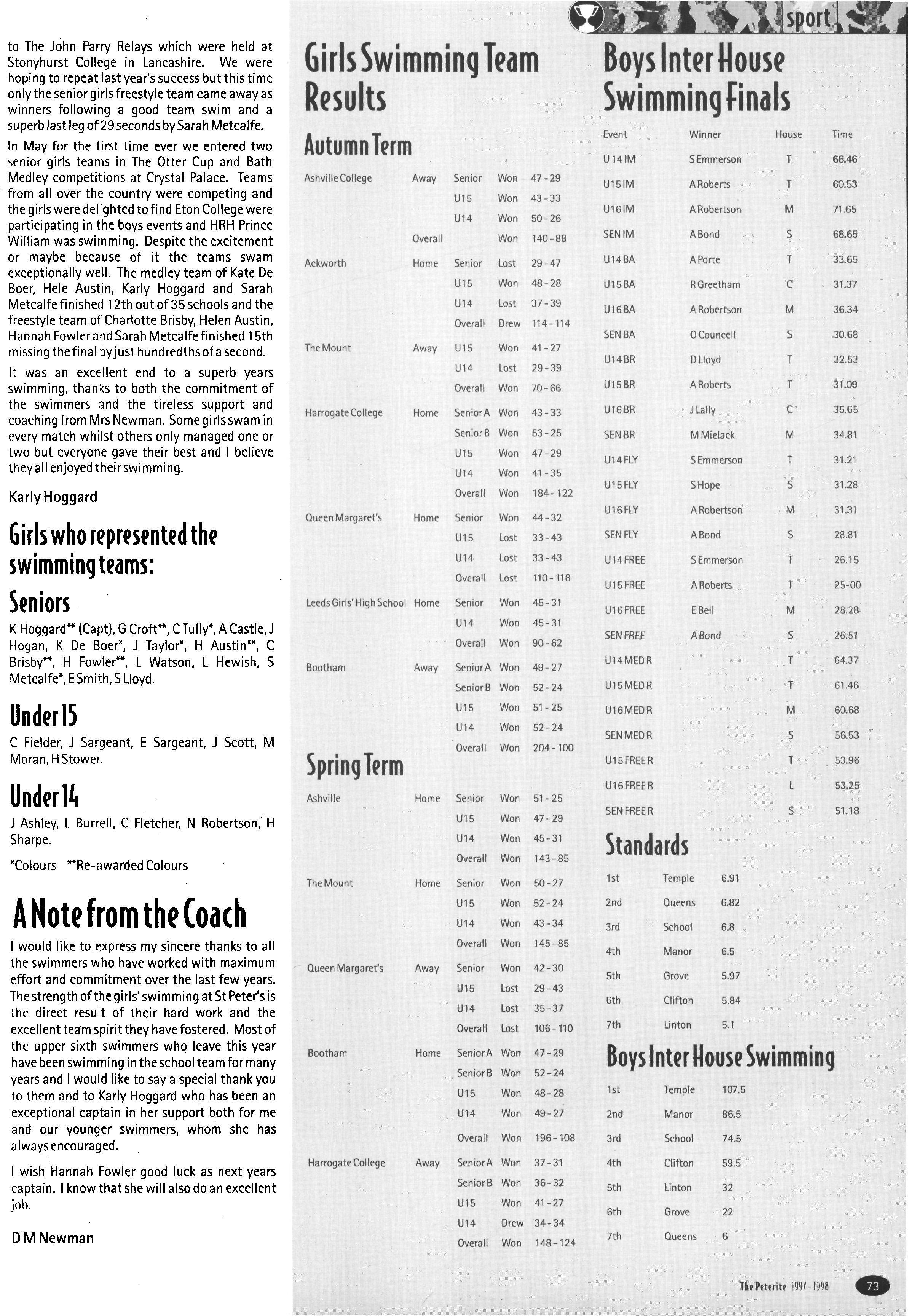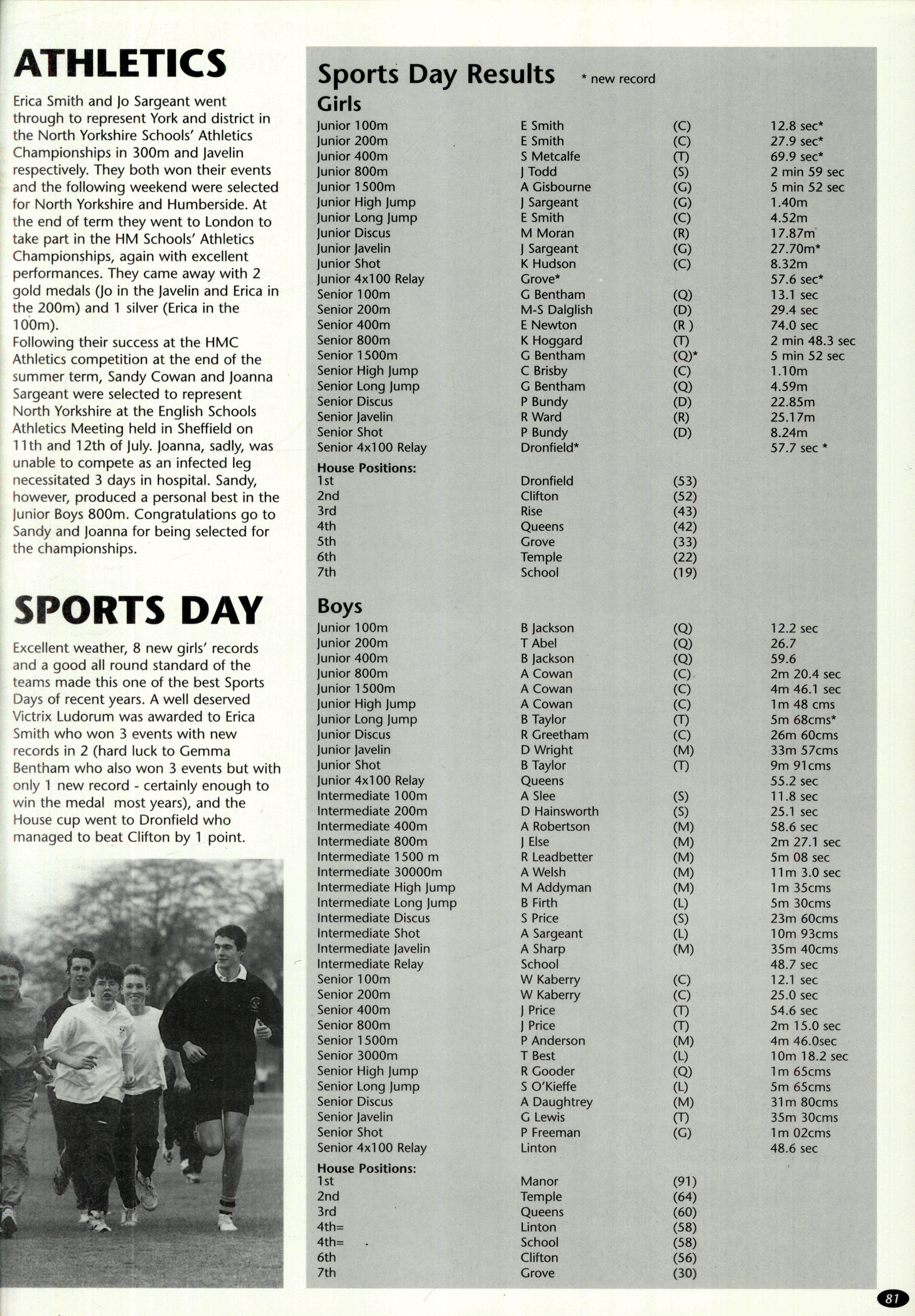 The: first inter-House competition earlier in the term had been the Girls' Cross-Country which had been moved from the Easter Term to avoid over-crowding of events in that term In an unprecedented break from House tradition, Emily Brown organised a House cross-country practice Nothing like this had ever happened before and Emily had clearly started a new tradition. Karly Hoggard won the seniors by a large margin and Sarah Metcalfe came second in thejuniors in another fine performance Helen Austin (22nd), Katie Jenkins (25th), Lucy Wright (30th), Alison Pike (39th) and Lucy Adam (40th) were, along with Sarah Metcalfe, our first six home. In the seniors our first six home including Karly were: Emily Brown (18th), Helen Williamson (21st), Faith Alexander (26th), Rachel Taylor (33rd), and Emma Fitton (34th) We came fourth overall in the seniors and sixth in the juniors. Karly Hoggard has had an outstanding season with Rowntrees A.C and as well as several fine individual performances (third at Sewerby, fifth at Scunthorpe, sixth at West Yorkshire) Karly has run for West Yorkshire and came eighth in the Yorkshire Cross-Country Championships at Barnsley in early December — well done, Karly!