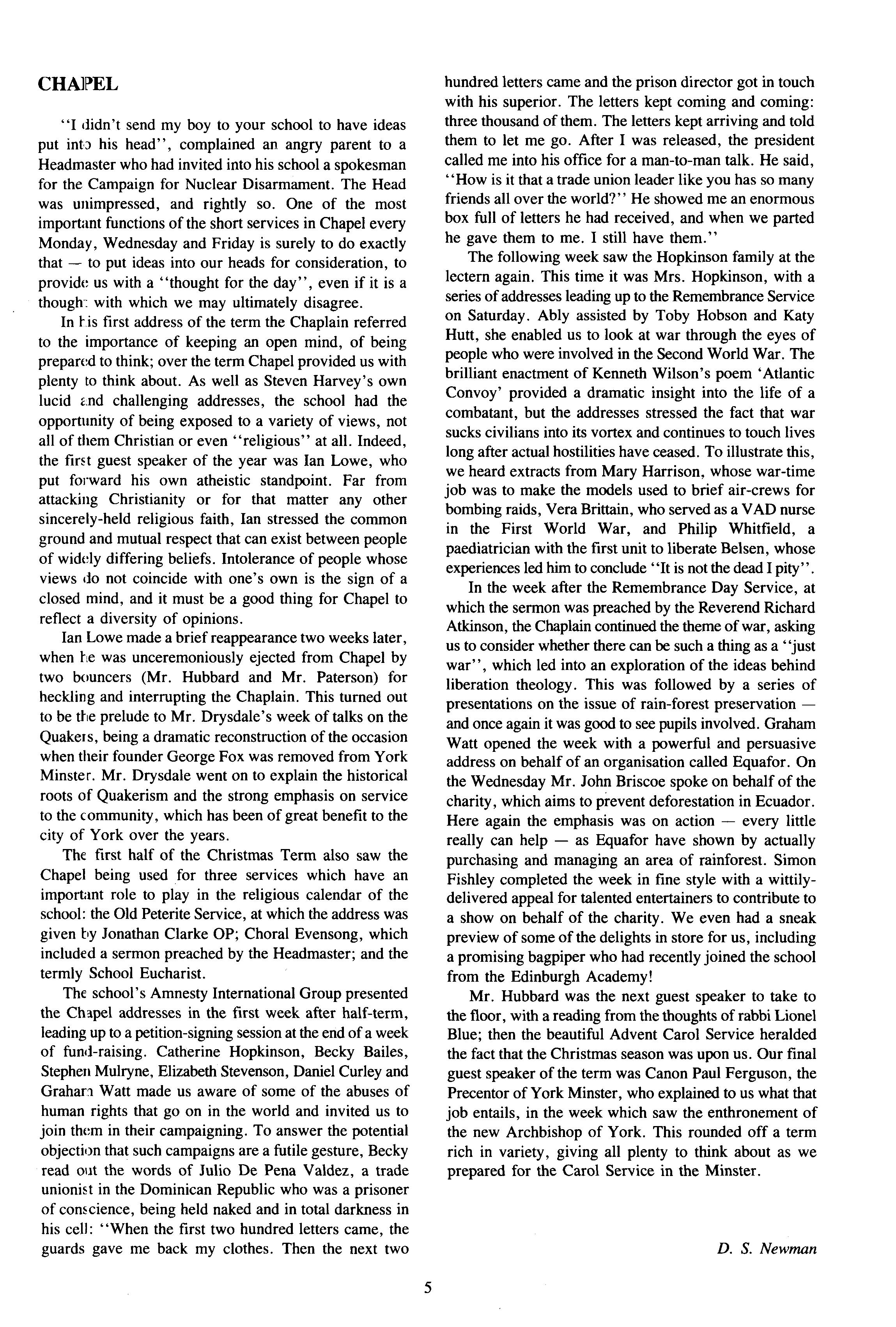 The school's Amnesty International Group presented the Chapel addresses in the first week after half-term, leading up to apetition-signing session atthe end of aweek of fund-raising Catherine Hopkinson, Becky Bailes, Stephen Mulryne, Elizabeth Stevenson, Daniel Curley and Grahari Watt made us aware of some of the abuses of human rights that go on in the world and invited us to join them in their campaigning. To answer the potential objection that such campaigns are a futile gesture, Becky read out the words of Julio De Pena Valdez, a trade unionist in the Dominican Republic who was a prisoner of conscience, being held naked and in total darkness in his cell: "When the first two hundred letters came, the guards gave me back my clothes Then the next two