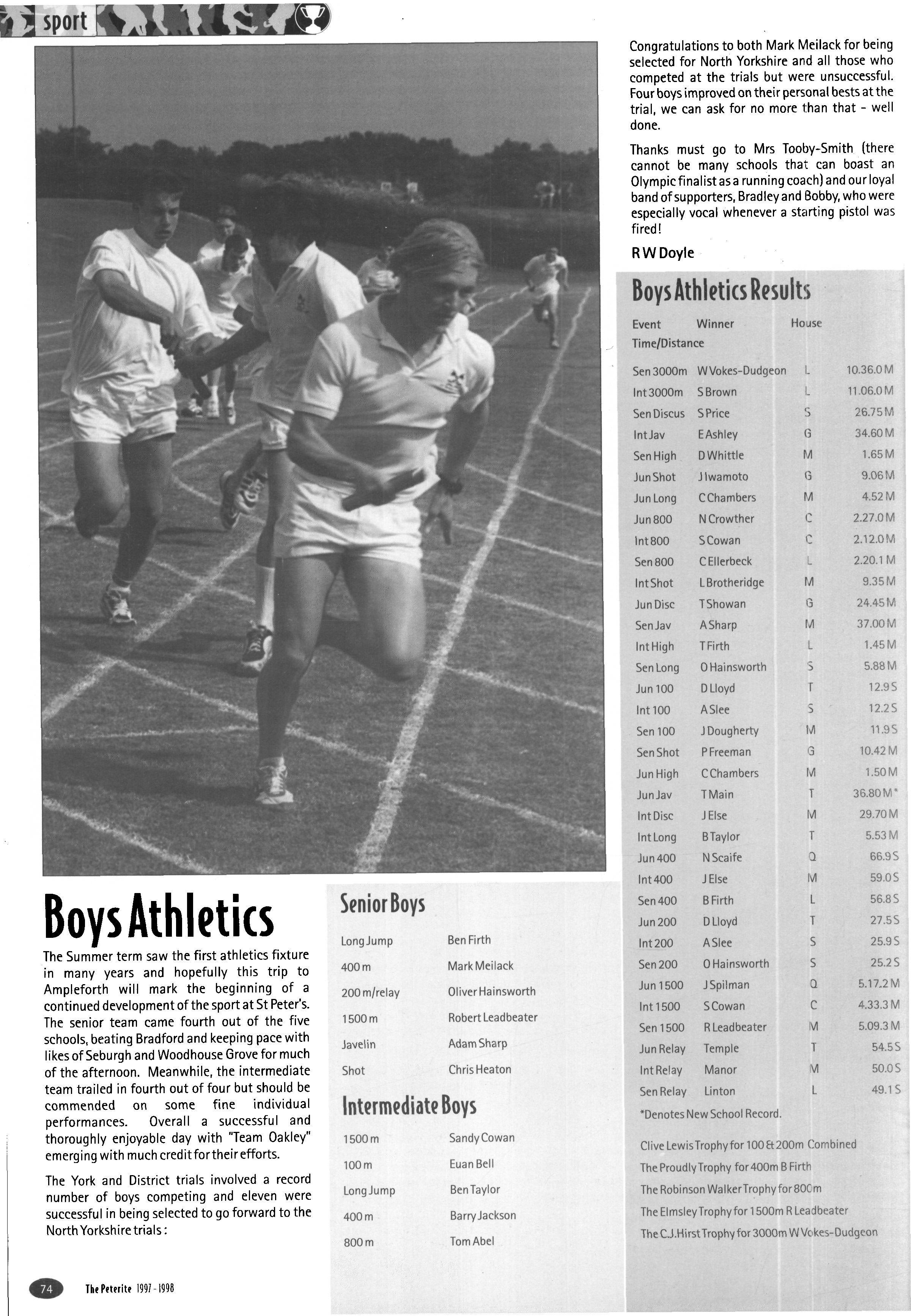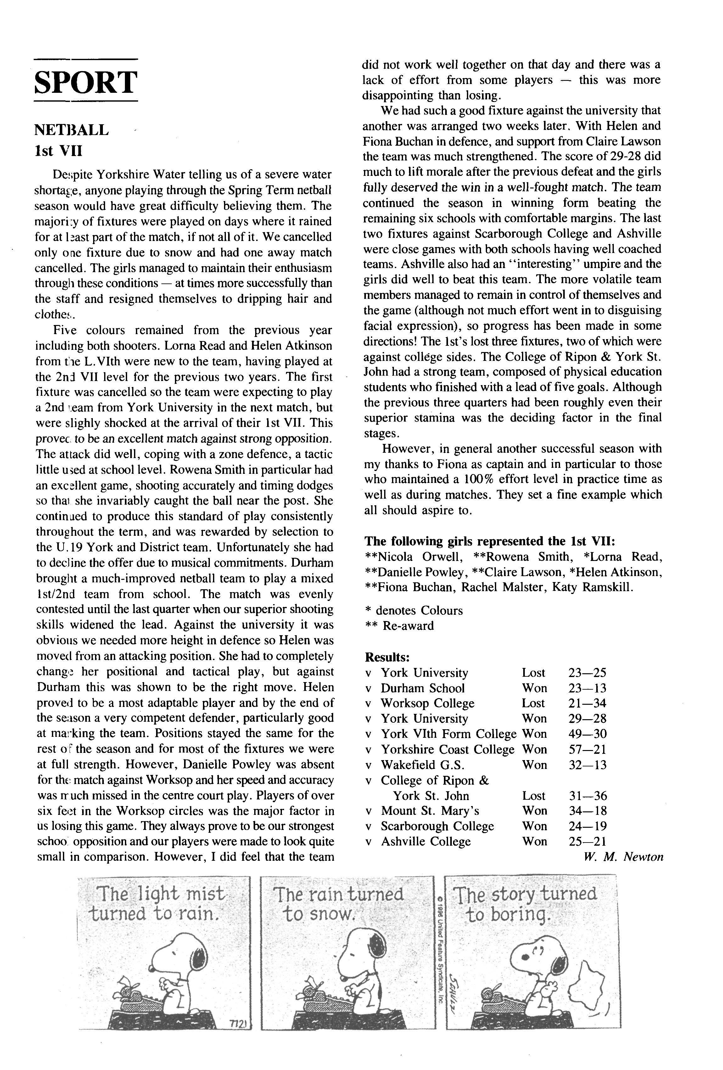 In the girls' badminton, a splendid performance from our senior pair Sarah Richardson and Gemma Scott, very ably backed up by Vicky Bray, Hayley Oram, Carrie Magee and Rachel Milne made for ah exciting match, and we missed the final by only a narrow margin The crosscountry saw all ourjuniors taking part, with some splendid individual performances in particular from Henry Heywood and Hayley Oram. The seniors too gave a good account of themselves; Ruth Dalton doing very well to gain tenth place overall