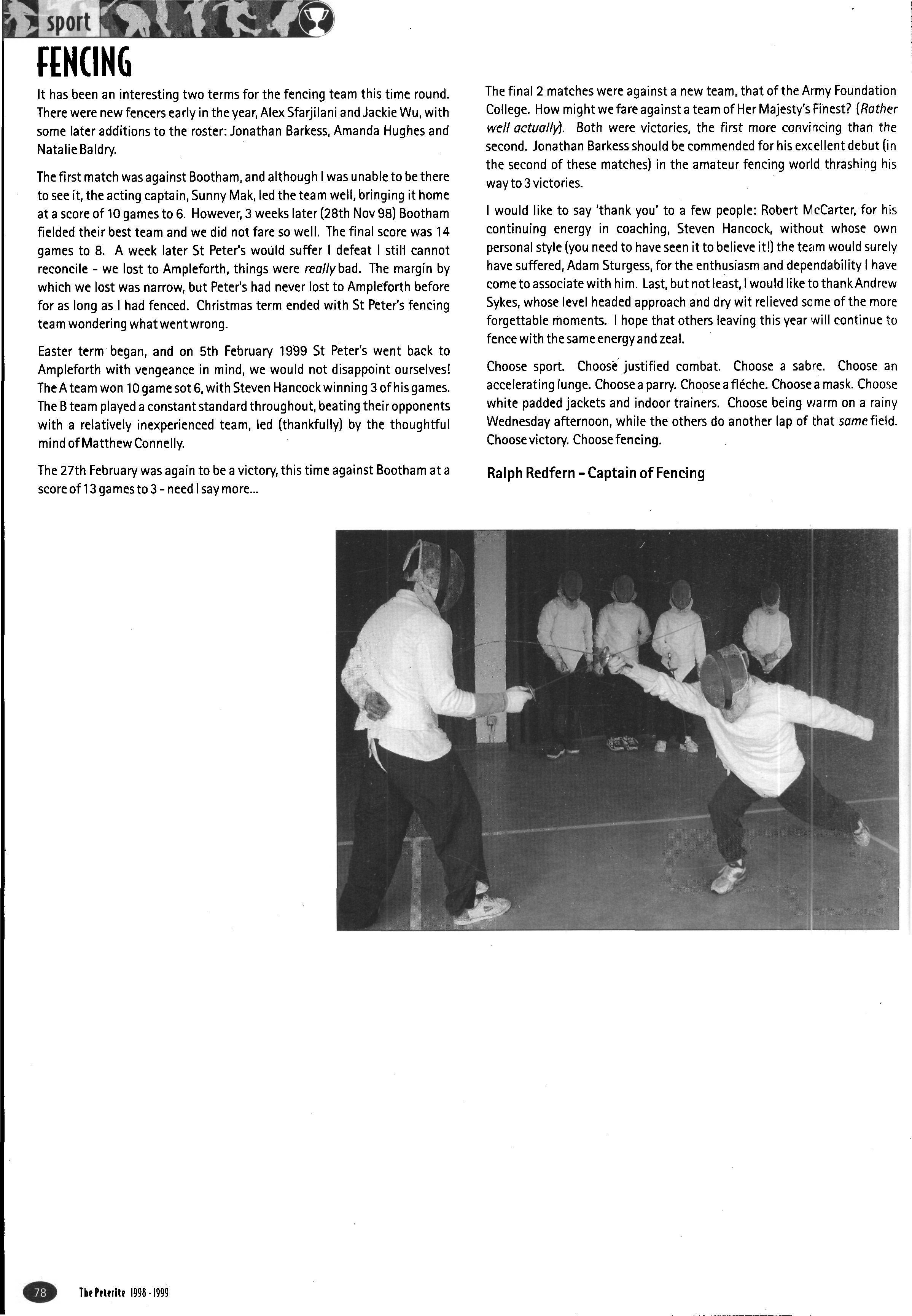 The squash season started with a familiar scene in the Alcuin courts: a Peterite on court, with Mum and Dad watching proudly from the balcony What was unusual about it was the fact that the young man in question was over sixty years old, and his father, also an Old Peterite, was nearly ninety! The occasion was the squash match between the school and the OP's, played in a wonderful atmosphere and spanning the generations Bill Fairweather is the World Over 60's champion, and he beat Matthew Vowles in an absorbing match