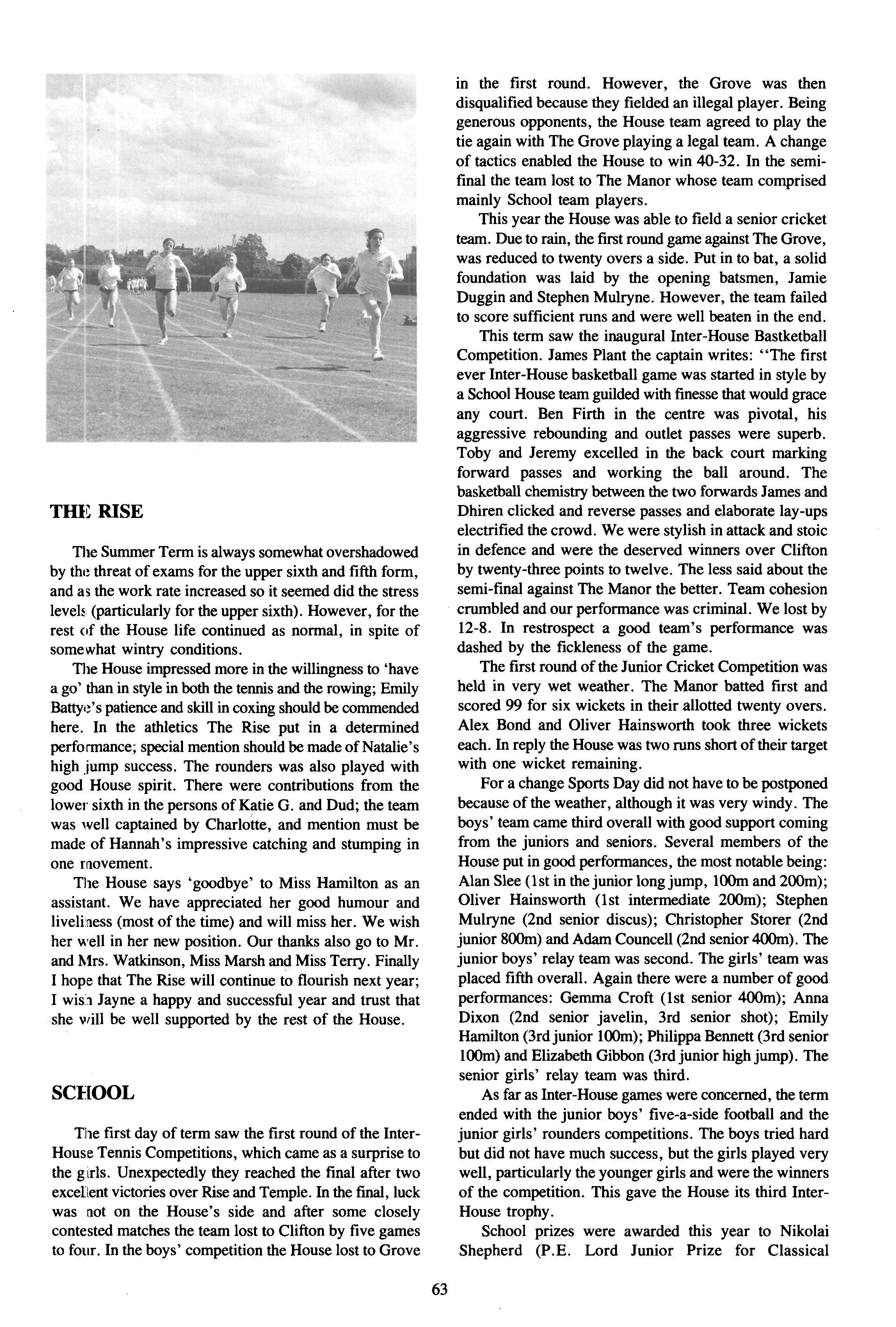 The first sporting event of theyear wasthe Inter-House Badminton Competition but sadly the team was beaten in the first round by very strong opposition. However, this was followed by an excellent performance in the crosscountry. The Rise came second in the senior event and won the junior There were particularly good performances from Katrina Rayner, the team captain, Susanna Brunton, Fern Brooke and Emily Battye.