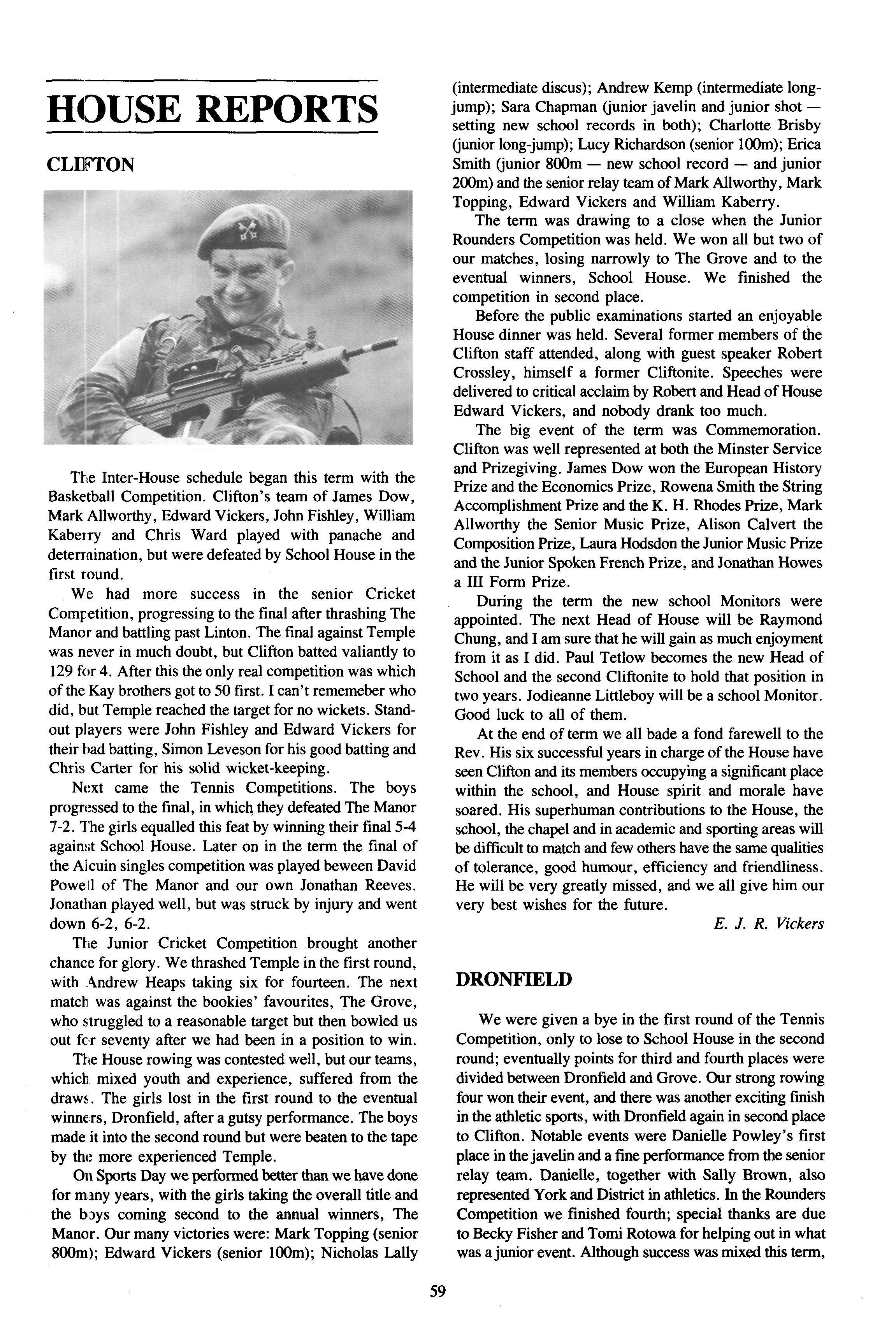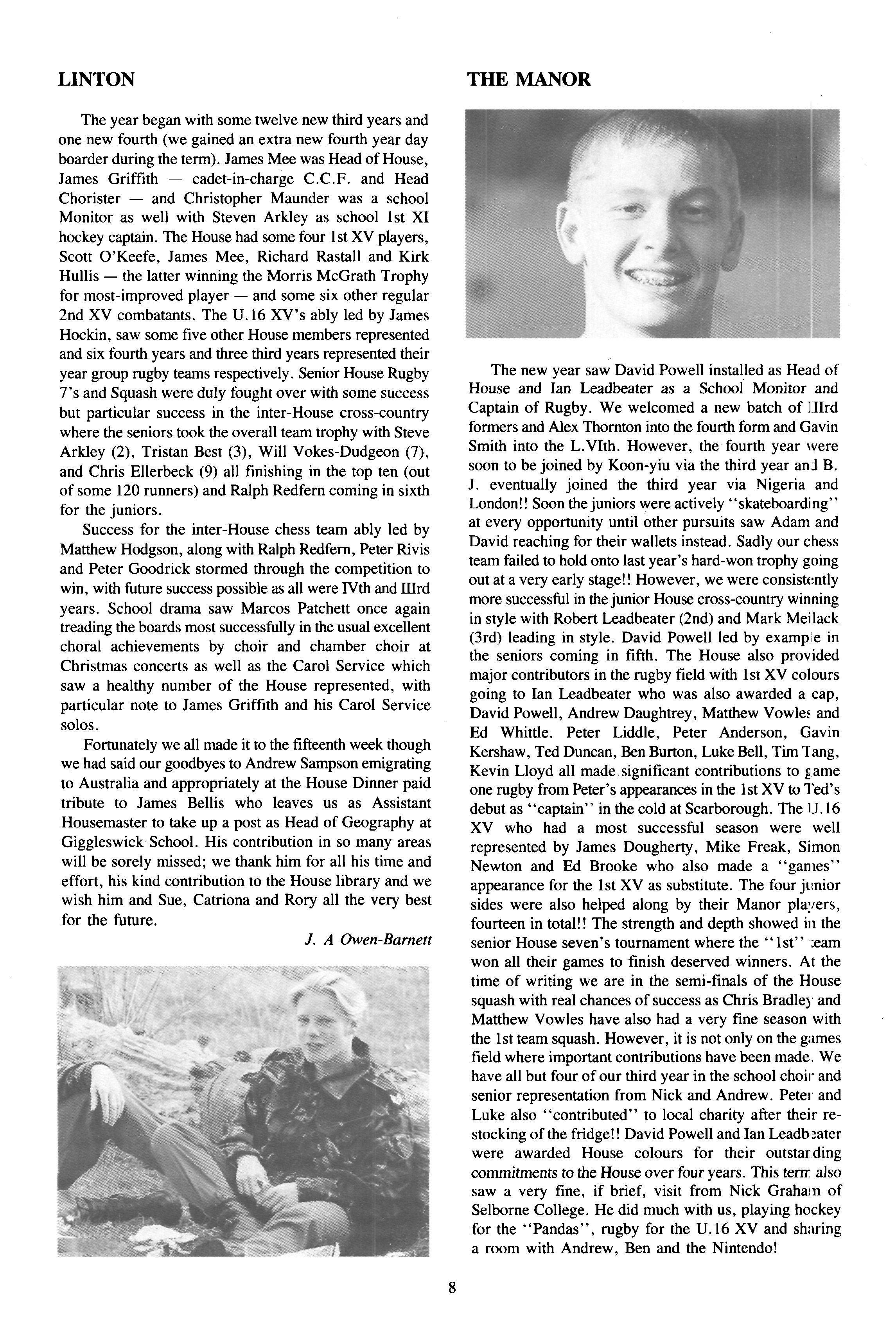 The new year saw David Powell installed as Head of House and Ian Leadbeater as a School Monitor and Captain of Rugby We welcomed a new batch of Illrd formers and Alex Thornton into the fourth form and Gavin Smith into the L.VIth However, the fourth year were soon to be joined by Koon-yiu via the third year and B J eventually joined the third year via Nigeria and London!! Soon thejuniors were actively "skateboarding" at every opportunity until other pursuits saw Adam and David reaching for their wallets instead. Sadly our chess team failed to hold onto last year's hard-won trophy going out at a very early stage!! However, we were consistently more successful in thejunior House cross-country winning in style with Robert Leadbeater (2nd) and Mark Meilack (3rd) leading in style David Powell led by exampie in the seniors coming in fifth. The House also provided major contributors in the rugby field with 1st XV colours going to Ian Leadbeater who was also awarded a cap, David Powell, Andrew Daughtrey, Matthew Vowles and Ed Whittle Peter Liddle, Peter Anderson, Gavin Kershaw, Ted Duncan, Ben Burton, LukeBell, Tim Tang, Kevin Lloyd all made significant contributions to game one rugby from Peter's appearances in the 1stXV to Ted's debut as "captain" in the cold at Scarborough. The U. 16 XV who had a most successful season were well represented by James Dougherty, Mike Freak, Simon Newton and Ed Brooke who also made a "games" appearance for the 1st XV as substitute The four junior sides were also helped along by their Manor players, fourteen in total!! The strength and depth showed in the senior House seven's tournament where the "1st" :eam won all their games to finish deserved winners. At the time of writing we are in the semi-finals of the House squash with real chances of success as Chris Bradley and Matthew Vowles have also had a very fine season with the 1stteam squash However, it is not only on the games field where important contributions have been made We have all but four of our third year in the school choir and senior representation from Nick and Andrew. Peter and Luke also "contributed" to local charity after their restocking of the fridge!! David Powell and Ian Leadbeater were awarded House colours for their outstarding commitments tothe House over four years This terrr also saw a very fine, if brief, visit from Nick Graham of Selborne College He did much with us, playing hockey for the "Pandas", rugby for the U.16 XV and sharing a room with Andrew, Ben and the Nintendo!