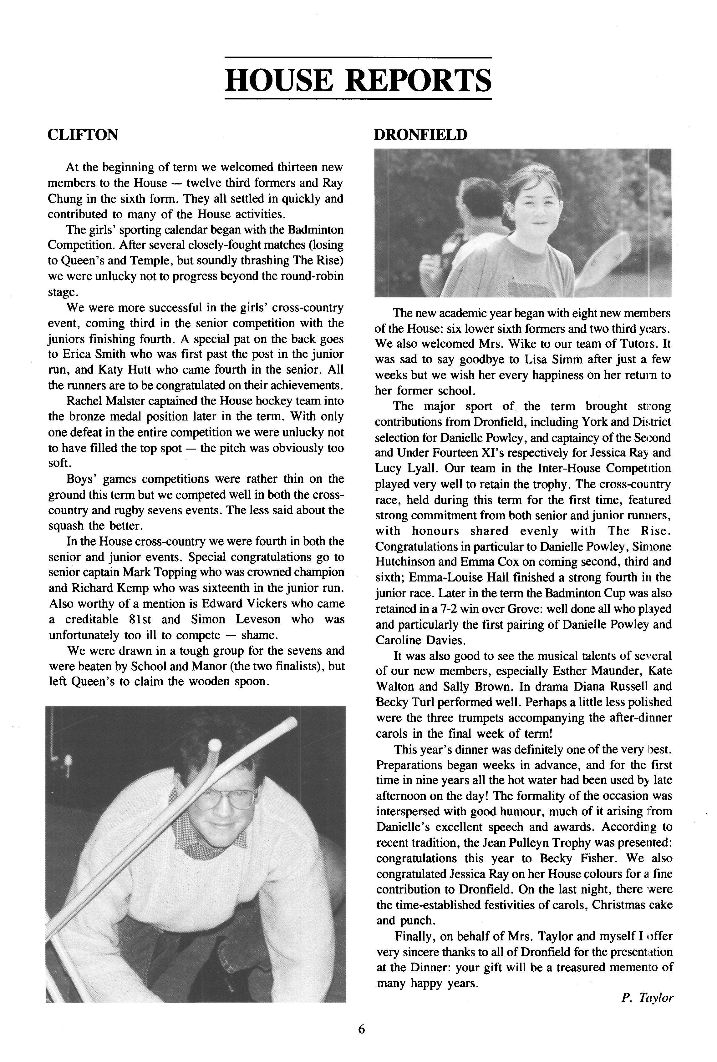 The major sport of the term brought strong contributions from Dronfield, including York and District selection for Danielle Powley, and captaincy of the Second and Under Fourteen XI's respectively for Jessica Ray and Lucy Lyall Our team in the Inter-House Competition played very well to retain the trophy. The cross-country race, held during this term for the first time, featured strong commitment from both senior andjunior runners, with honours shared evenly with The Rise Congratulations in particular to Danielle Powley, Simone Hutchinson and Emma Cox on coming second, third and sixth; Emma-Louise Hall finished a strong fourth in the junior race. Later in the term the Badminton Cup was also retained in a 7-2 win over Grove: well done all who played and particularly the first pairing of Danielle Powley and Caroline Davies