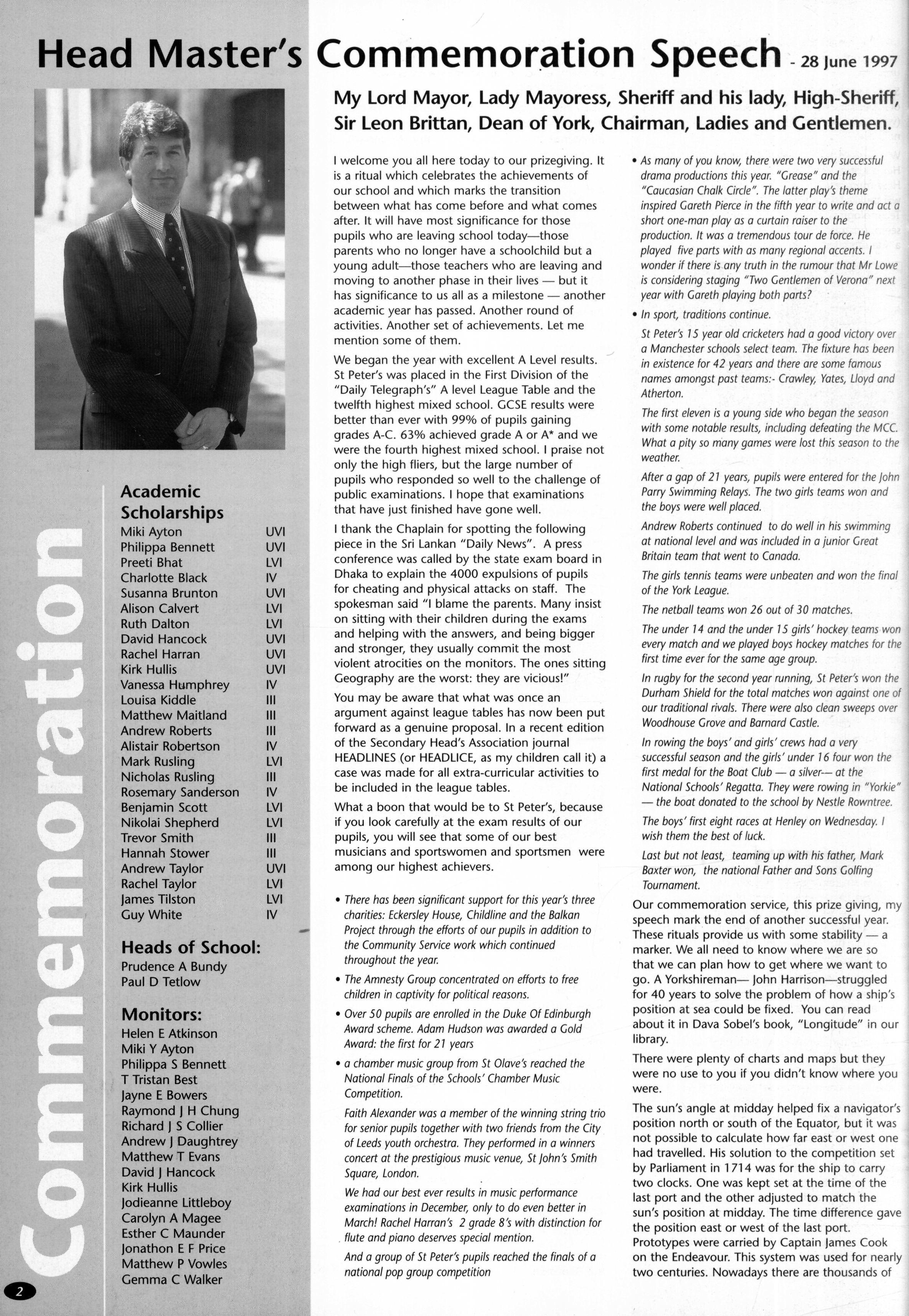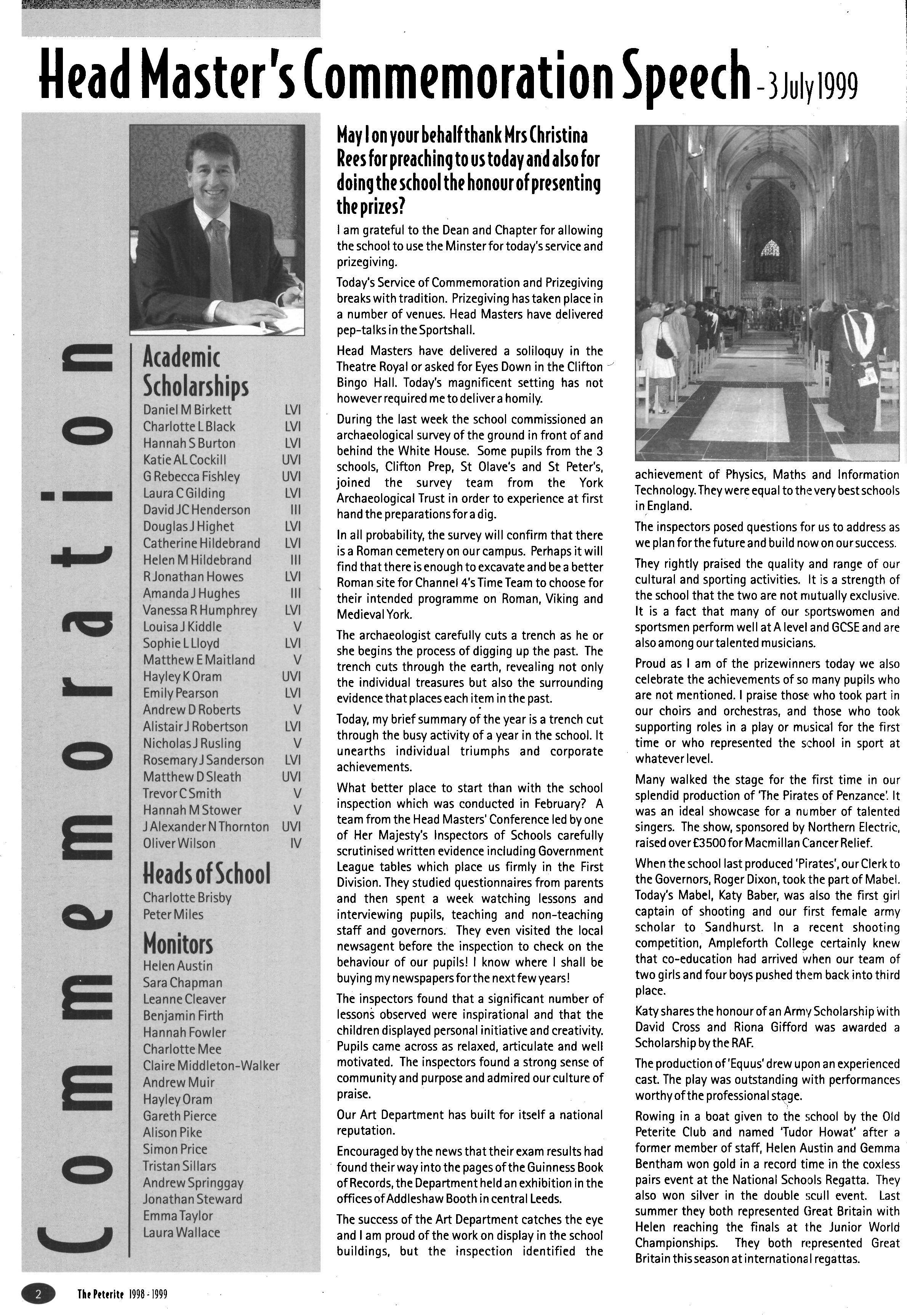 Mr Hubbard was the next guest speaker to take to the floor, with a reading from thethoughts of rabbi Lionel Blue; then the beautiful Advent Carol Service heralded the fact that the Christmas season was upon us Our final guest speaker of the term was Canon Paul Ferguson, the Precentor of York Minster, who explained to us what that job entails, in the week which saw the enthronement of the new Archbishop of York This rounded off a term rich in variety, giving all plenty to think about as we prepared for the Carol Service in the Minster.