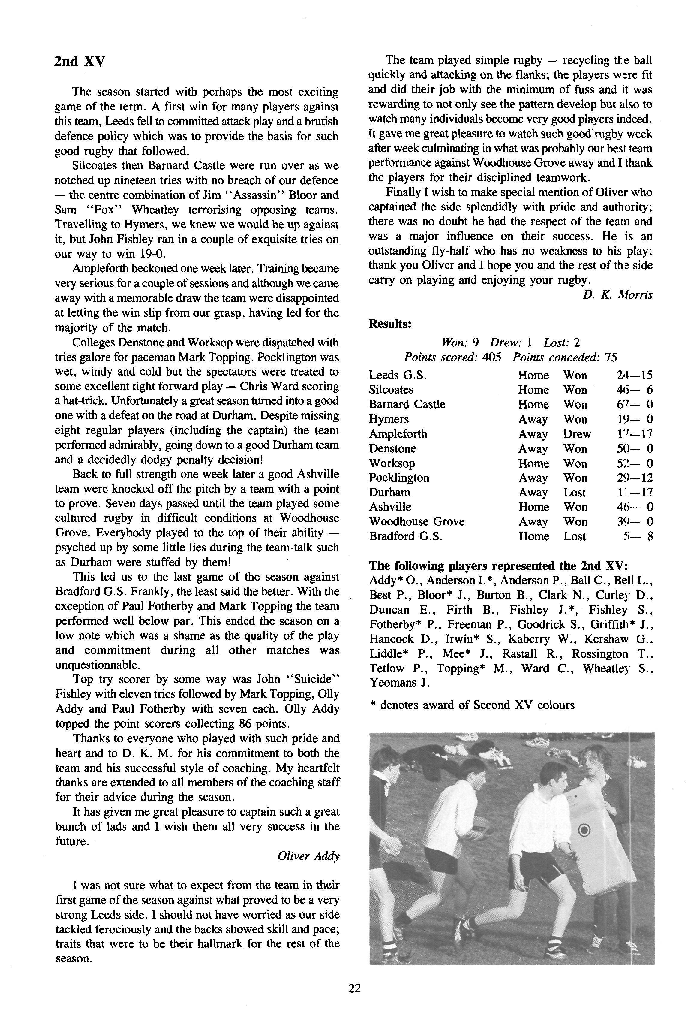 The House was unusually well-represented in the First, Second and Third XV's. Andrew Kay, Jon Price and Nick Riggall all played for the First XV and all were awarded their colours for which we congratulate them. Oliver Addy captained the Second XV in what was to prove to be one of their best seasons ever. Jim Bloor also played for the Seconds We congratulate both Oily and Jim on the award of their colours Chris Ball captained the Third XV which also had a very successful season. On the last Saturday of term the House Seven's team (Oliver Addy, Jon Price, Jim Bloor, Nick Riggall, Andy Kay, Nick Kay, Simon Goodrick and Simon Newton) managed to get through to the semi-final of the competition after some very fine Rugger The semi-final against School House was an outstanding match with both sides playing exciting, committed Rugger with the lead changing several times School won by 15-14 scoring in the last nine seconds.