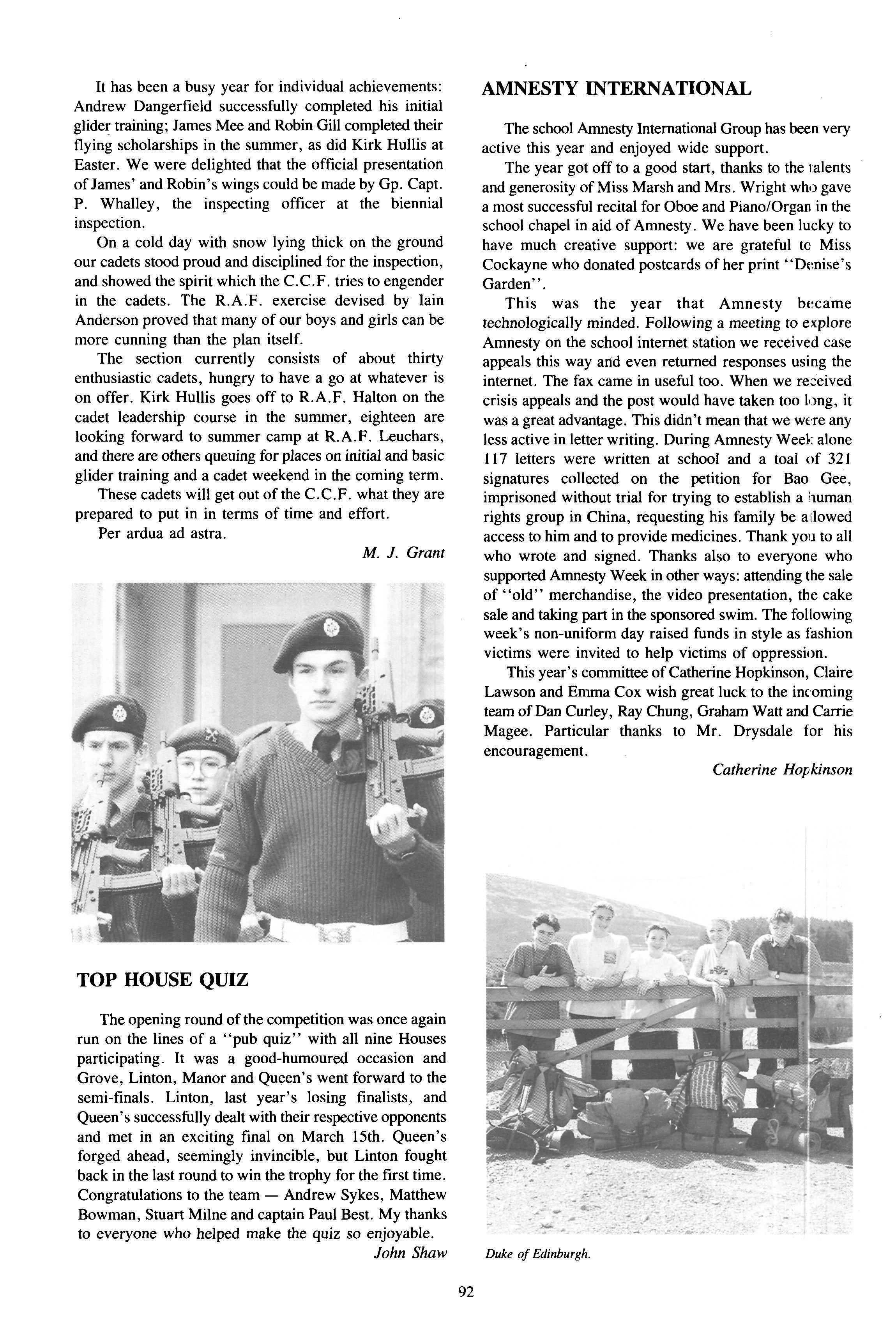 Away from the sports field activities Grovites played significant roles in this year's drama production and in chapel. Graham and Dan both addressed the school during Amnesty Week. Graham in particular stunned his listeners with his own composition which anyone present would have been proud to have written A copy of his words has been specially printed and is to hang in the House as a testimony to his creativity and sensitivity Later in the term Graham spoke again and so did Simon Fishley, as they captained the school's interest in Rainforest preservation.