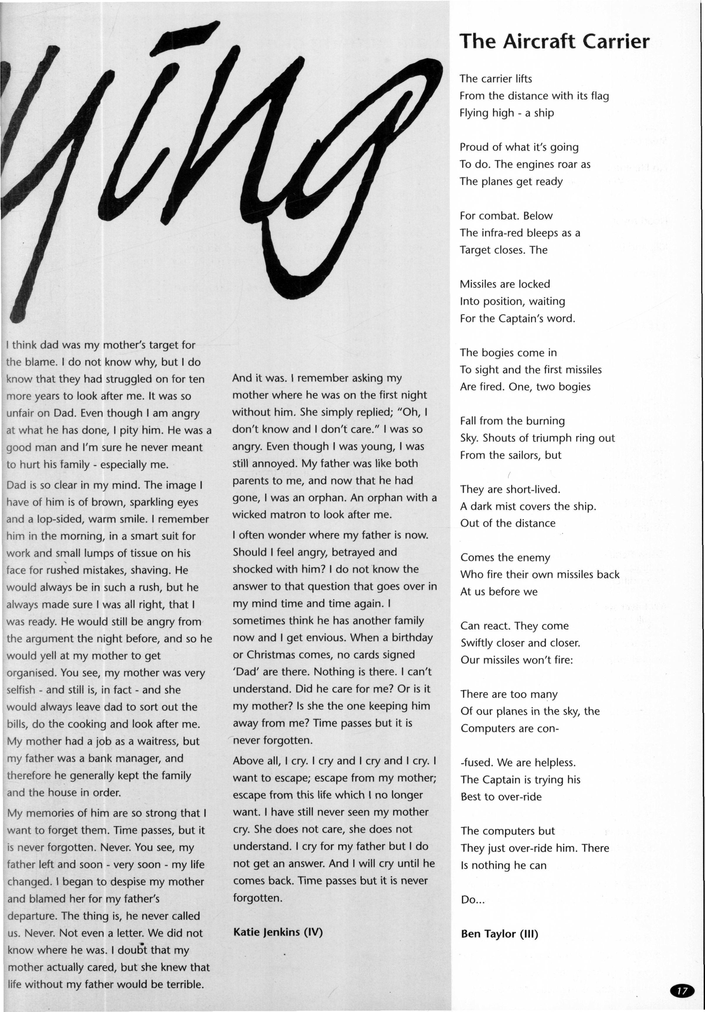 The following week saw the Hopkinson family at the lectern again This time it was Mrs Hopkinson, with a series of addresses leading up to the Remembrance Service on Saturday Ably assisted by Toby Hobson and Katy Hutt, she enabled us to look at war through the eyes of people who were involved in the Second World War. The brilliant enactment of Kenneth Wilson's poem 'Atlantic Convoy' provided a dramatic insight into the life of a combatant, but the addresses stressed the fact that war sucks civilians into its vortex and continues to touch lives long after actual hostilities have ceased. To illustrate this, we heard extracts from Mary Harrison, whose war-time job was to make the models used to brief air-crews for bombing raids, Vera Brittain, who served as a VAD nurse in the First World War, and Philip Whitfield, a paediatrician with the first unit to liberate Belsen, whose experiences led him to conclude "It is notthe dead I pity''
