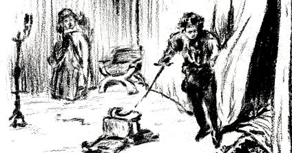 Hamlet has a heated and rather one-sided argument with his mother, Queen Gertrude, in her closet (a private room) and becomes very aggravated, causing Gertrude to cry out for help. Polonius, the King’s counsel, who has been concealed behind a curtain to eavesdrop on their conversation (unbeknownst to Hamlet) cries out for help as well and reveals his hiding place.