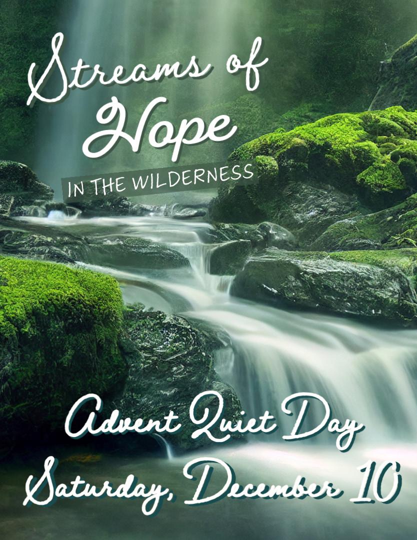 Join us for a day of quiet and contemplation, as we explore the wildernesses in our lives and in our world. During this quiet time we will see streams of hope emerge. We’ll use the Welcoming Prayer, scripture, visual expression, silence, and sharing throughout the day.