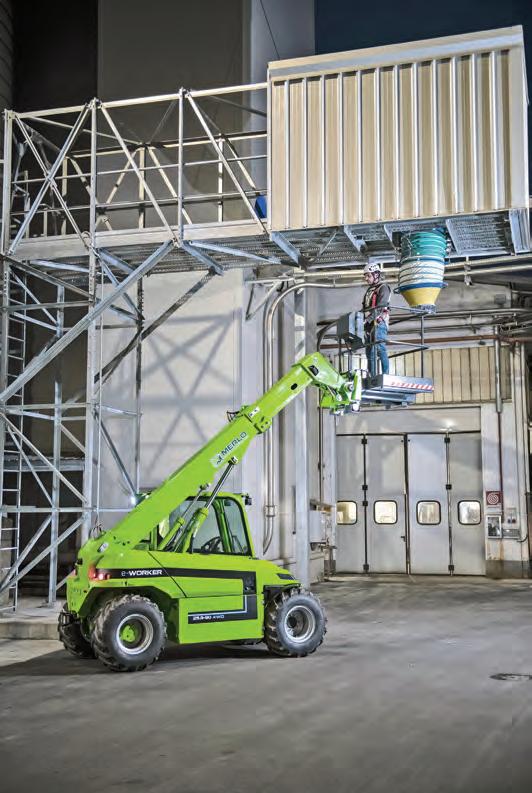 • Sicurezza: l’e-Worker unisce compattezza estrema alla sicurezza garantita da un sollevatore telescopico tradizionale; • potenza: la gamma offre doti di trazione superiori anche nelle situazioni off-road arrivando a superare pendenze di oltre il 40%; • comfort: agevole ingresso e generosa dimensione della cabina con 785 mm di larghezza massima e visibilità ai vertici della categoria; • manovrabilità: eccezionale angolo di sterzo dell’assale posteriore, ridotte dimensioni e carico sempre all’interno dell’ingombro della macchina; • versatilità: l’interfaccia Merlo - ZM1 consente la compatibilità con l’ampia scelta di attrezzature Merlo (disponibile l’omologazione per il traino fino a 6.000 kg); • efficienza: macchina a gestione 100% elettrica, con pacco batterie in grado di alimentare la pompa idraulica per i movimenti del braccio e i motori elettrici per la trazione e movimentazione della macchina. n
