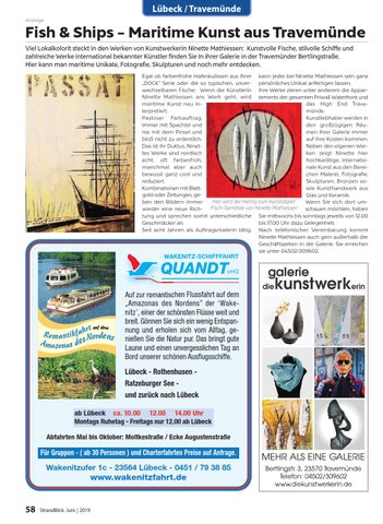 Fish & Ships – Maritime Kunst aus Travemünde Viel Lokalkolorit steckt in den Werken von Kunstwerkerin Ninette Mathiessen: Kunstvolle Fische, stilvolle Schiffe und zahlreiche Werke international bekannter Künstler finden Sie In ihrer Galerie in der Travemünder Bertlingstraße. Hier kann man maritime Unikate, Fotografie, Skulpturen und noch mehr entdecken. Egal ob farbenfrohe Hafenkulissen aus Ihrer kann jeder bei Ninette Mathiessen sein ganz „DOCK“ Serie oder die so typischen, unver- persönliches Unikat anfertigen lassen. wechselbaren Fische: Wenn die Künstlerin Ihre Werke zieren unter anderem die ApparNinette Mathiessen ans Werk geht, wird tements der gesamten Priwall Waterfront und maritime Kunst neu indas High End Traveterpretiert. münde. Pastoser Farbauftrag, Kunstliebhaber werden in immer mit Spachtel und den großzügigen Räunie mit dem Pinsel und men ihrer Galerie immer bloß nicht zu ordentlich. auf ihre Kosten kommen. Das ist ihr Duktus. NinetNeben den eigenen Wertes Werke sind nordisch ken zeigt Ninette hier echt, oft farbenfroh, hochkarätige, internatiomanchmal aber auch nale Kunst aus den Bereibewusst ganz cool und chen Malerei, Fotografie, reduziert. Skulpturen, Bronzen soKombinationen mit Blattwie Kunsthandwerk aus gold oder Zeitungen, geGlas und Keramik. Hier wird der Hering zum Kunstobjekt: ben den Bildern immer Wenn Sie sich dort umwieder eine neue Rich- Fisch-Gemälde von Ninette Mathiessen schauen möchten, haben tung und sprechen somit unterschiedliche Sie mittwochs bis sonntags jeweils von 12.00 Geschmäcker an. bis 17.00 Uhr dazu Gelegenheit. Seit acht Jahren als Auftragsmalerin tätig, Nach telefonischer Vereinbarung kommt Ninette Mathiessen auch gern außerhalb der Geschäftszeiten in die Galerie. Sie erreichen sie unter 04502/309602.