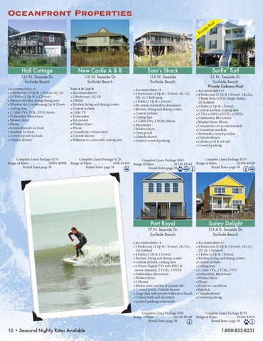 • Accommodates 12 • 4 Bedrooms (3 Up & 1 Down): 1K, 1Q, 2D, 2S, 1 Sofabed • 3 Baths (2 Up & 1 Down) • Kitchen, living and dining combo • Central air/heat • Ceiling fans • 2 Cable TVs, 2 VCRs, DVD • Dishwasher, Microwave • Washer/dryer • Phone • Porch on oceanfront • Sundeck • Outside shower • Covered parking