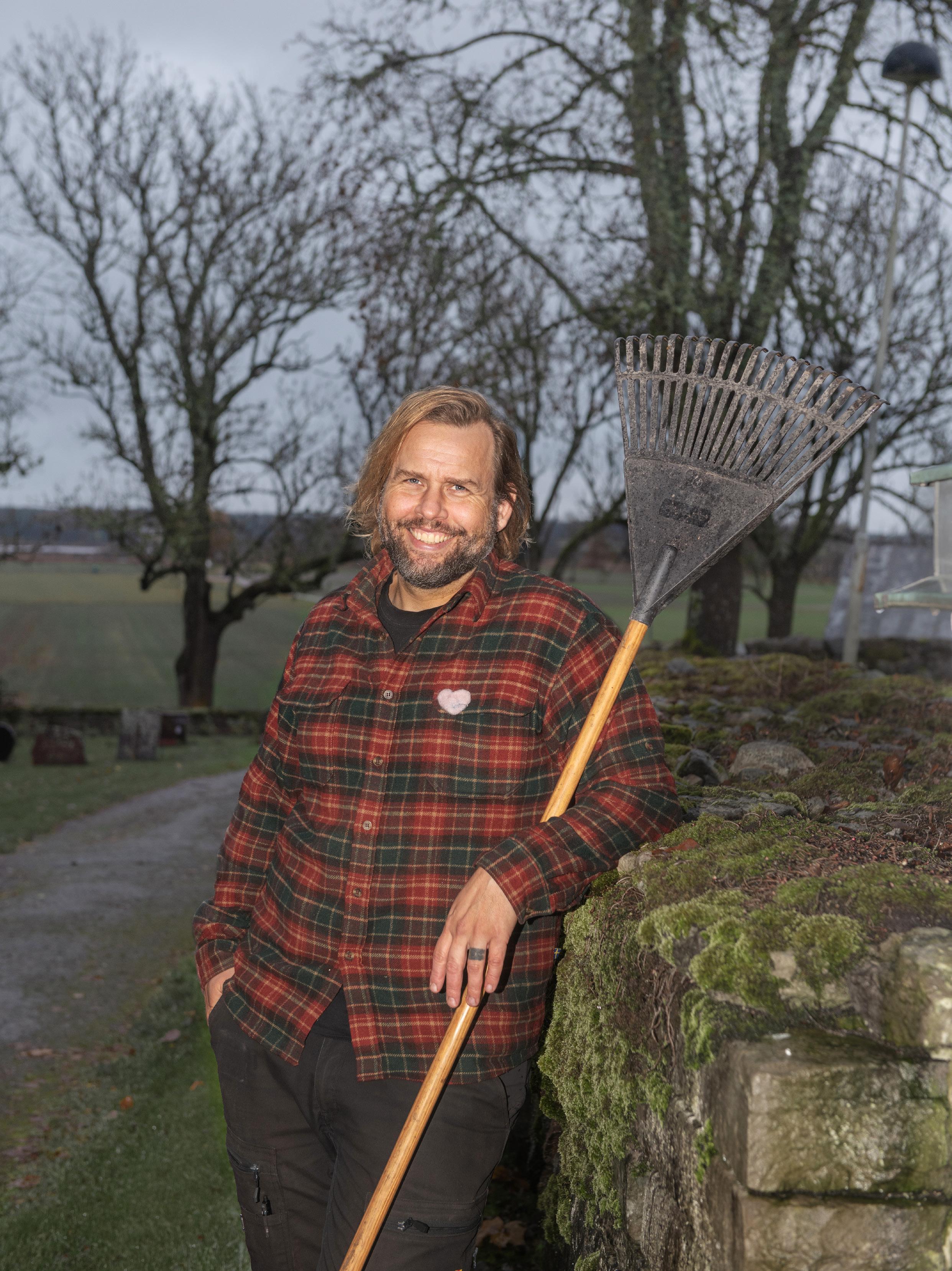 Som vaktmästare i Tysslinge församling får Olle Cedersjö hantera såväl räfsa som gitarr i sitt arbete, vilket är en av anledningarna till att han trivs så bra.