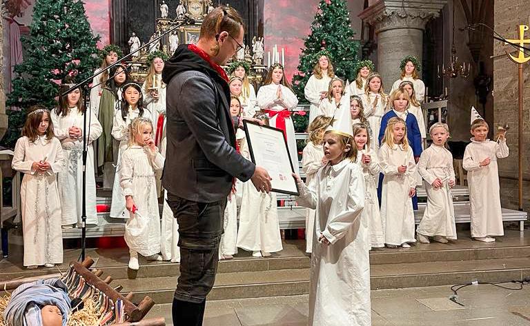 – Vi har jätteroligt i kören. Ibland får man sjunga solo. Det är extra kul, säger Manne Höglund, körmedlem och den som fick ta emot stipendiediplomet vid utdelningen i S:t Nicolai kyrka.