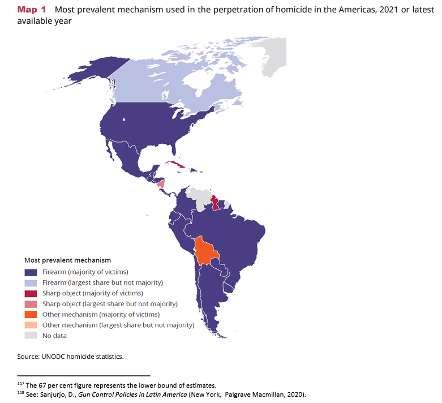 Armas de Fuego: La disponibilidad y uso de armas de fuego amplifica la letalidad de los conflictos En América del Sur, el 70 % de los homicidios en 2021 involucraron armas de fuego, una cifra significativamente más alta que en otras regiones del mundo (Muggah & Aguirre, 2020). La debilidad en la regulación y el control de armas permite que estas caigan en manos de organizaciones criminales, exacerbando la violencia.