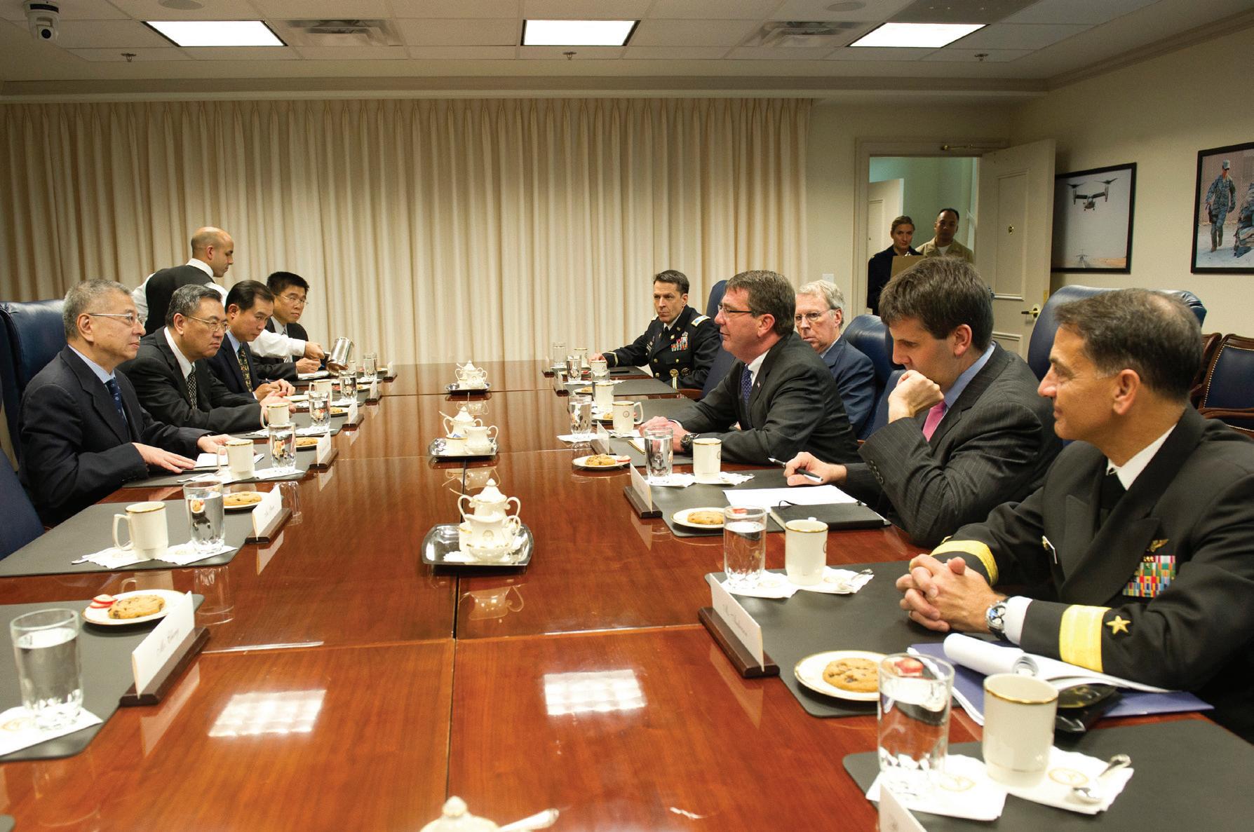 Deputy Secretary of Defense Ashton Carter, second from right, meets with Taiwan’s Vice Minister of Defense Andrew Yang, left, on Oct. 2, 2012.