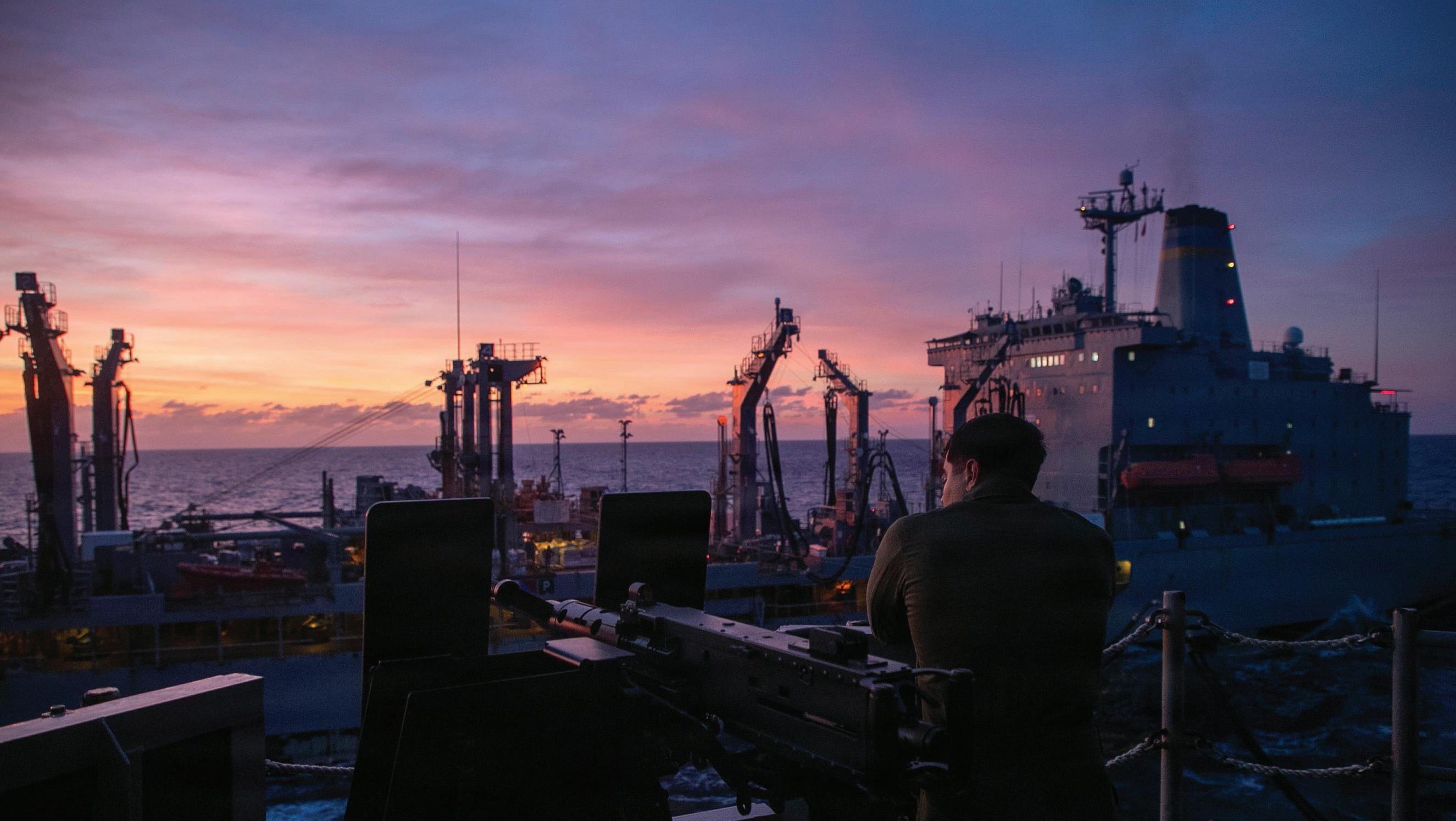 The USNS Tippecanoe (T-AO 199) replenishes the amphibious assault ship USS Tripoli in the South China Sea, Dec. 6, 2025.