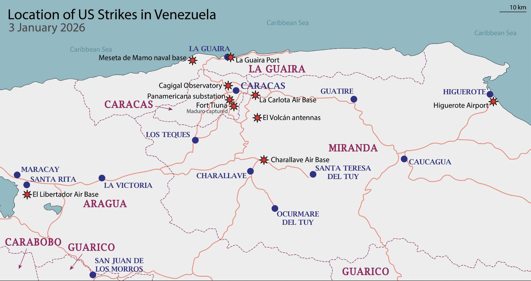 Military pressure followed economic coercion. In September 2025, US forces launched Operation Southern Spear in the Caribbean, ostensibly targeting unflagged vessels allegedly smuggling drugs in international waters. By December, these operations expanded into a comprehensive maritime quarantine (a de facto blockade), intercepting oil tankers suspected of violating US sanctions. The final escalation occurred on January 3, 2026, when US special forces, reportedly with CIA assistance, executed Operation Absolute Resolve, a surprise raid in Caracas that resulted in the capture of Maduro and his wife and their transfer to New York for trial on charges of narcoterrorism.