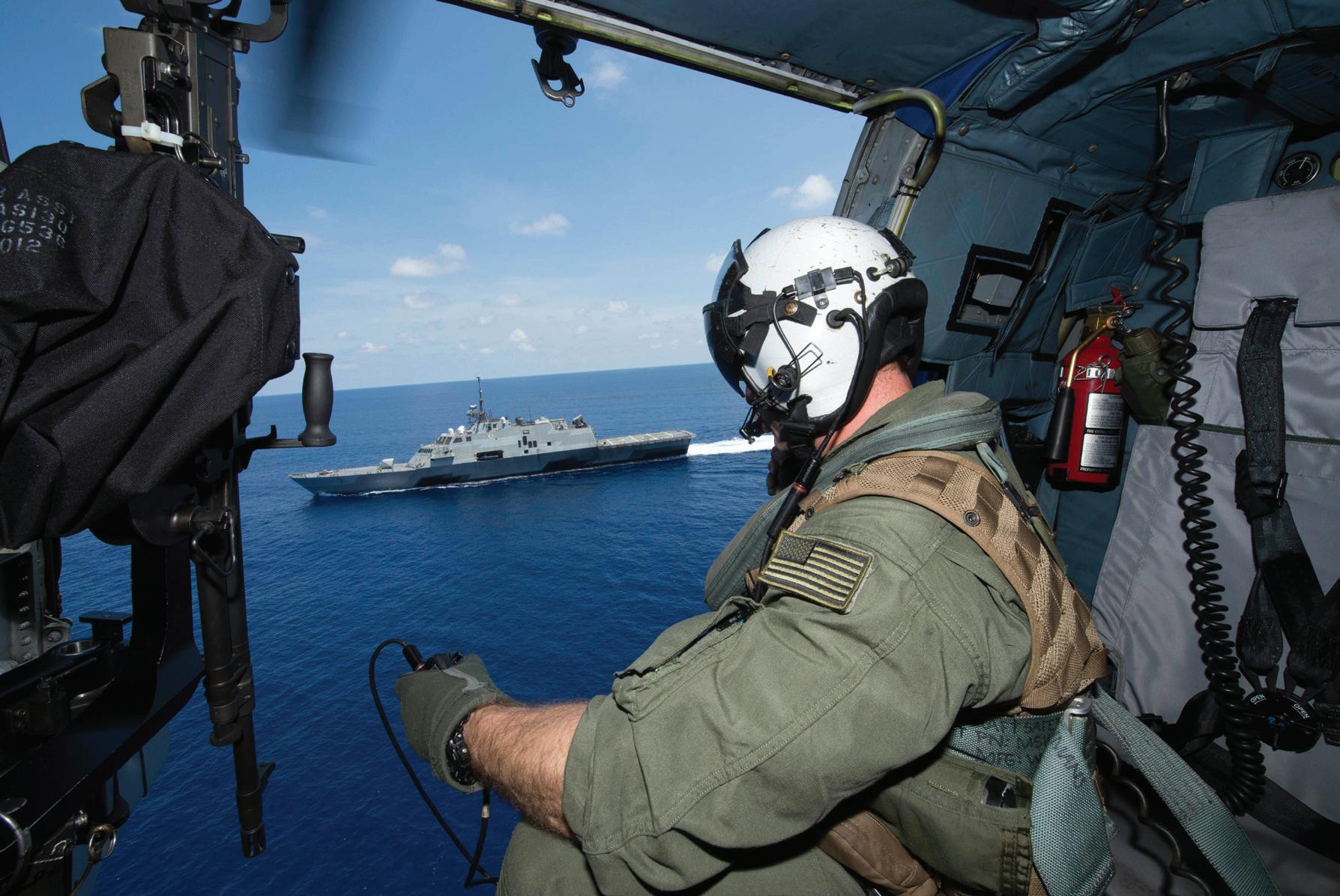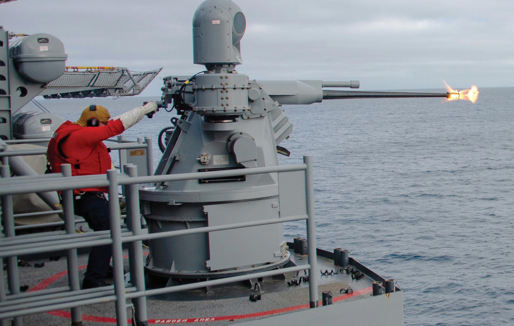 Navy Petty Officer Matthew Beck fires an MK 38 machine gun during an exercise aboard the USS Essex.