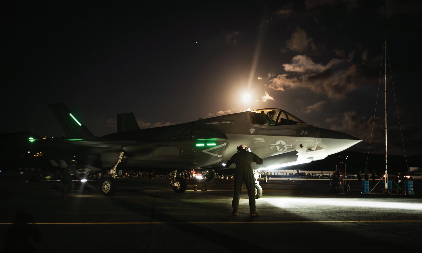 A Marine Corps pilot captain guides in an F-35B Lightning II following military actions in Venezuela in support of Operation Absolute Resolve, Jan. 3, 2026.