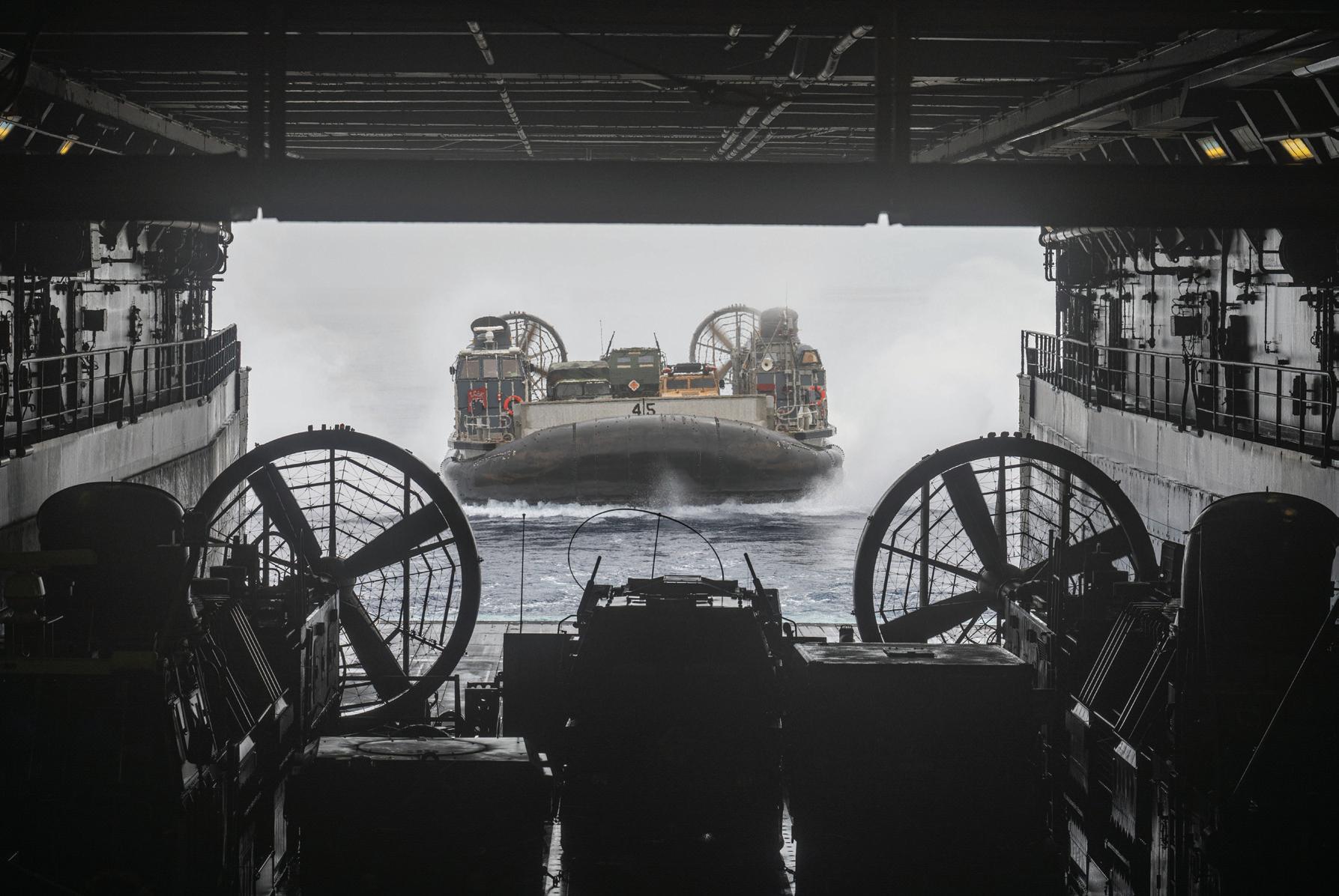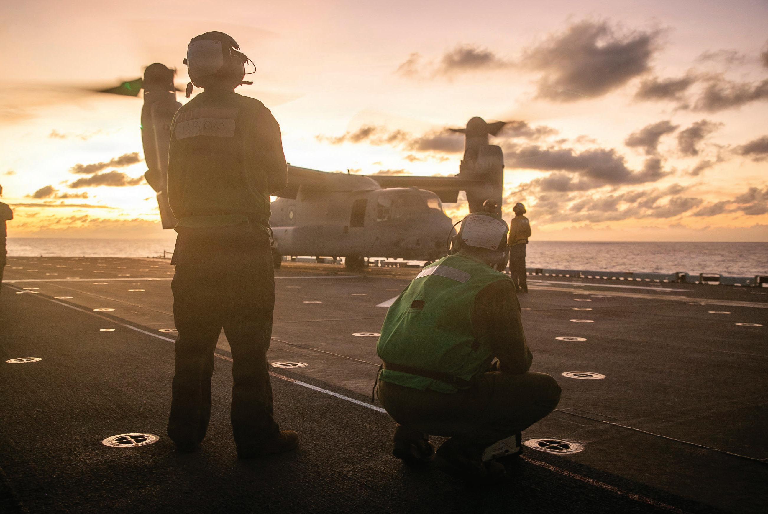 Marines watch as an MV-22 Osprey lands during evening flight operations aboard ship USS Tripoli (LHA 7) in the South China Sea on Dec. 12, 2025.
