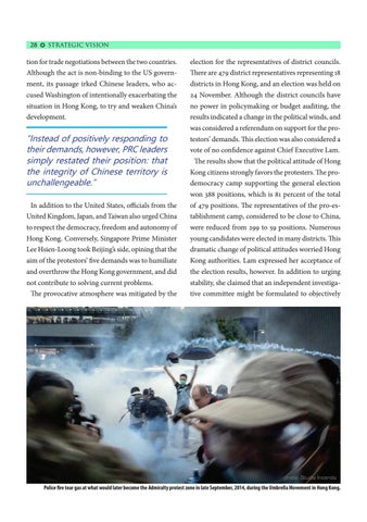 Submissions: Essays submitted for publication are not to exceed 2,000 words in length, and should conform to the following basic format for each 1200-1600 word essay: 1. Synopsis, 100-200 words; 2. Background description, 100-200 words; 3. Analysis, 800-1,000 words; 4. Policy Recommendations, 200-300 words. Book reviews should not exceed 1,200 words in length. Notes should be formatted as endnotes and should be kept to a minimum. Authors are encouraged to submit essays and reviews as attachments to emails; Microsoft Word documents are preferred. For questions of style and usage, writers should consult the Chicago Manual of Style. Authors of unsolicited manuscripts are encouraged to consult with the executive editor at xiongmu@gmail.com before formal submission via email. The views expressed in the articles are the personal views of the authors and do not necessarily represent the views of their affiliate institutions or of Strategic Vision Manuscripts are subject to copyediting, both mechanical and substantive, as required and according to editorial guidelines. No major alterations may be made by an author once the type has been set. Arrangements for reprints should be made with the editor. Cover photograph of the Hong Kong anti-extradition bill protest