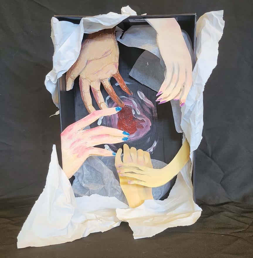 My pieces all evolve from the basis of changes, experiences, and feelings experienced throughout growing up. As I am reaching the end of my childhood, I wanted to create my art as a chance to reflect on how I have evolved and how I stayed the same. My body of work displays this through the distortion of the body. My artwork predominantly features my own body, creating vulnerability and honesty between me and the viewer. Although a variety of materials and media were used throughout the works, creating a piece digitally is something that I have done multiple times throughout the exhibition whether the piece itself was completely digital or if digital elements were incorporated into a physical piece. I enjoy digital media and feel confident in it. Other media I explored were multimedia collages, sculptural work, acrylic paint, and oil pastel.