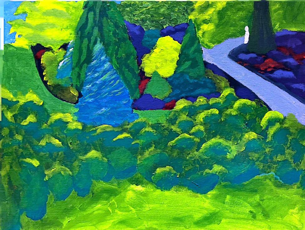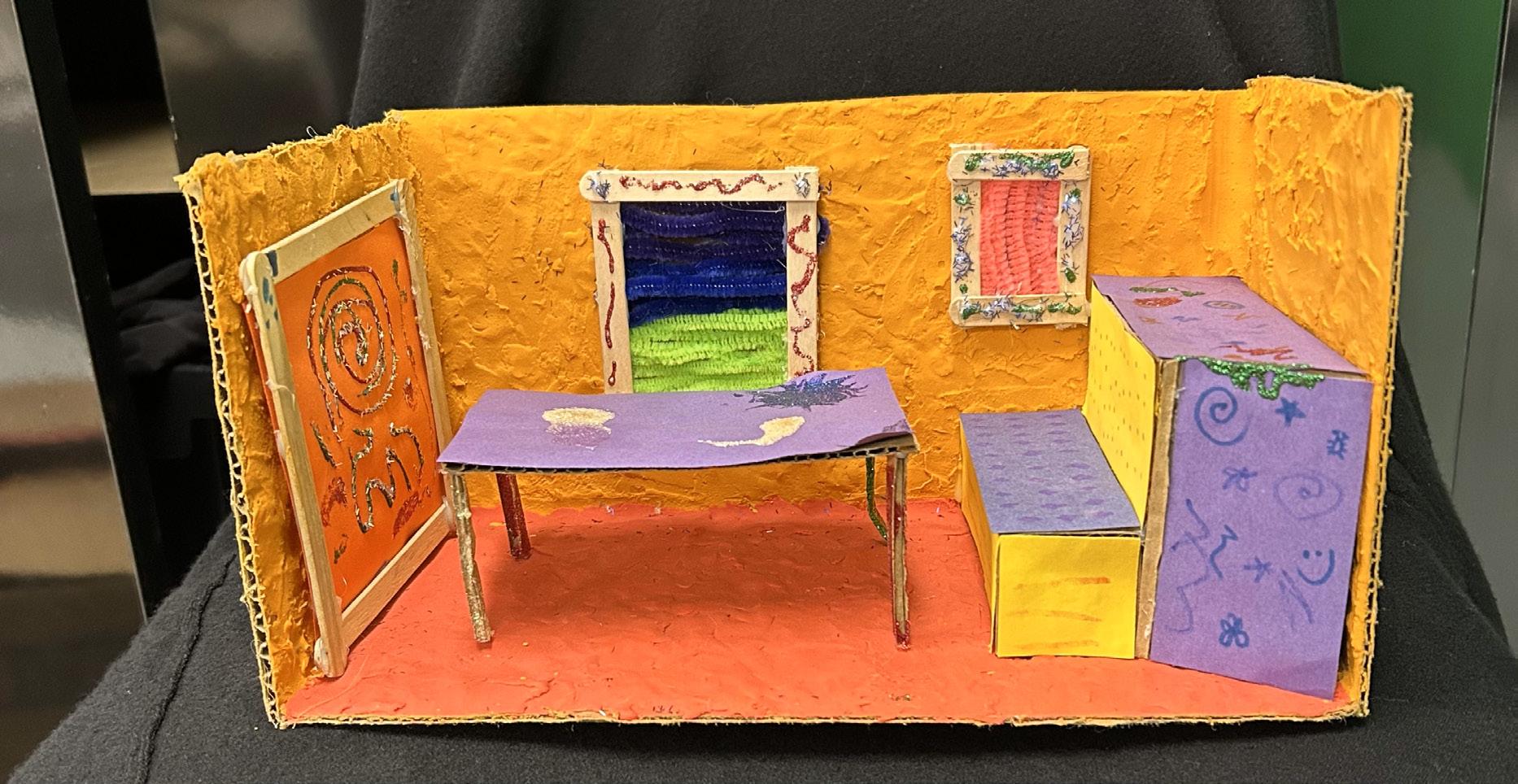 For my exhibition, I chose pieces which best-portrayed aspects of my home. Three of five of the pieces I chose to display My Room, Creative Clutter, and Home of Memories all focus on my room. The reason for my choice to focus on my bedroom is to highlight the most sentimental space in my house. My Room is a large-scale painting of my perspective of my room. In this painting, the bright colours evoke feelings of comfort and discomfort through the displaced shapes. Creative Clutter is similar, as it’s a bright representation of my desk, showing my most important creative space.