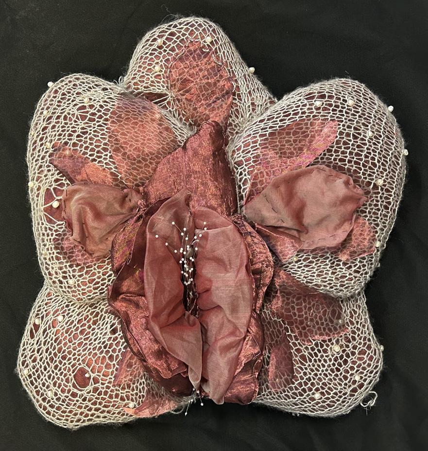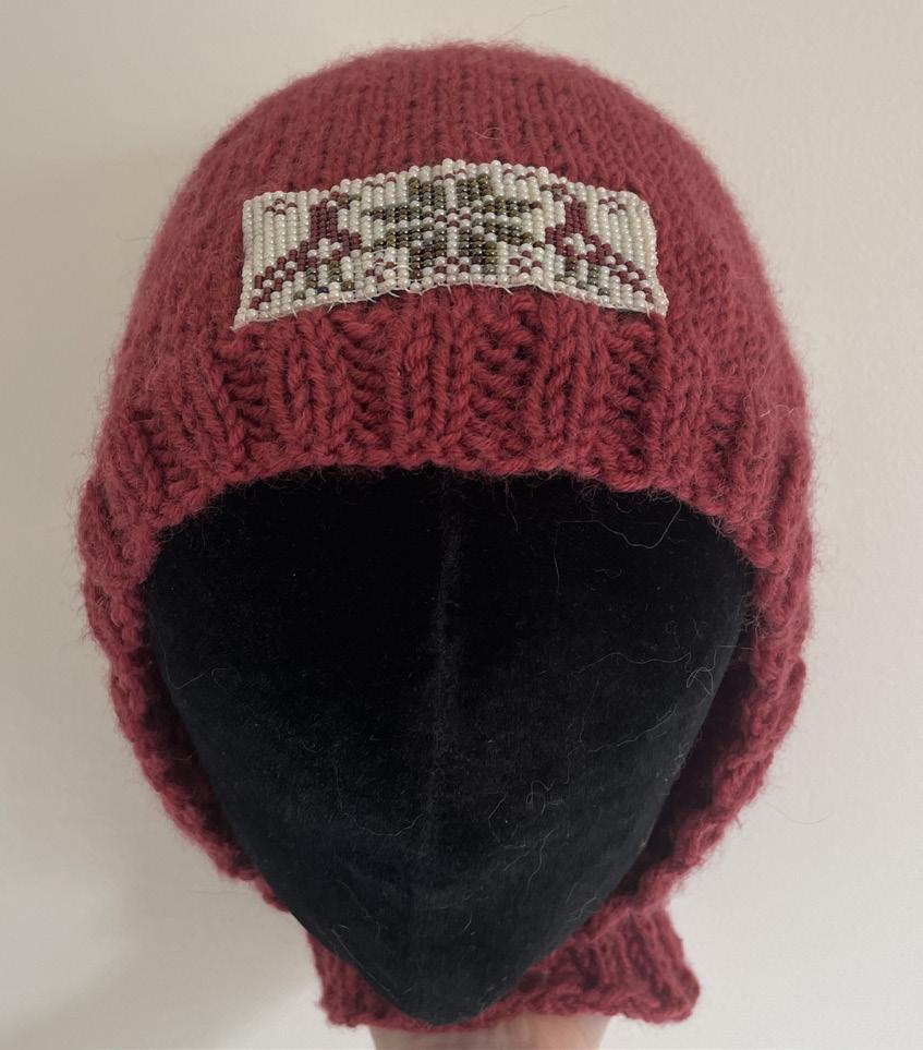 The idea for this exhibition came after the start of the active conflict between Russia and Ukraine in February of 2022. I wasn’t as knowledgeable about Ukrainian culture as I felt I should be, so I turned to learning traditional art forms as a way to connect. While learning these traditions is important, I didn’t simply want to copy pre-existing designs. This is where the idea of modernizing traditional techniques came from. I took traditional techniques and clothing such as the beaded Babushka scarf and turned it into a knit balaclava with beaded panels. This piece contains important elements of the scarf while being a modern and “socially acceptable” piece of clothing.