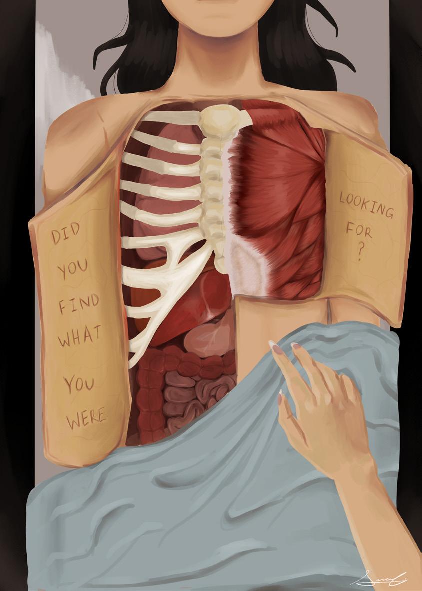 All my pieces revolve around the body. As my works revolve around development and growth through emotions and experiences, it was fitting that I presented that through the body. Throughout my pieces, the body has been distorted anatomically by revealing visceral, exaggerating proportions, and creating displays of vulnerability. The exhibition is formatted like a “dissection”. The concept behind the first pieces are relatively simple, problems I’ve experienced that are visible to anyone who looks. It is like the skin. As the exhibition progresses, the concepts of my pieces become more complex the deeper. These pieces are like the muscles and guts of the exhibition “Dissection”.