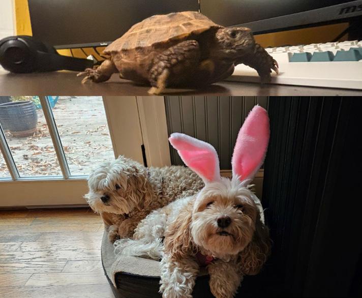 TORTOISE VS THE DOGS • Nate Mitchell’s three pets: Stella the tortoise, along with Honey and Pippin the cockapoos. PHOTO: NATE MITCHELL