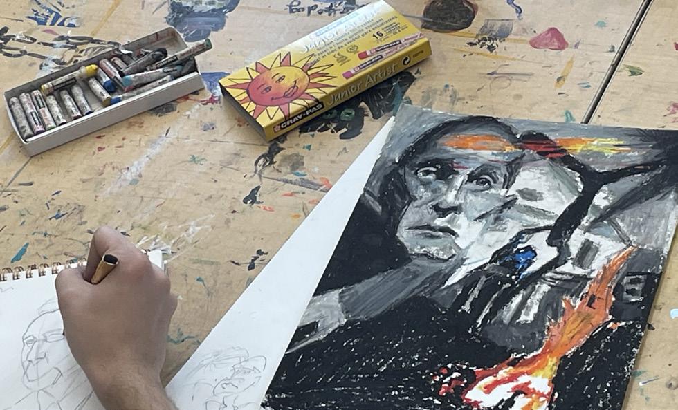 BOTTOM: Fletcher Noto (12) works on several pieces scattered across his desk, in different mediums like oil pastel and pencil. “Most people have an idea of what they want to do, but I think it’s all pretty loose right now, because it’s a year-long course,” Noto said.