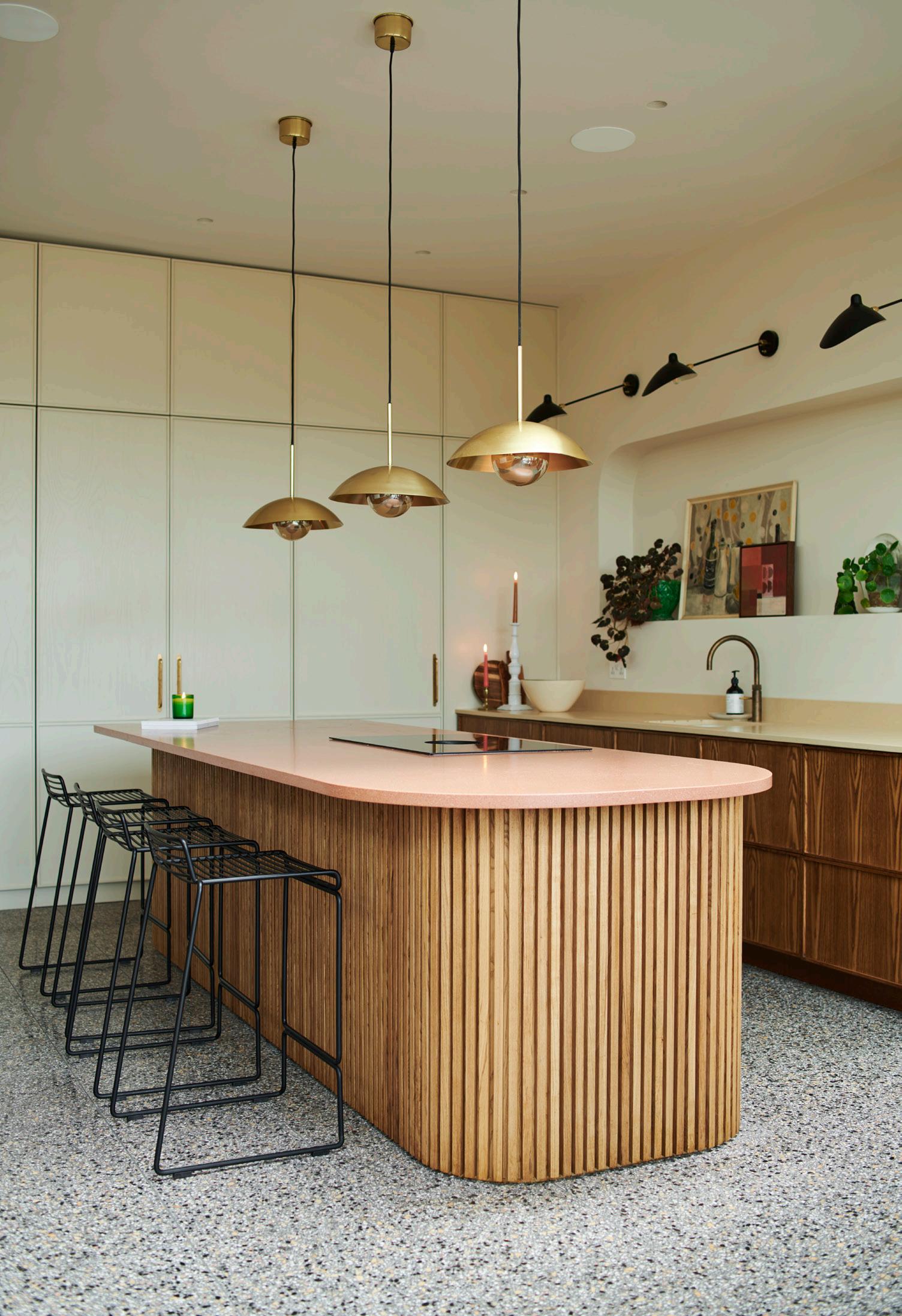 Here, three eye-catching pendant lights illuminate the cooking area when on full and, when dimmed, create a more sophisticated scene for evening entertaining. While three equally striking wall lights cast a glow over the sink and prep space.